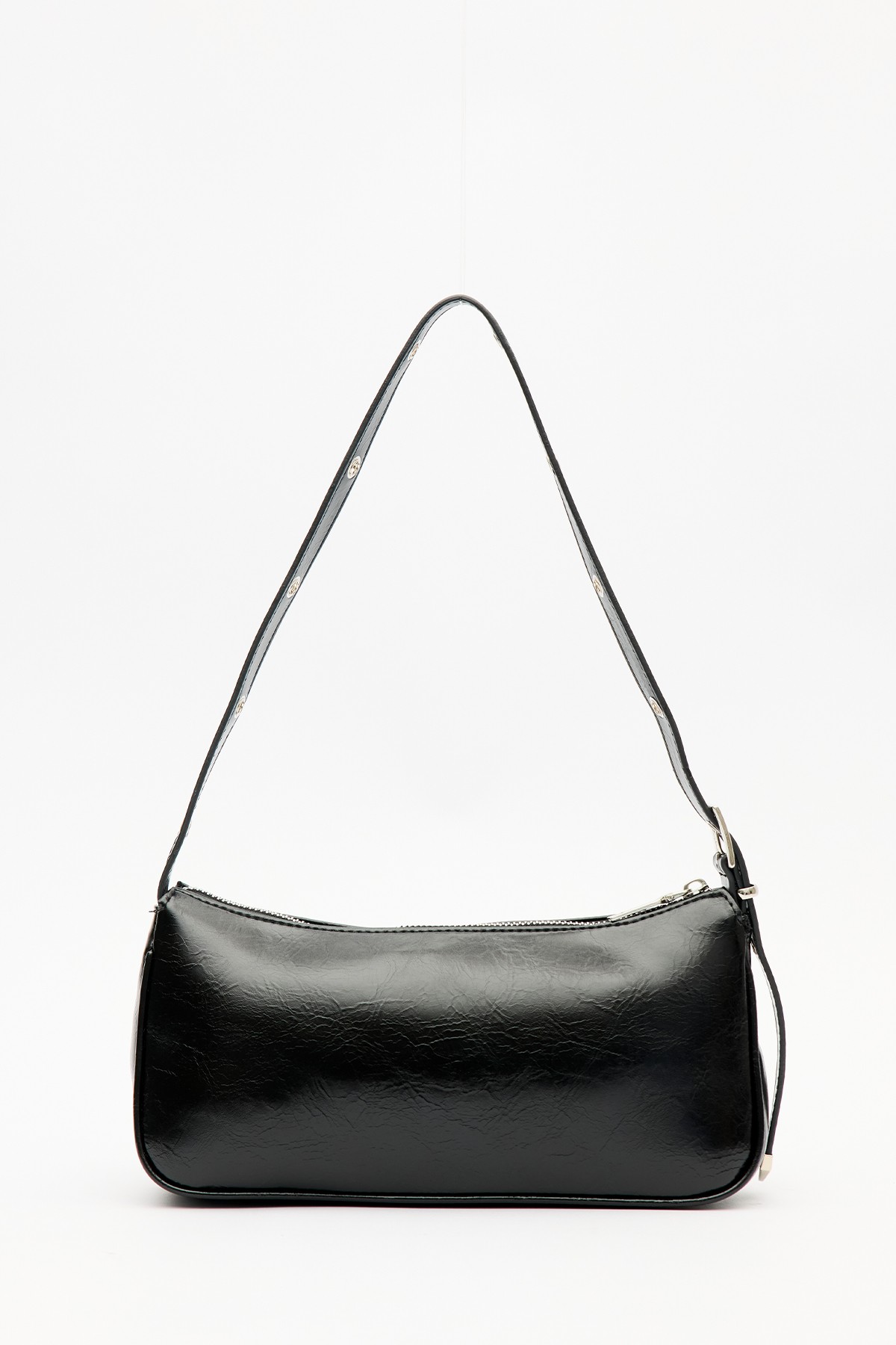 Small pocket detail, eyelet and buckle strap, zip closure, faux leather, lined.