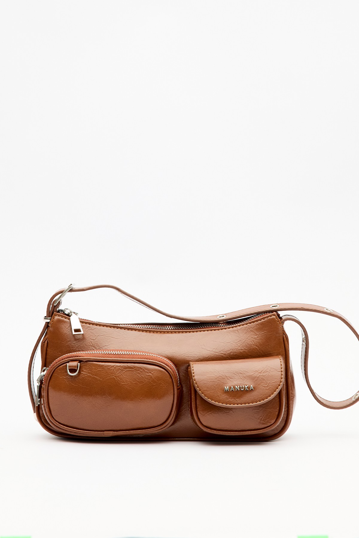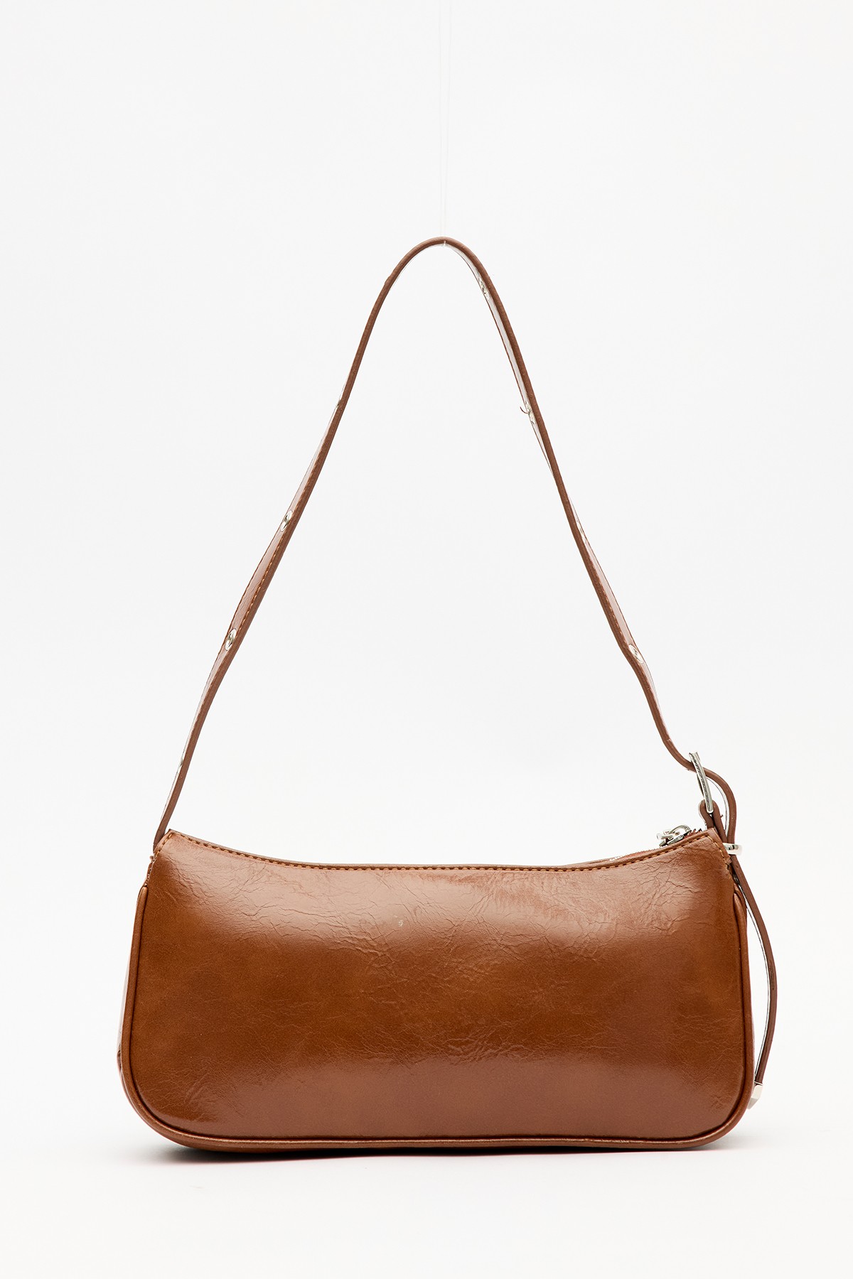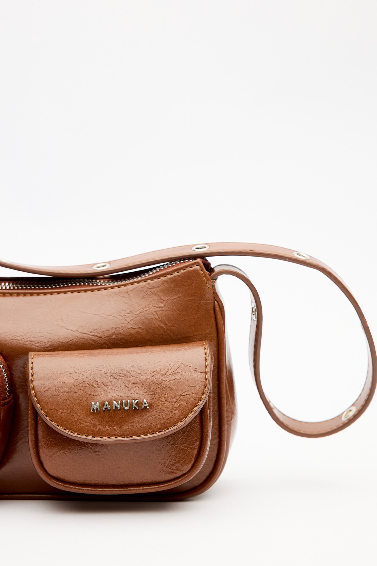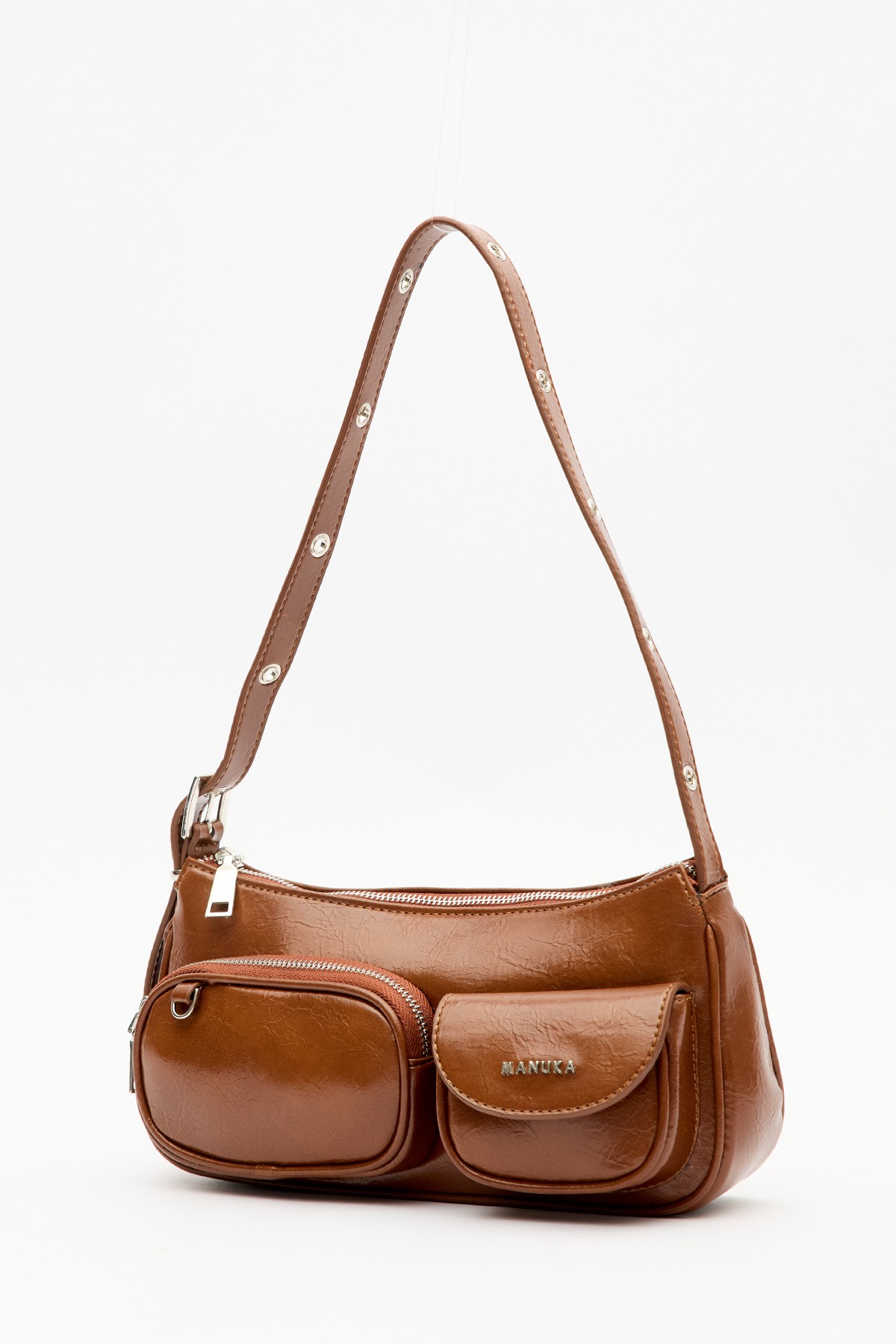 Small pocket detail, eyelet and buckle strap, zip closure, faux leather, lined.