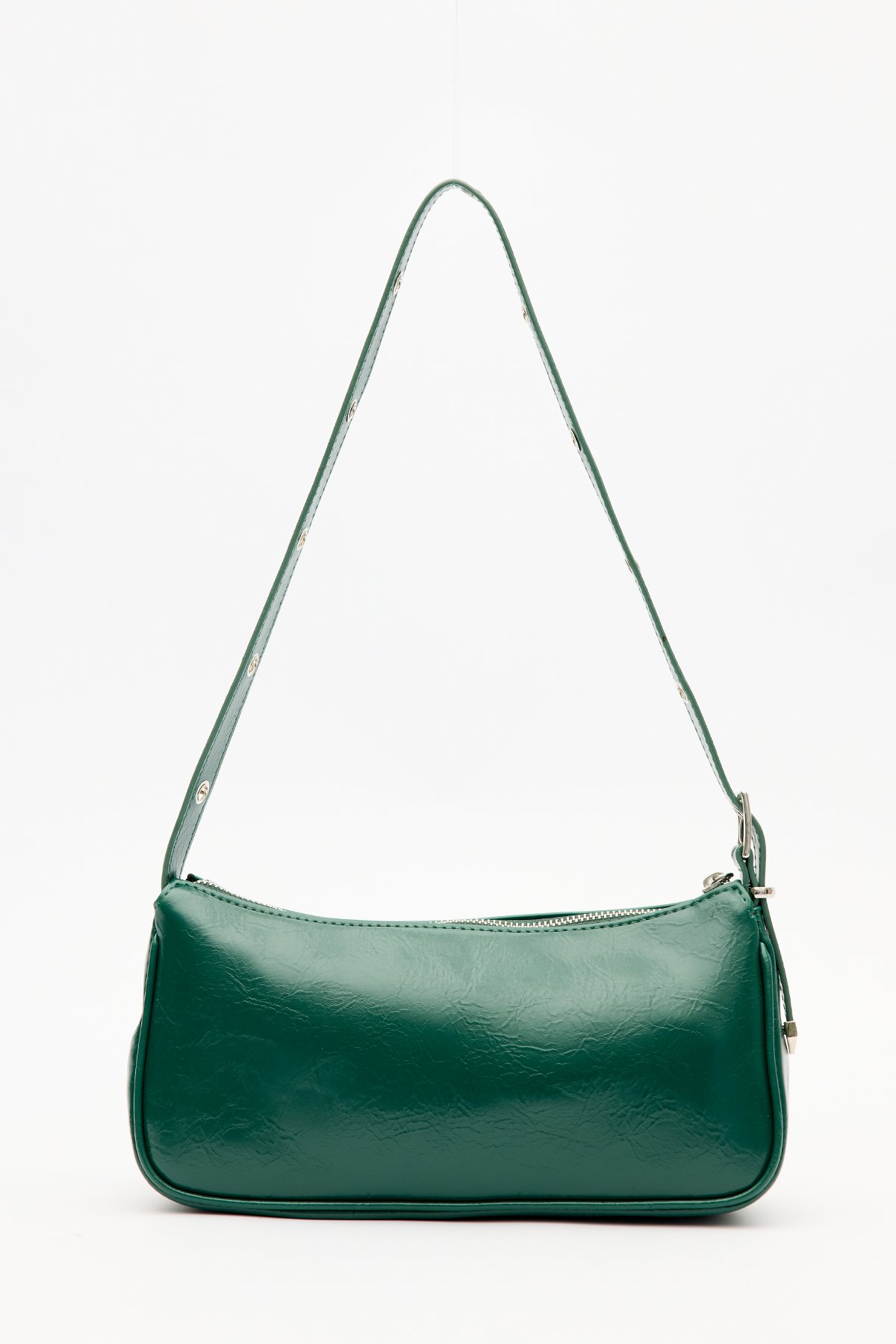 Small pocket detail, eyelet and buckle strap, zip closure, faux leather, lined.