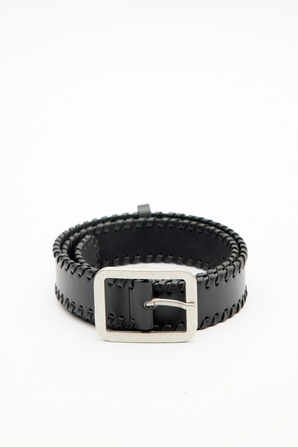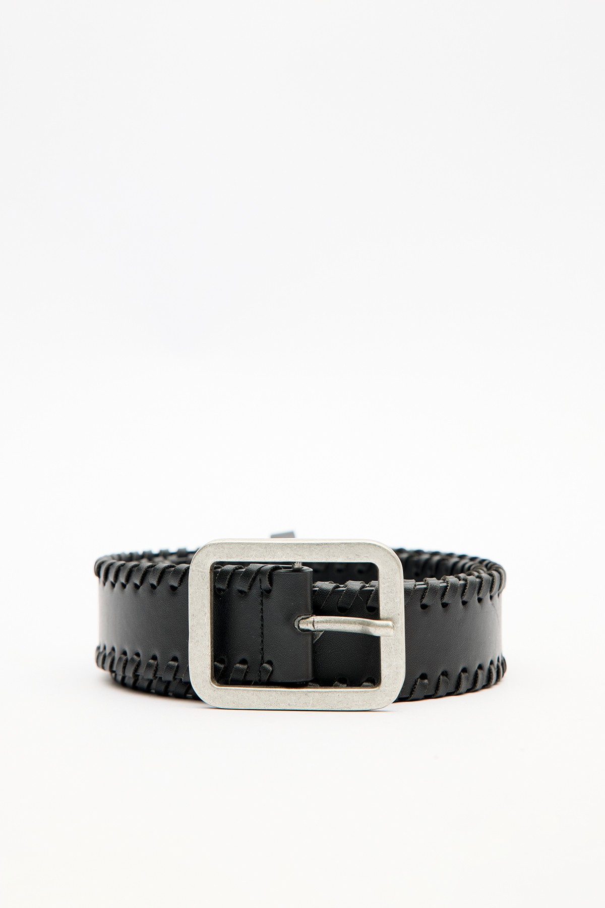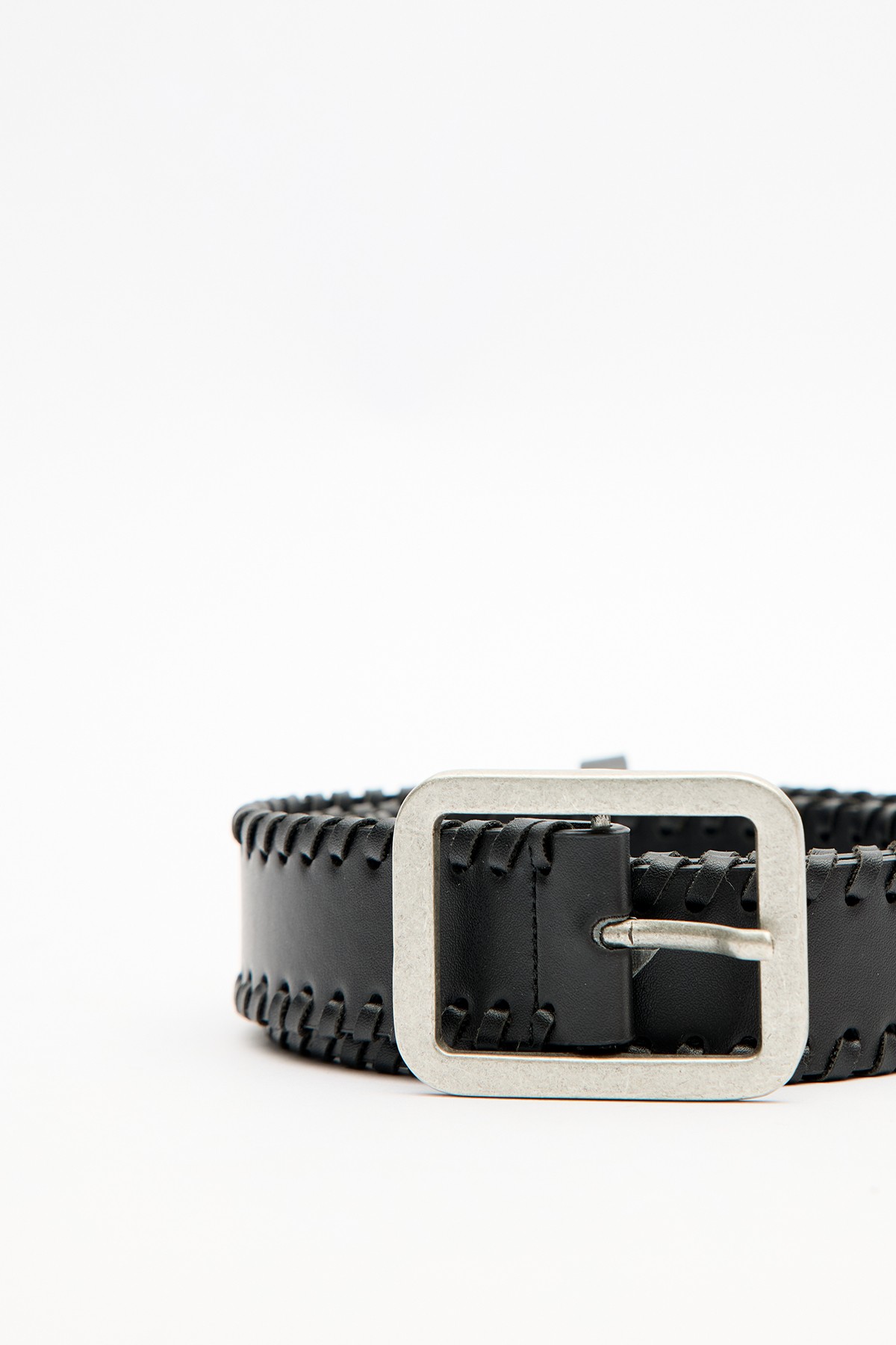 Square antique nickel-plated buckle, braided detail, faux leather. Main Fabric: 30% Polyurethane, 60% Polyester, 10% Polyvinyl Chloride Do not wash Do not bleach Do not iron Do not dry clean Do not tumble dry.