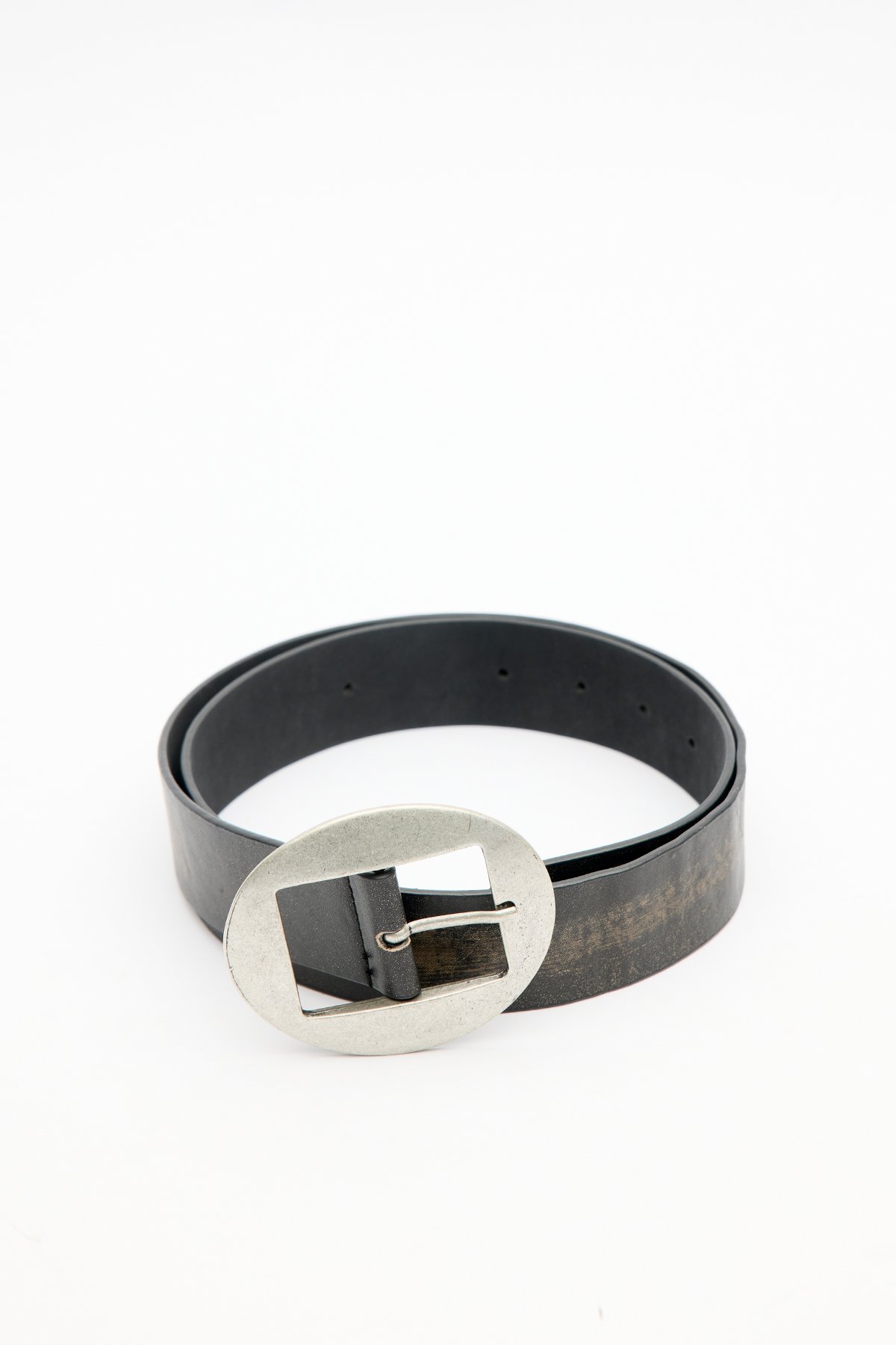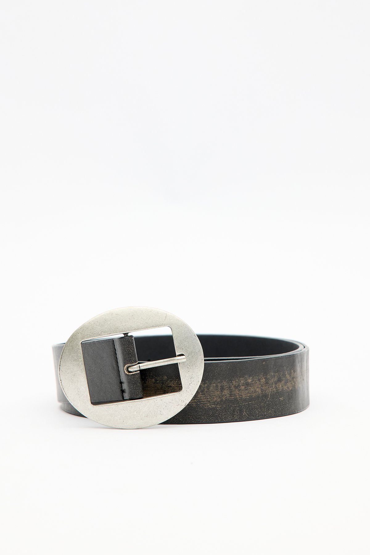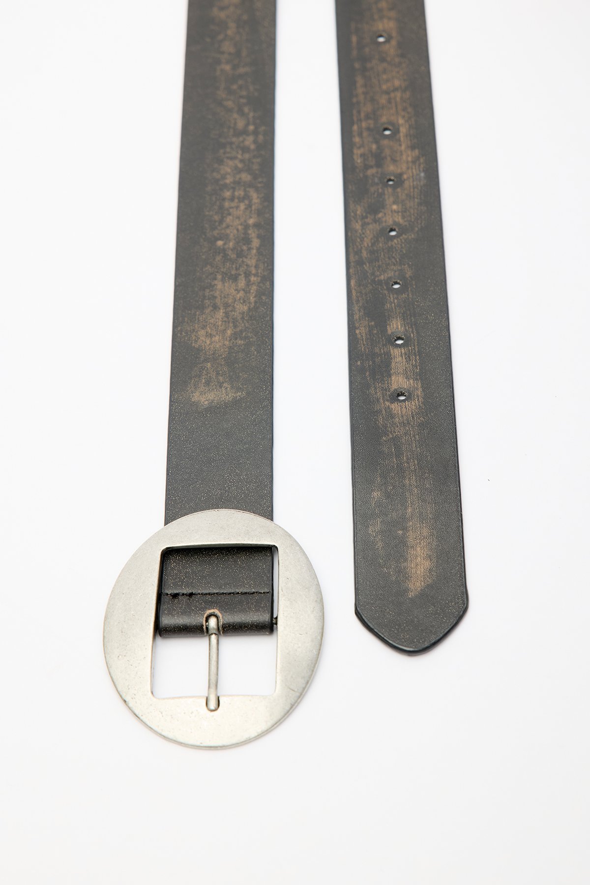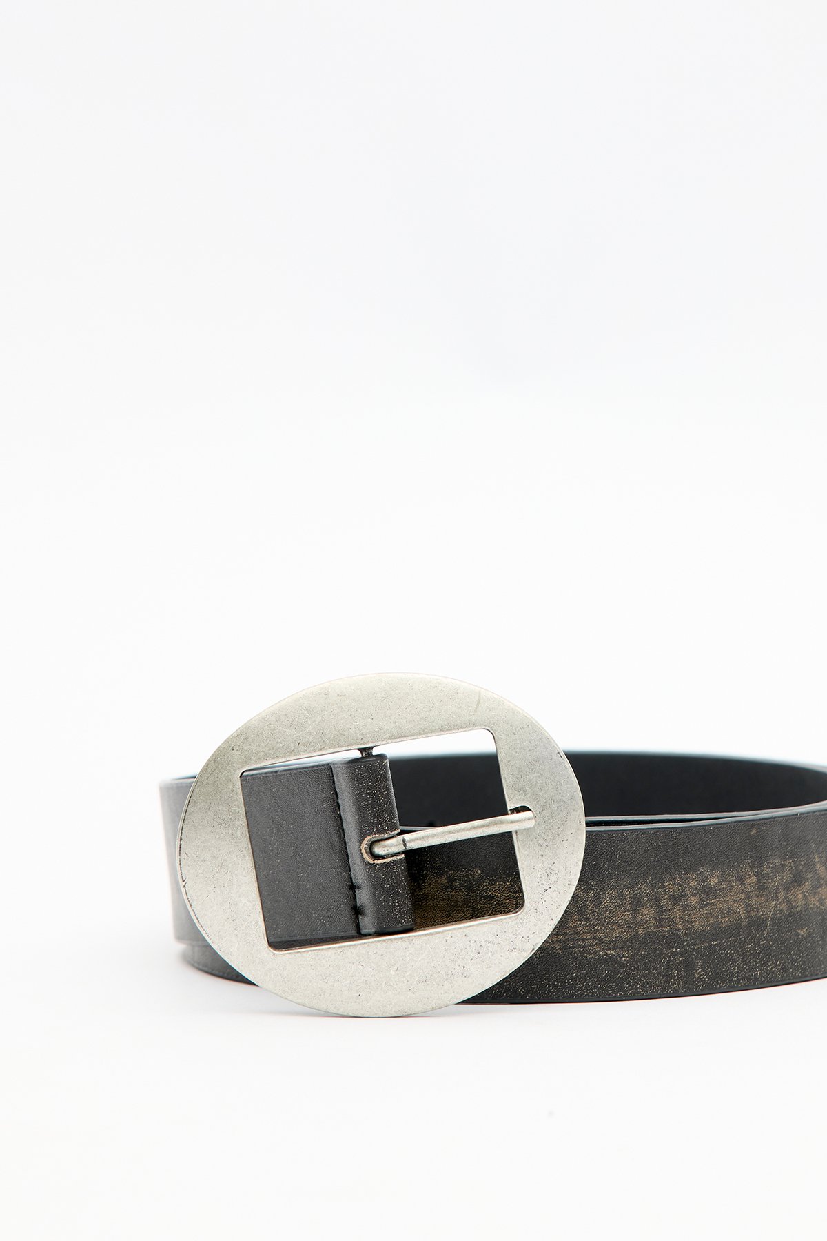 Oval antique nickel-plated buckle belt, adjustable distressed faux leather. Main Fabric: 30% Polyurethane, 60% Polyester, 10% Polyvinyl Chloride Do not wash Do not bleach Do not iron Do not dry clean Do not tumble dry.