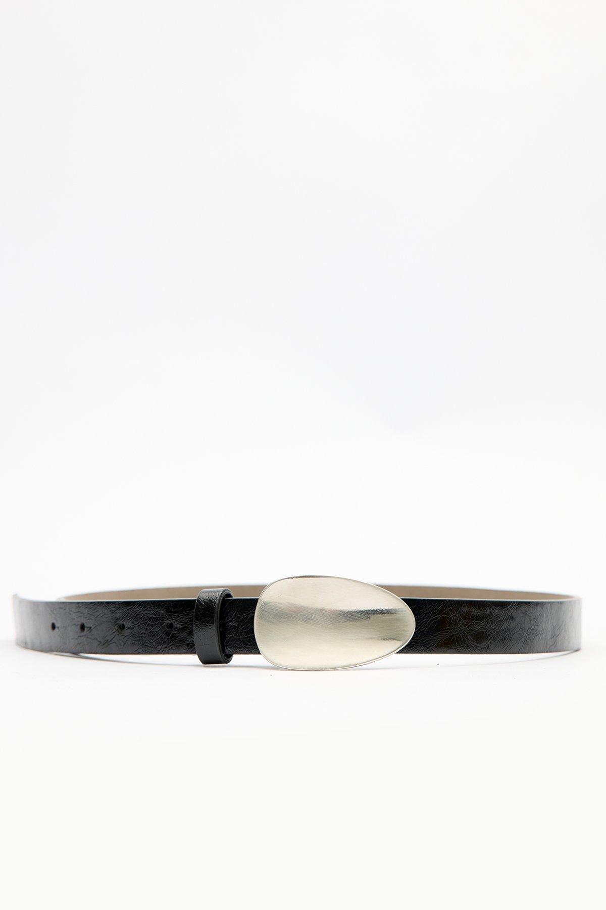 Oval nickel-plated buckle belt, faux leather. Main Fabric: 30% Polyurethane, 60% Polyester, 10% Polyvinyl Chloride Do not wash Do not bleach Do not iron Do not dry clean Do not tumble dry.