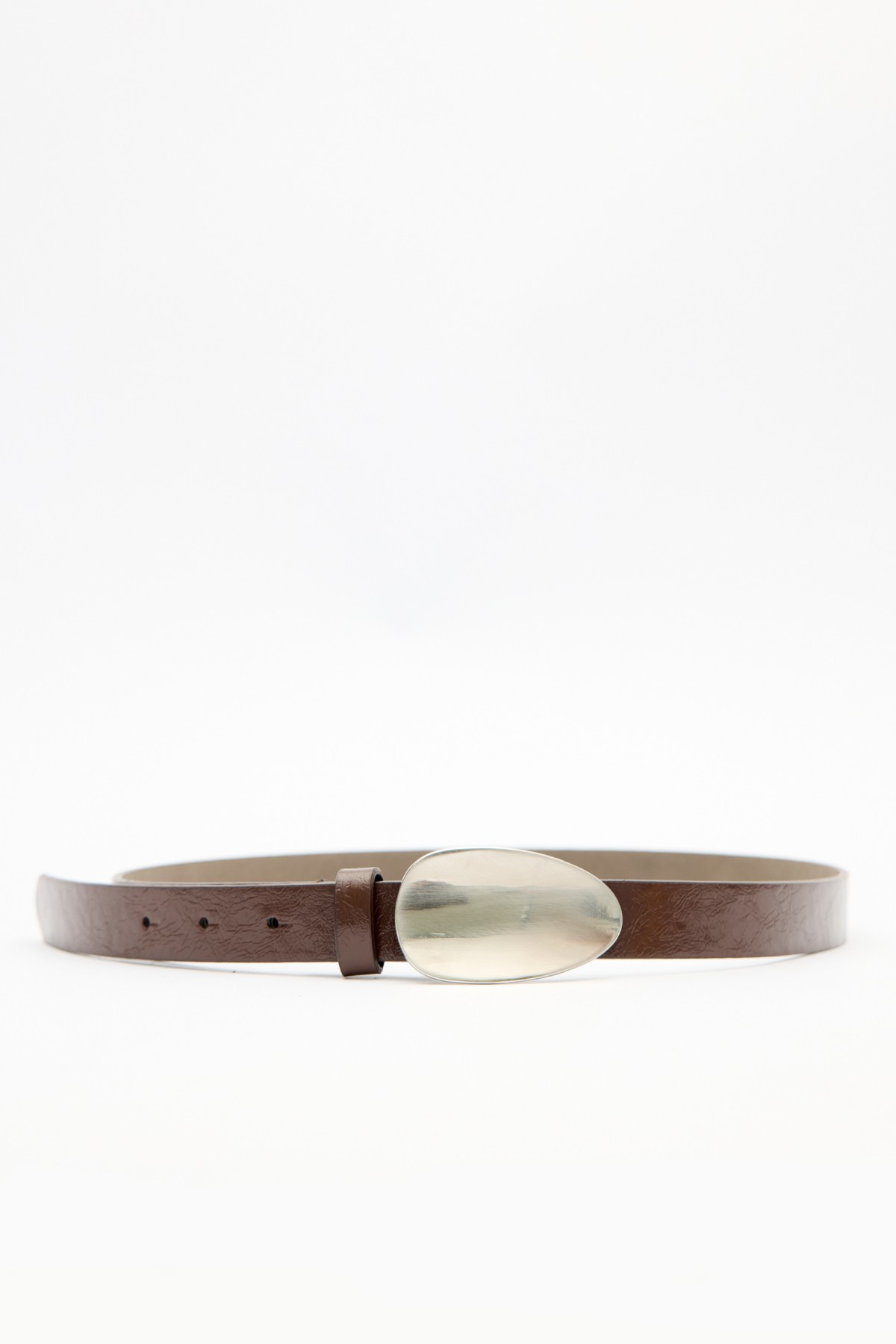 Oval nickel-plated buckle belt, faux leather. Main Fabric: 30% Polyurethane, 60% Polyester, 10% Polyvinyl Chloride Do not wash Do not bleach Do not iron Do not dry clean Do not tumble dry.