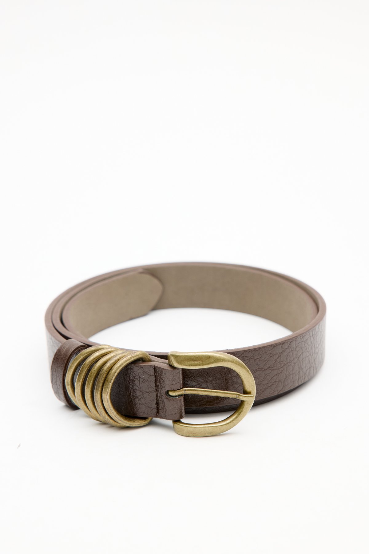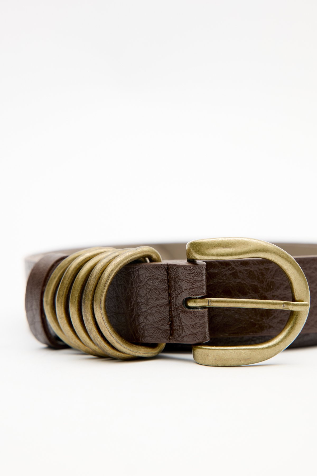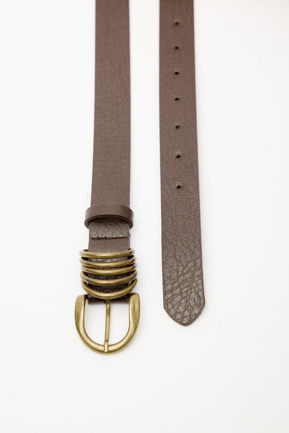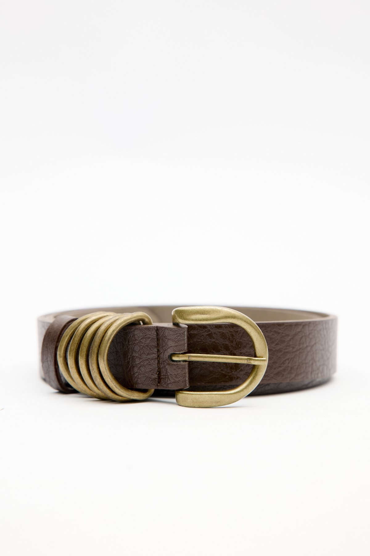 Antique-finished metal prong buckle belt, faux leather. Coating: 7% Polyurethane, 14% Polyester, 79% Polyvinyl Chloride Base: 30% Polyurethane, 60% Polyester, 10% Polyvinyl Chloride Do not wash Do not bleach Do not iron Do not dry clean Do not tumble dry.