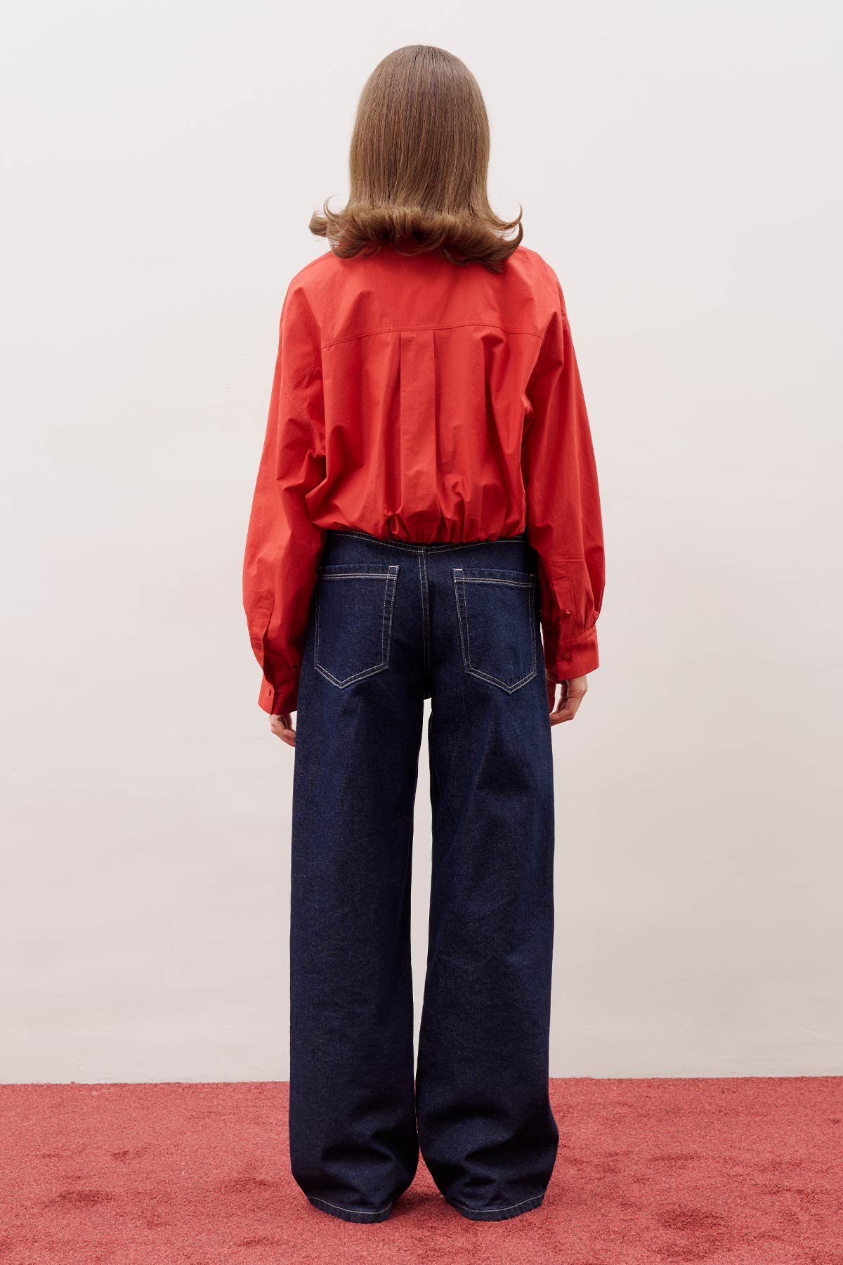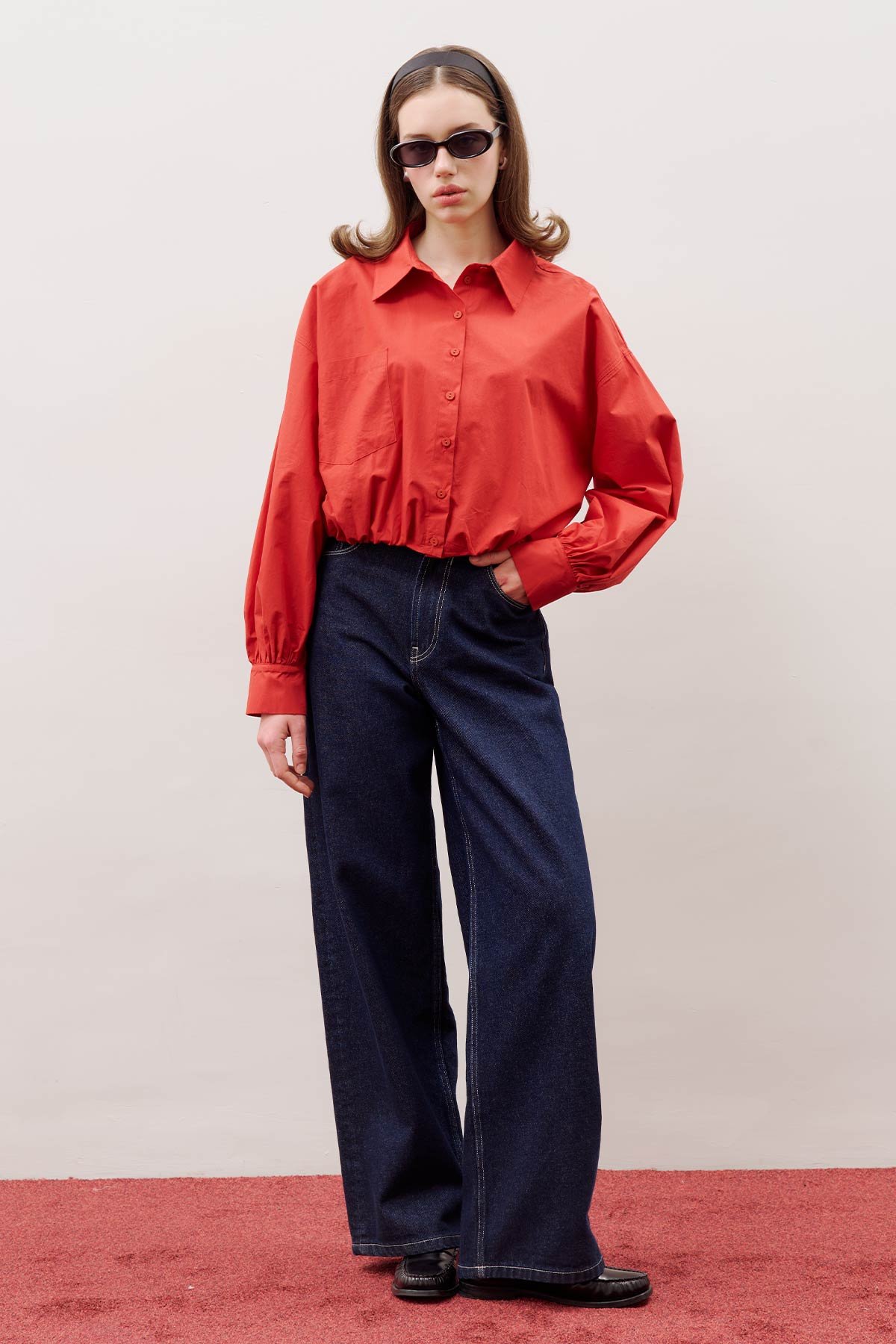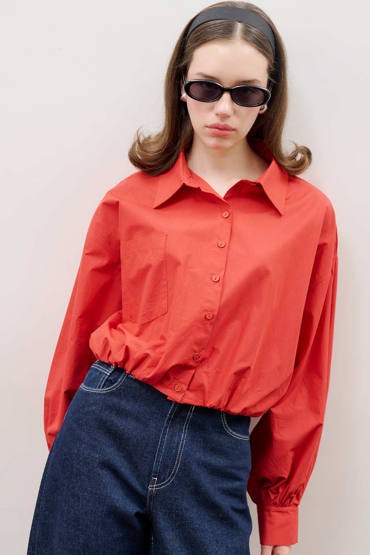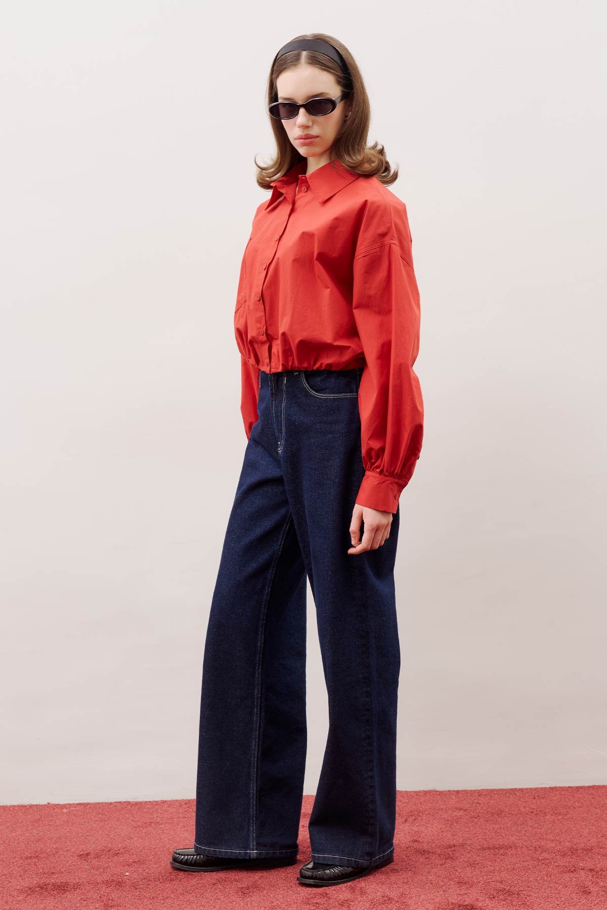 Shirt collar, long sleeves, crop length, button closure, regular fit.