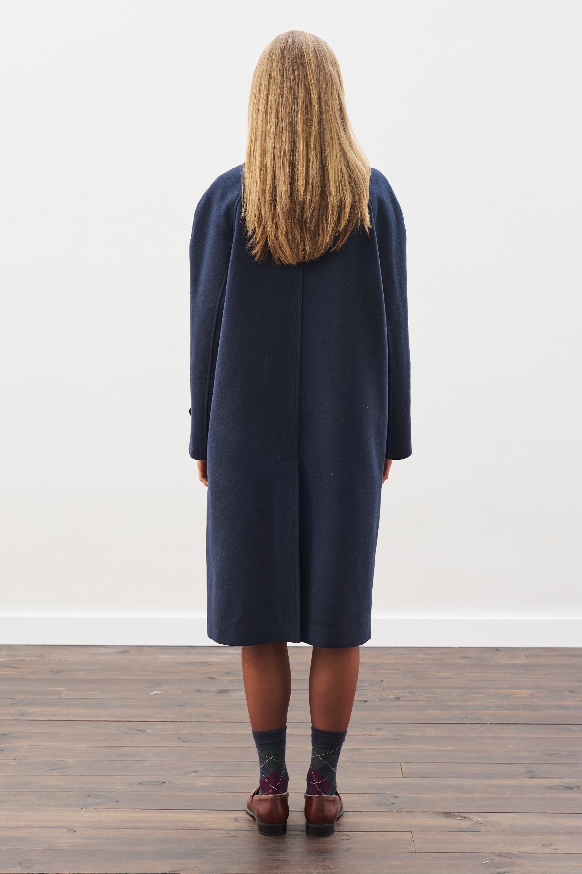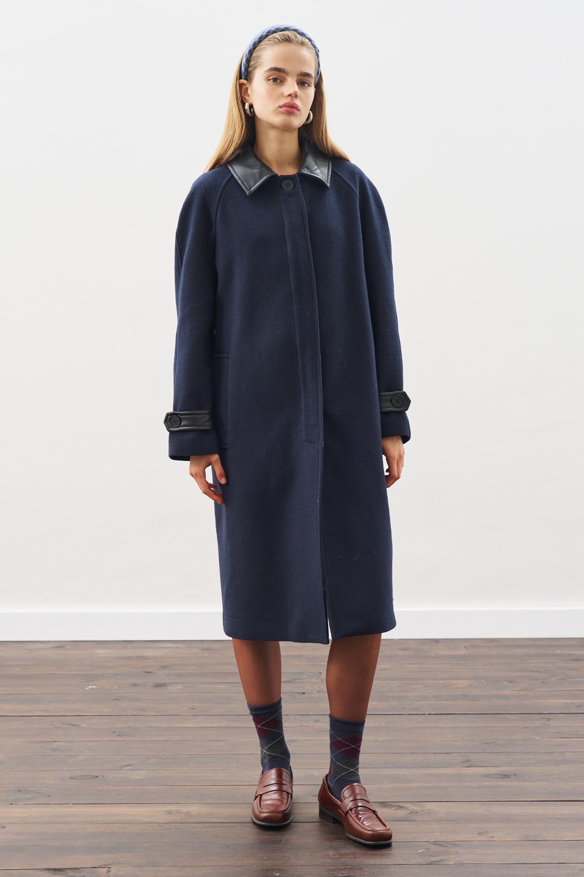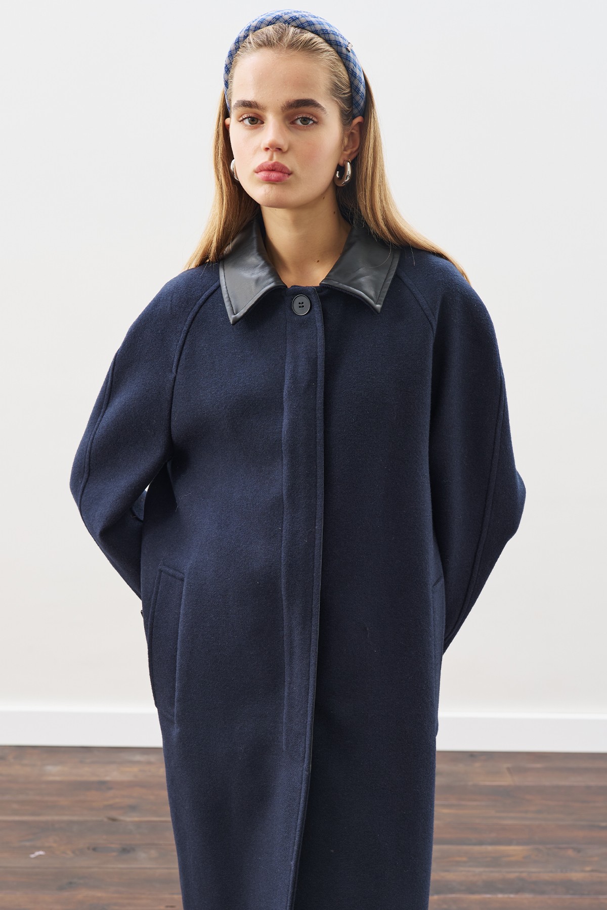LEATHER DETAIL WOOL COAT NAVY FEATURES