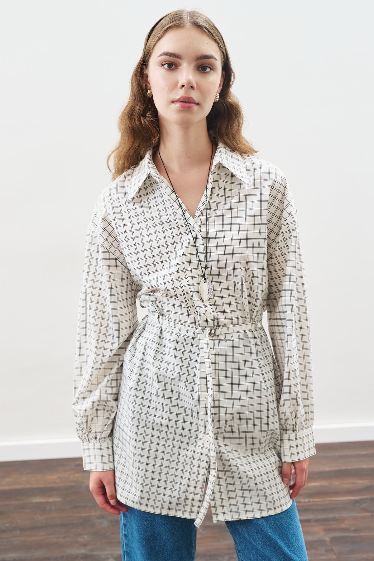 Gömlek yakalı, düğme kapamalı, arka yakada büzgü detaylı, düşük omuz, uzun kol, manşetli, tokalı kendi kumaşından kuşak detaylı, tunik boy.Ana Kumaş: %65 Polyester, %35 Pamuk