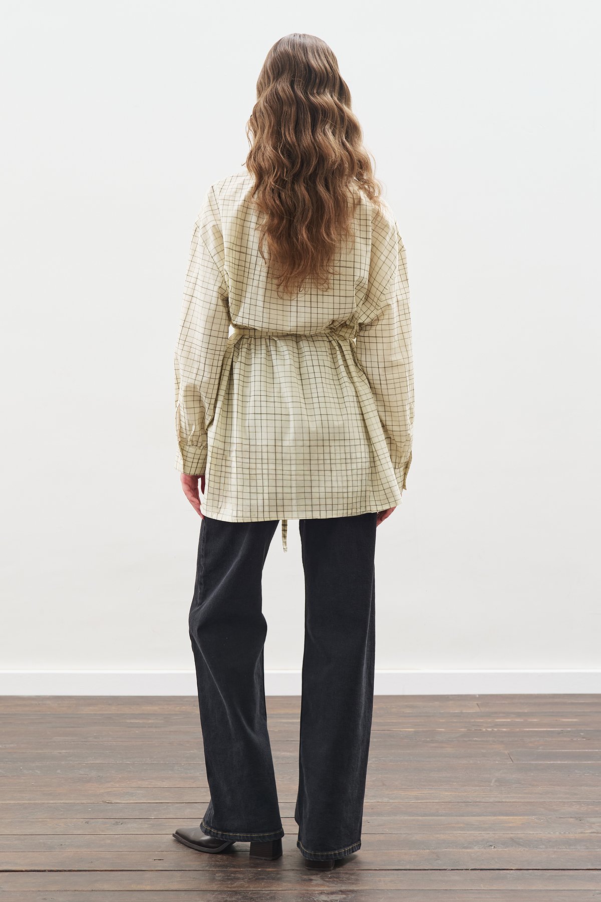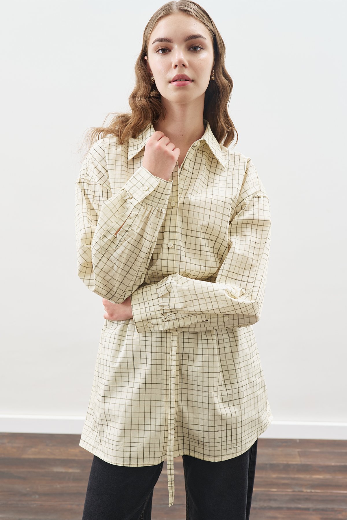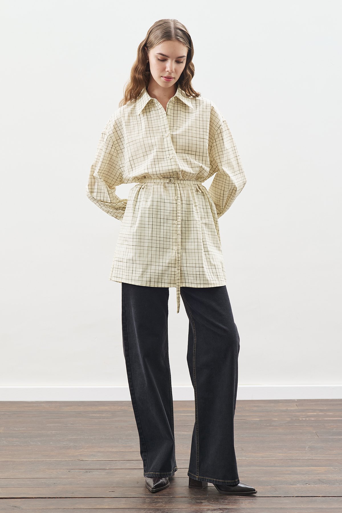 Gömlek yakalı, düğme kapamalı, arka yakada büzgü detaylı, düşük omuz, uzun kol, manşetli, tokalı kendi kumaşından kuşak detaylı, tunik boy.Ana Kumaş: %65 Polyester, %35 Pamuk