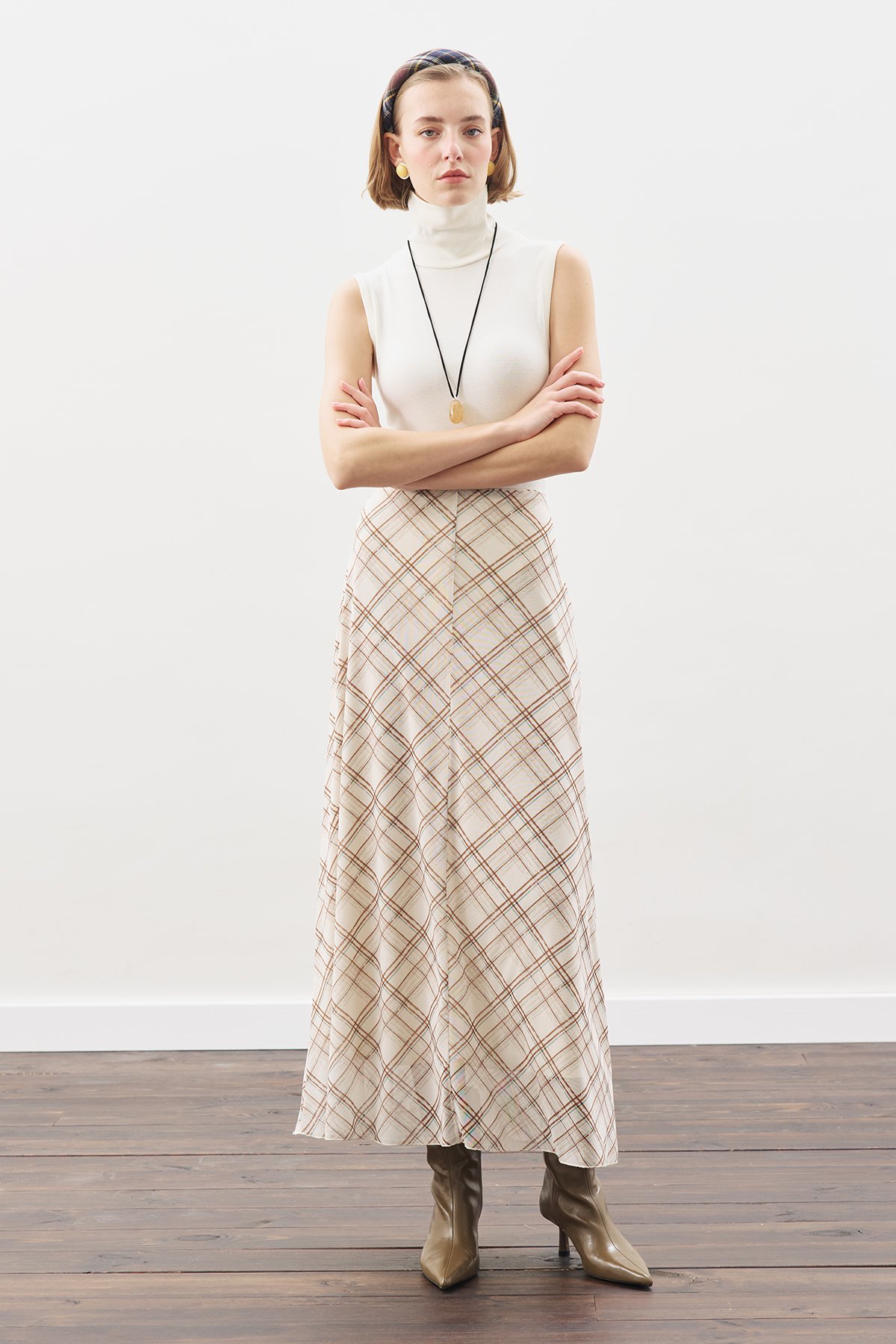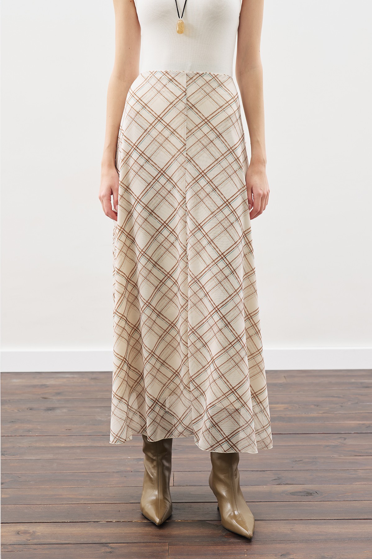 Ekose desenli, yüksek bel,tam boy,fermuarlı, çan formlu.Ana Kumaş %97 Polyester,%3 Elastan