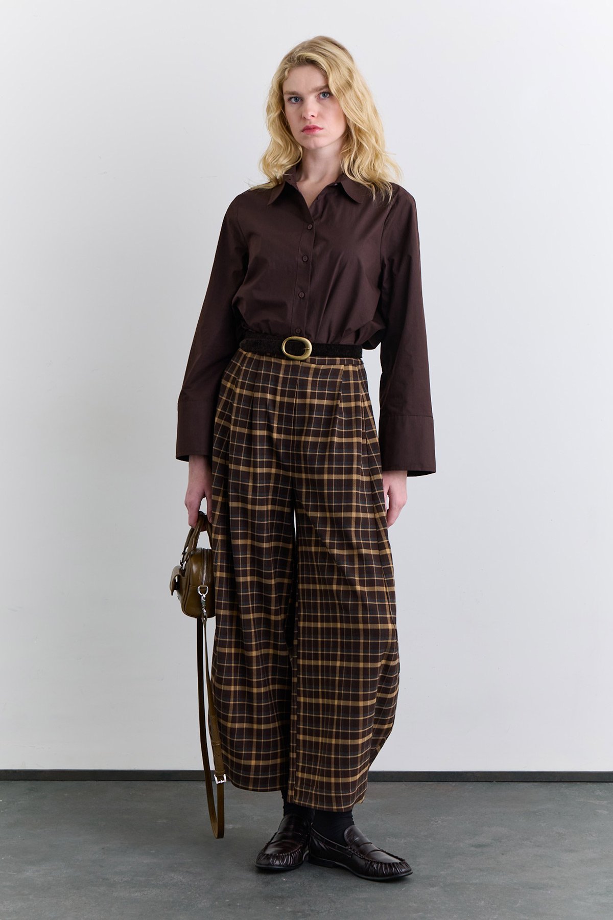Balon form, rahat kalıp, yüksek bel, geniş balon formlu, bilek boy. Dokuma.