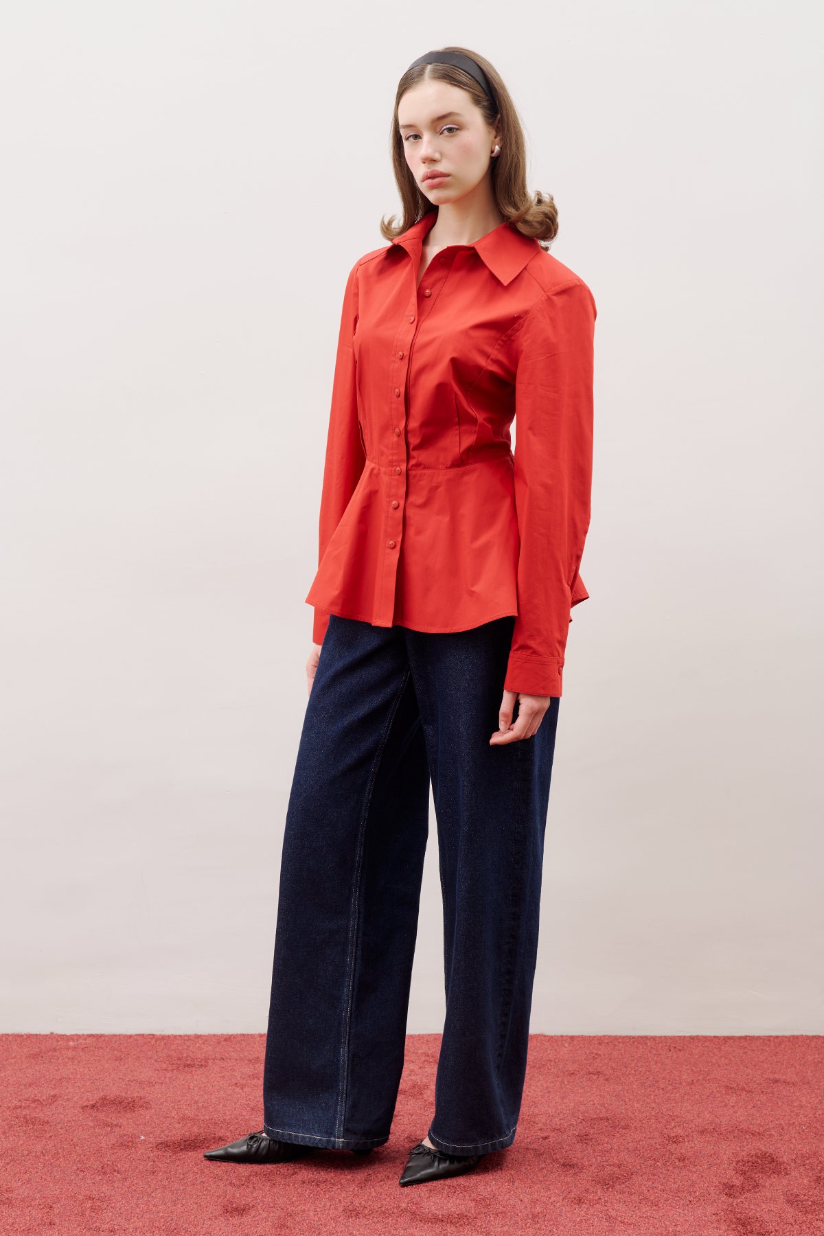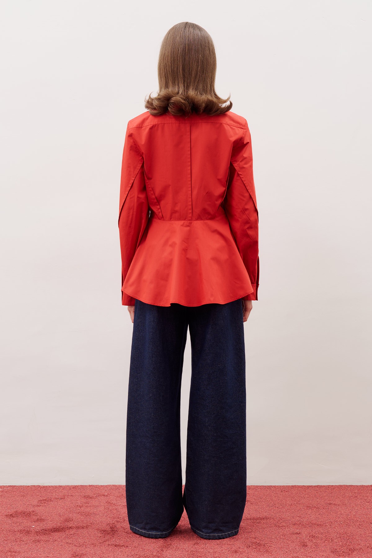Fit kalıp, gömlek yakalı, uzun geniş kol form, pileli, kolucu bağlama detaylı, bilek boy, kruvaze düğme kapamalı.