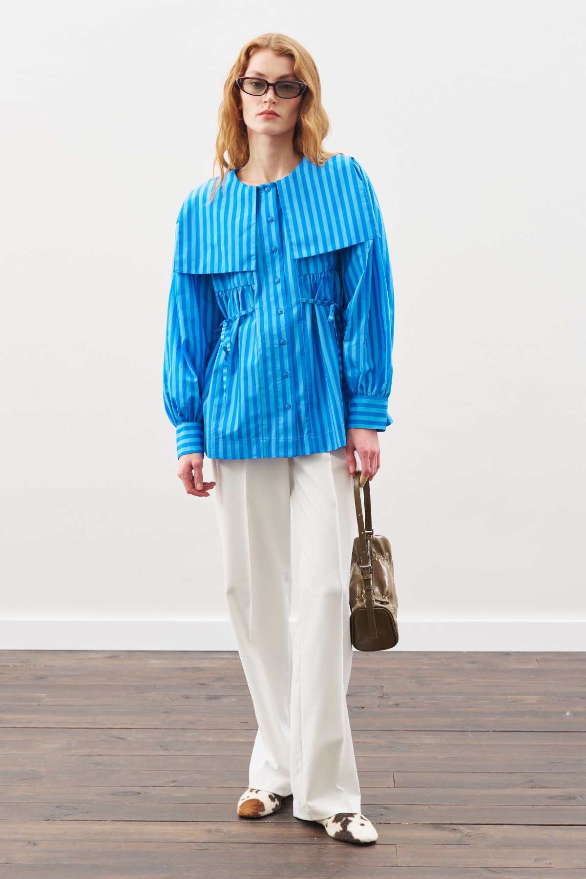 Yuvarlak yakalı, uzun kollu, büzgülü yaka detaylı, ara boy, düğmeli kapamalı, 30 derecede ters çevirerek yıkayınız, normal kalıp, dokuma kumaş.Ana Kumaş %100 Pamuk