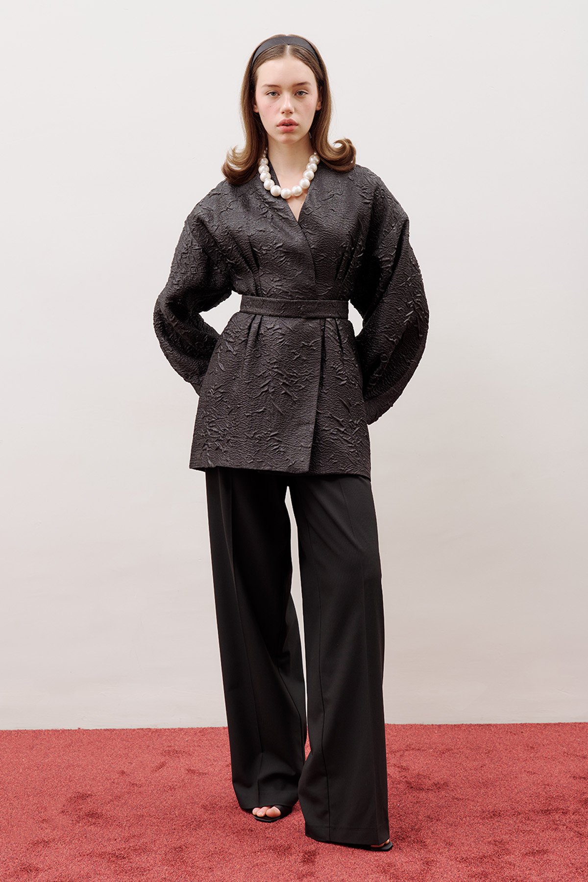 Kruvaze kapamalı, öv ve arkada pens detaylı, balon kol form, uzun kollu, astarlı, iki ayarlamalı kemer detaylı, kendi kumaşından kemer, kemer çıt çıt kapamalı.