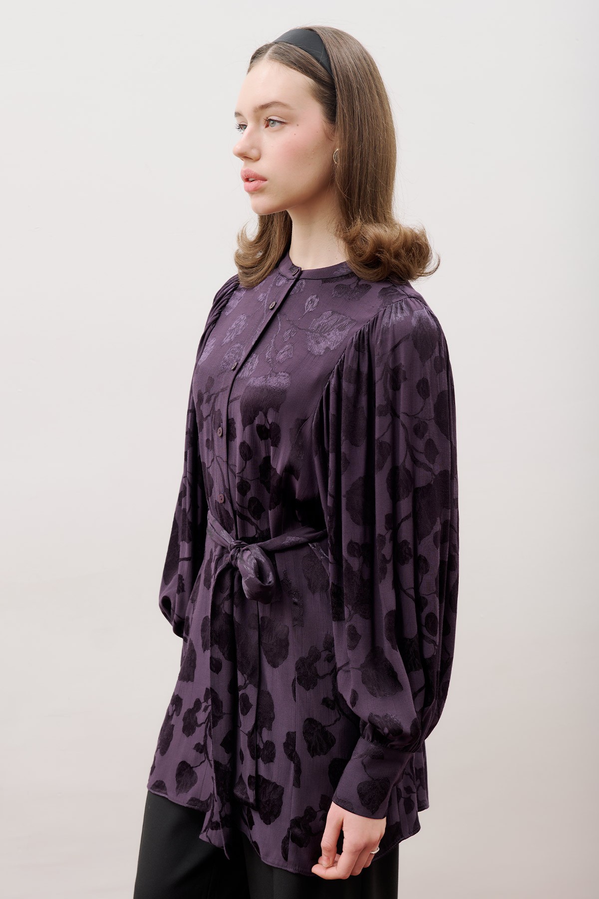 Hakim yakalı, düğme kapamalı, kolda ve robada büzgü detaylı, kol balon form, manşetli,tunik boy, kendi kumaşından kuşak, kuşak yakada veya belde kullanılabilir.