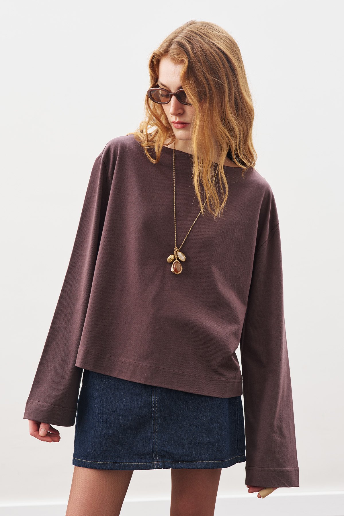KAYIK YAKA UZUN KOL TSHIRT KAHVERENGİ