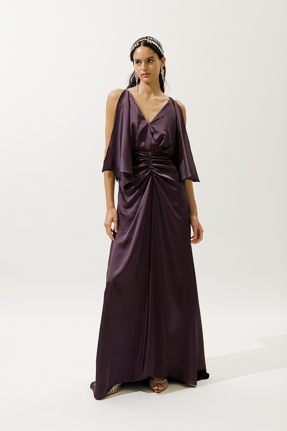 Sleeveless V-neckline, shoulder cape detail, high-low train hem, waist gathering detail, concealed back zipper, pleat detail at back, lined.