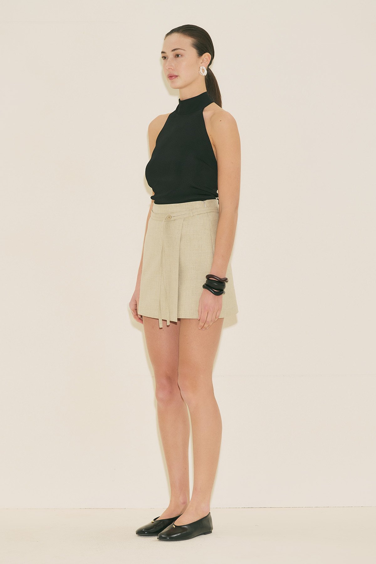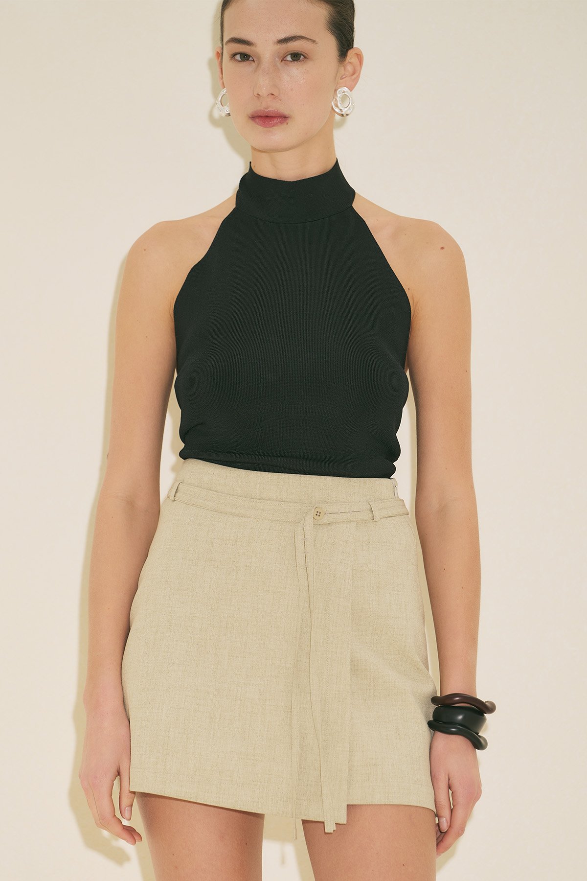 Fit kalıp, mini boy, yüksek bel, fermuar kapamalı, bel kemeri düğme detaylı.