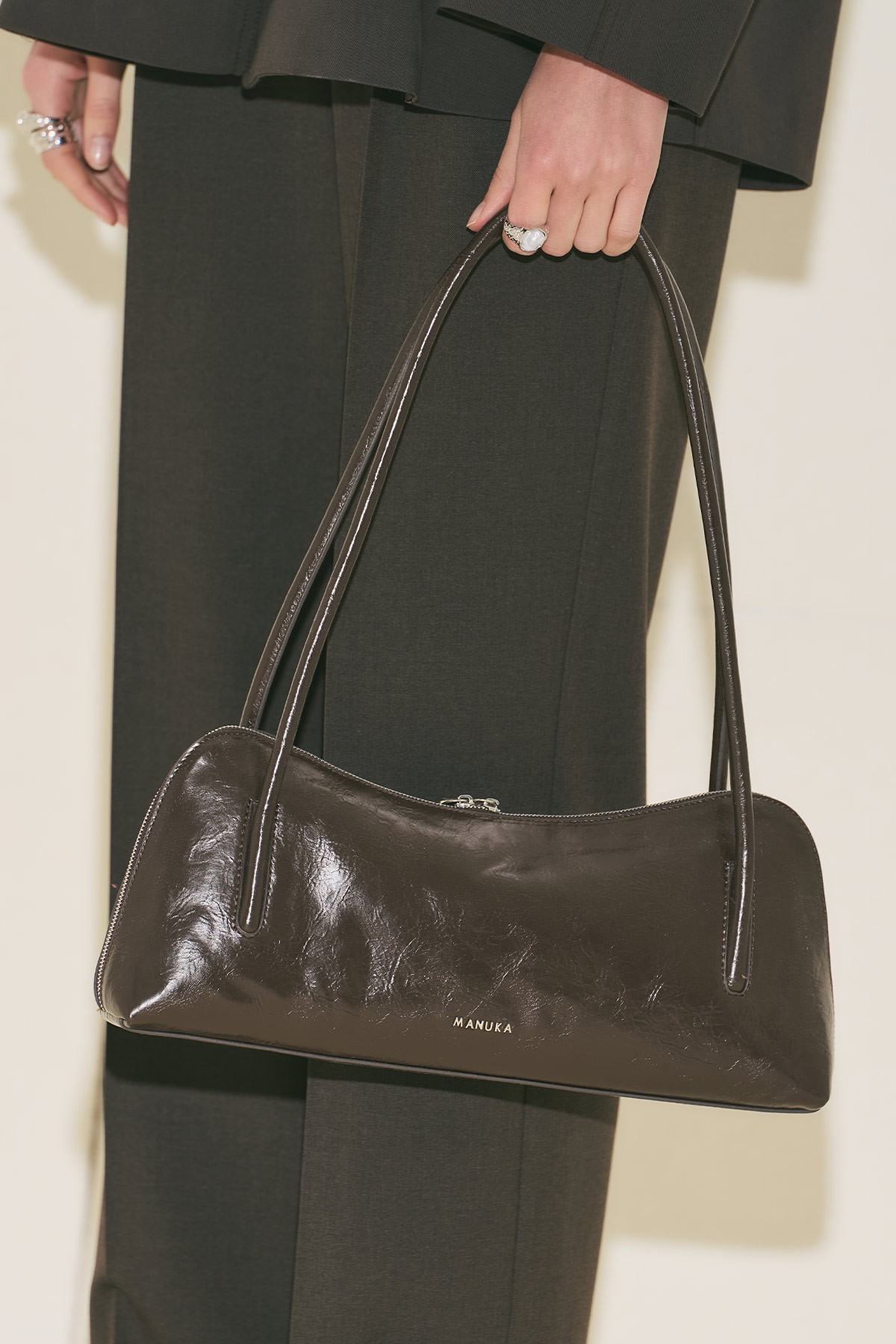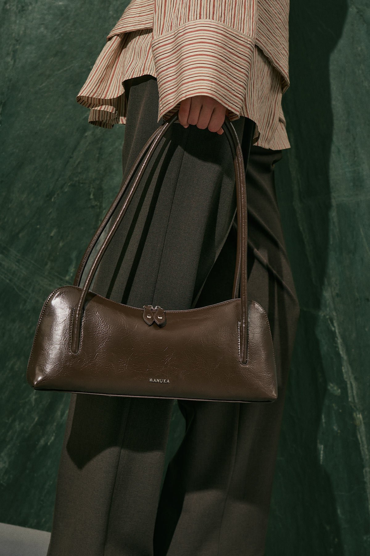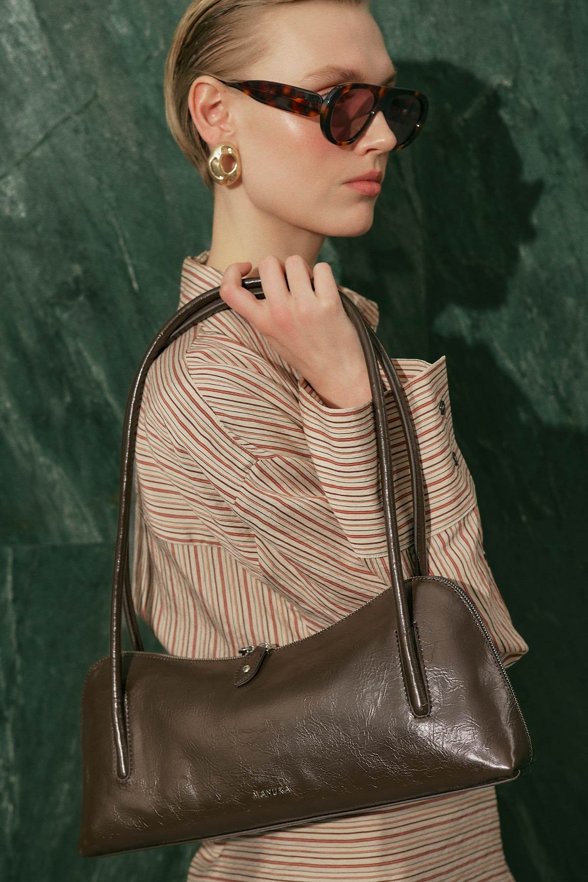 Büyük boy, baget form, manuka logolu, içte cep detaylı, fermuar kapama, suni deri, astarlı.