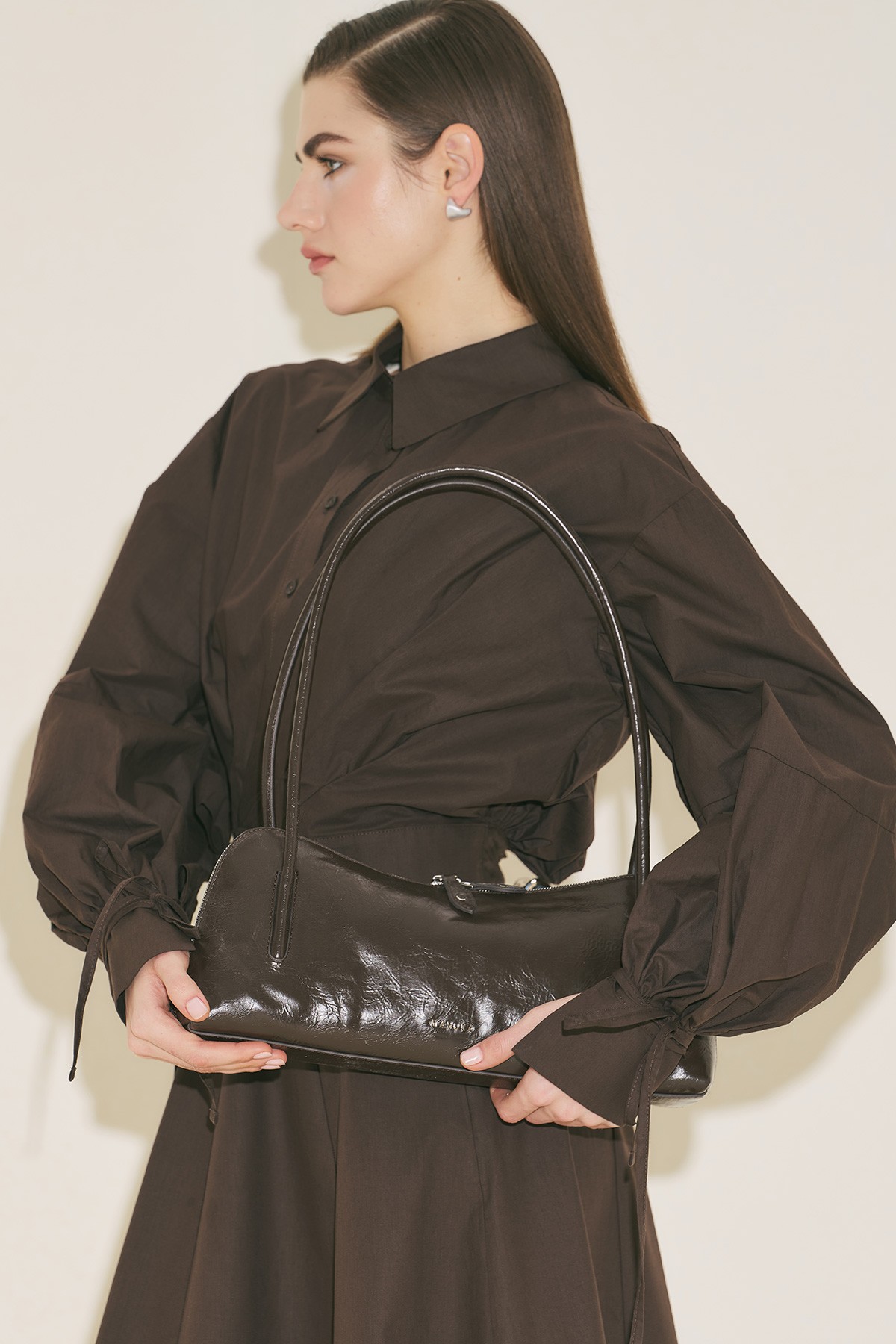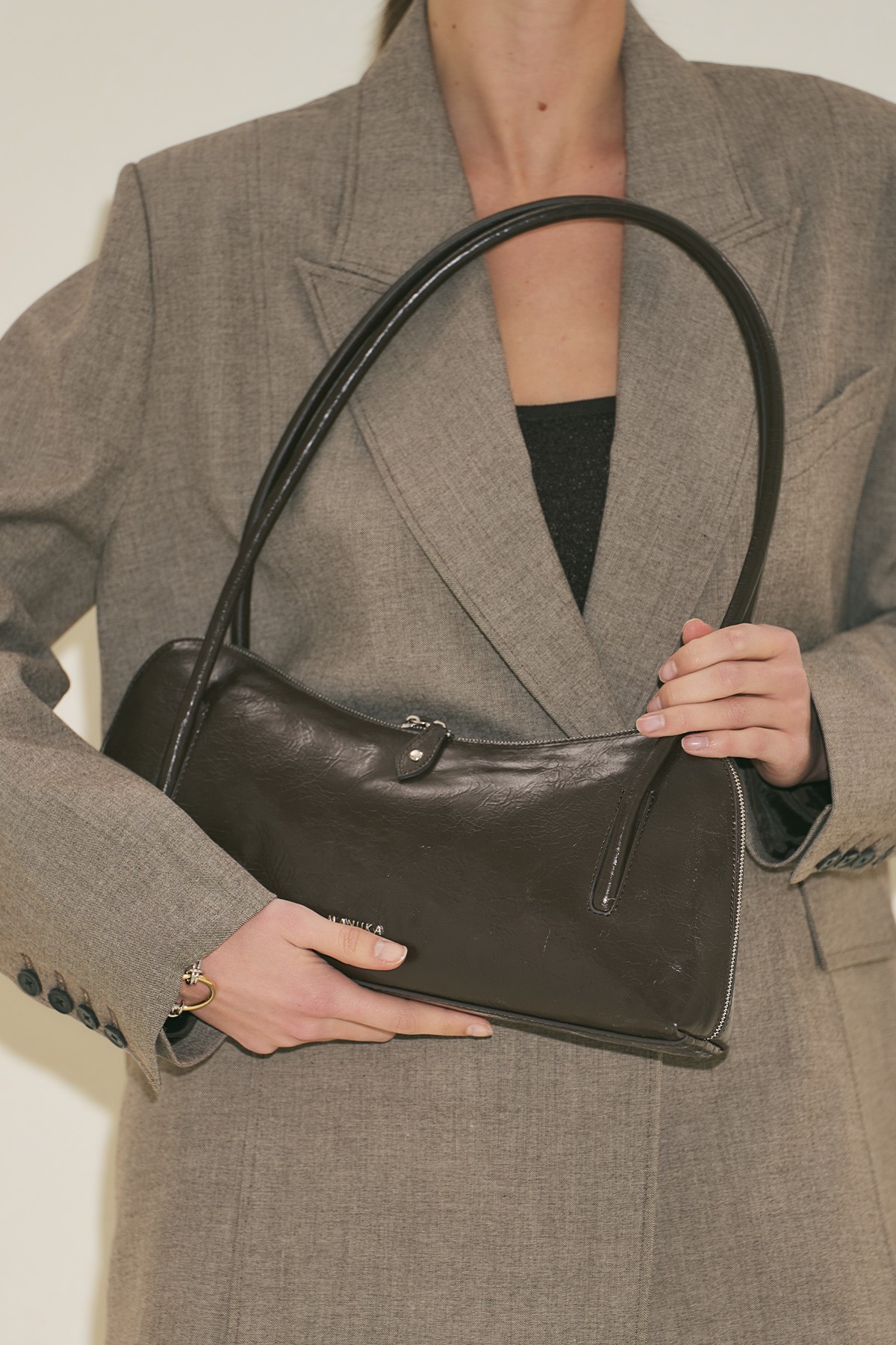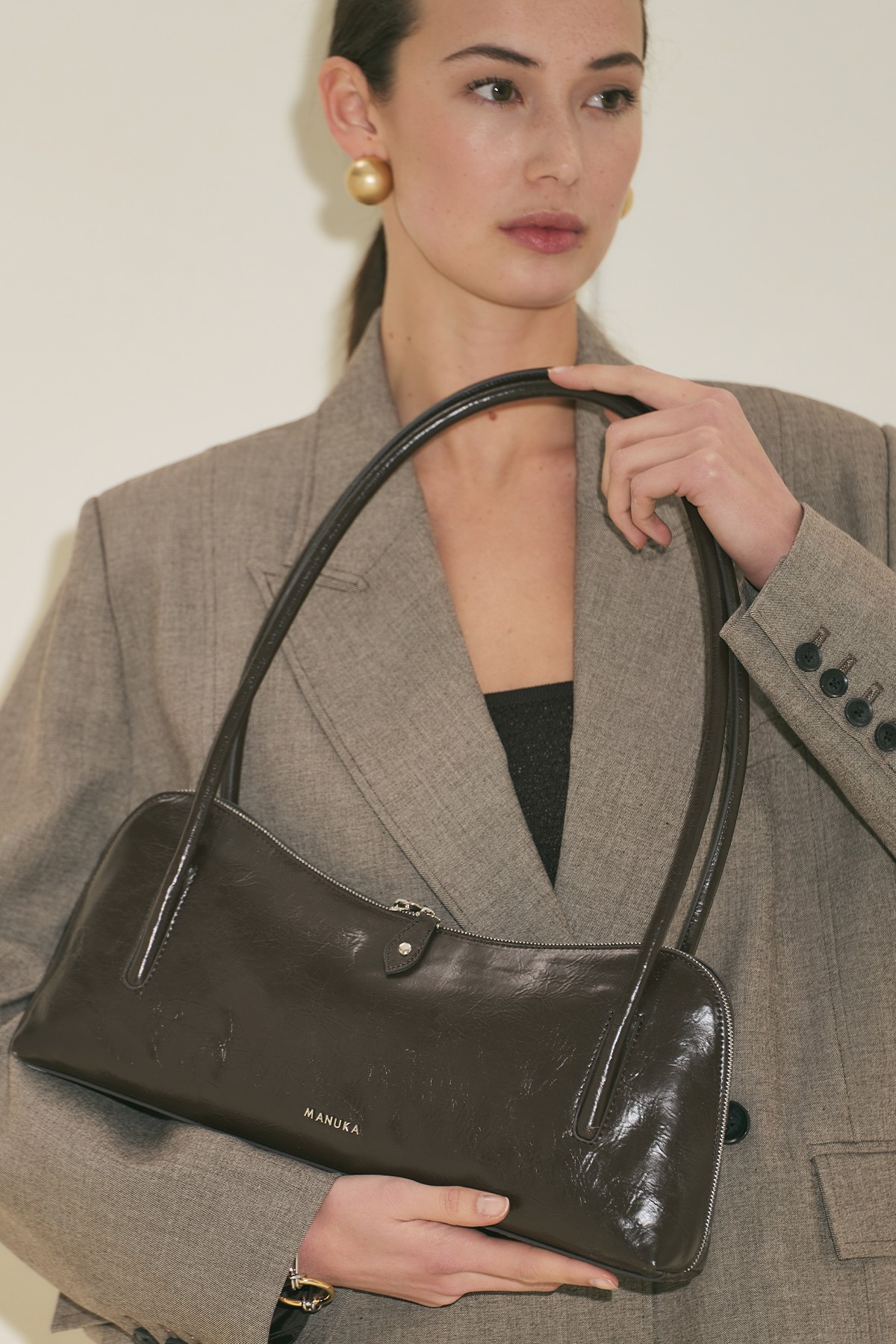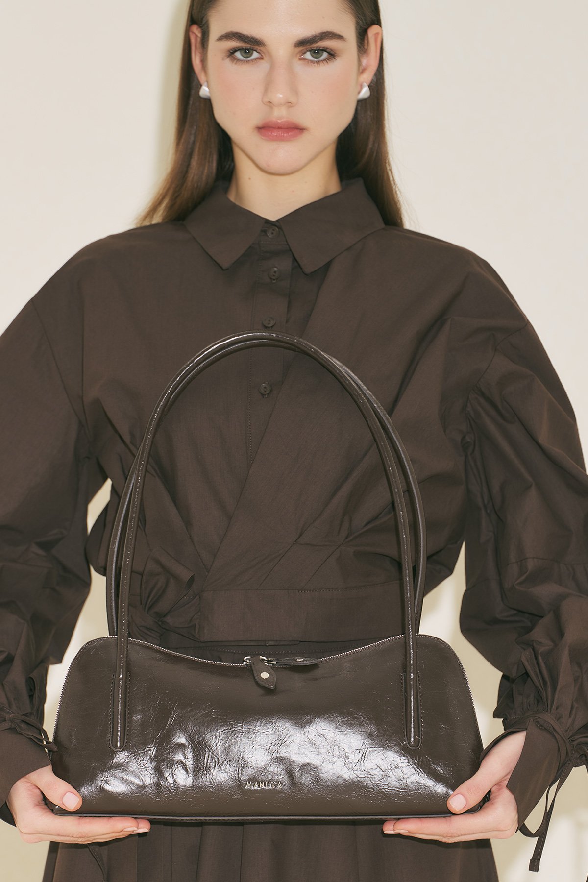 Büyük boy, baget form, manuka logolu, içte cep detaylı, fermuar kapama, suni deri, astarlı.