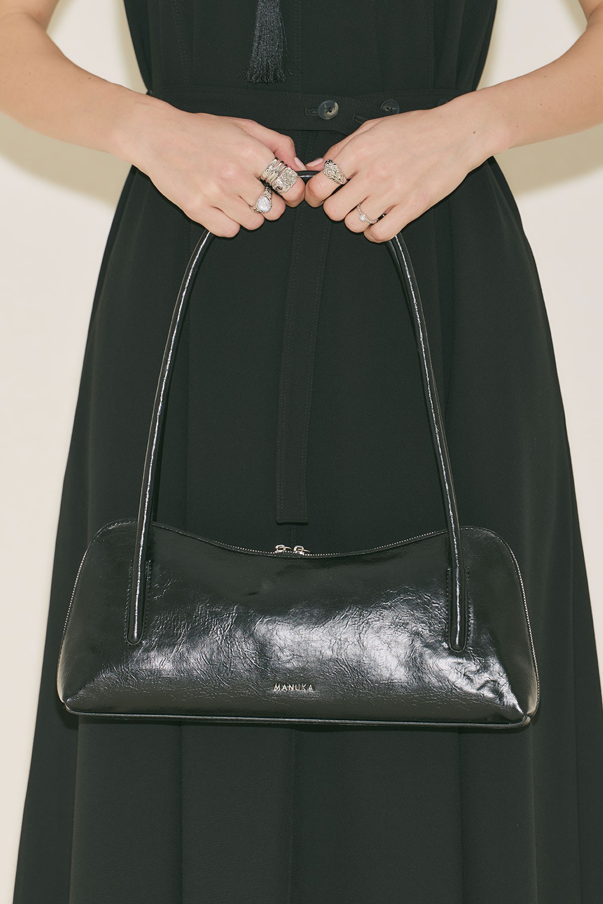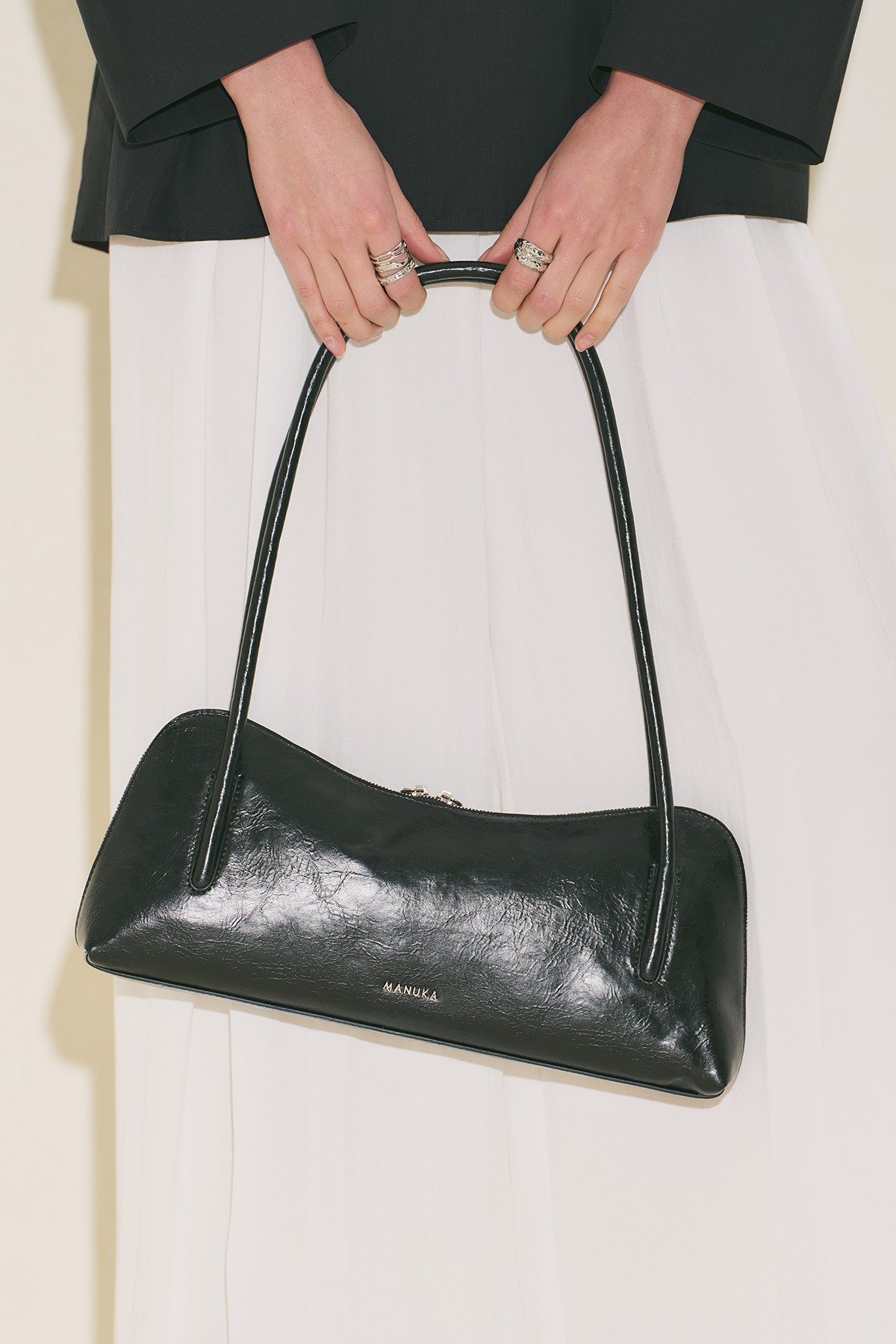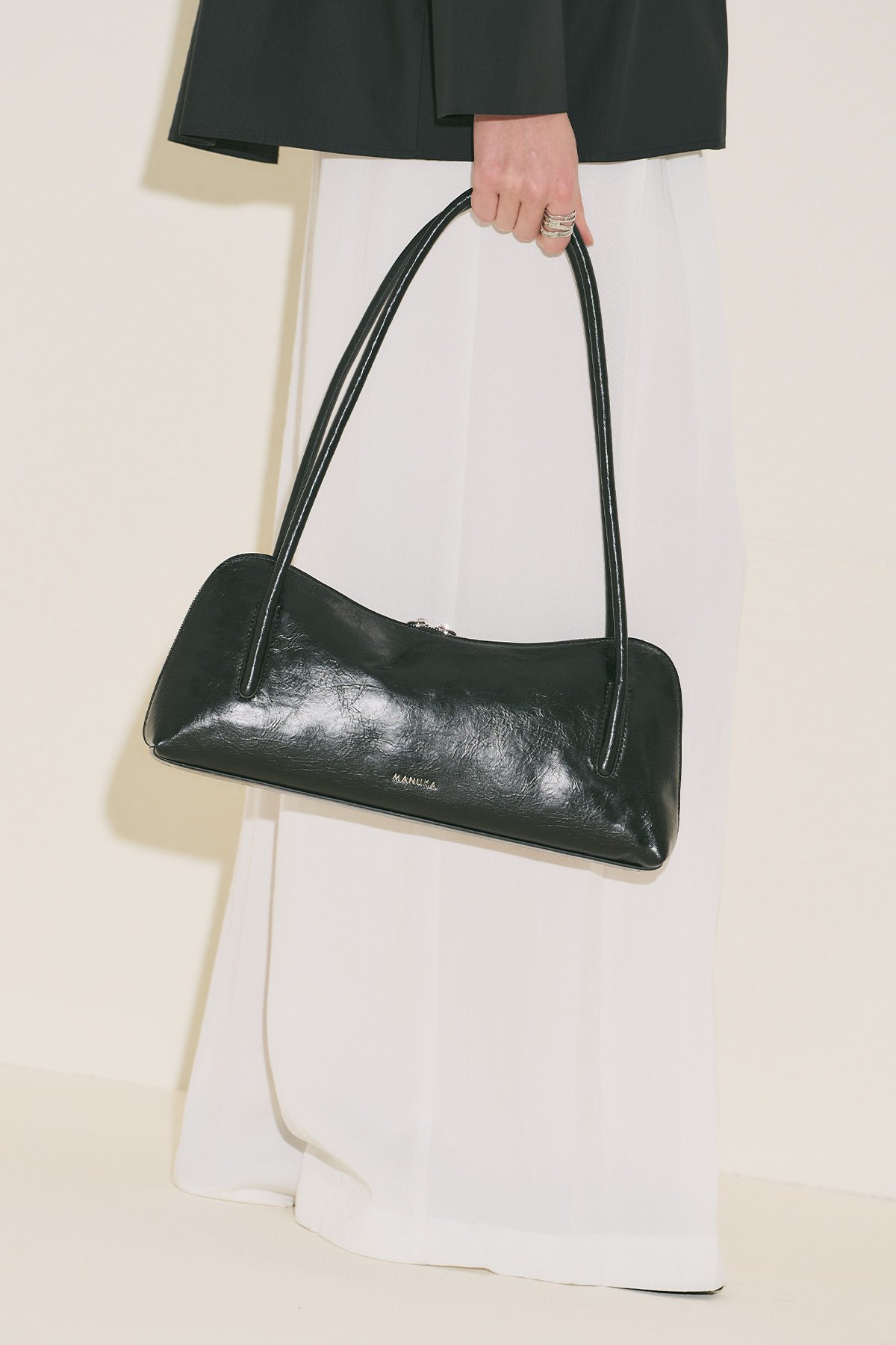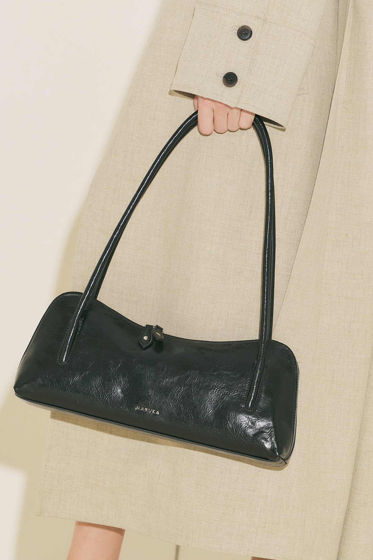 Büyük boy, baget form, manuka logolu, içte cep detaylı, fermuar kapama, suni deri, astarlı.