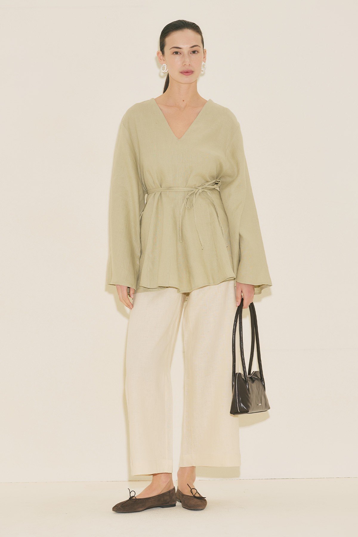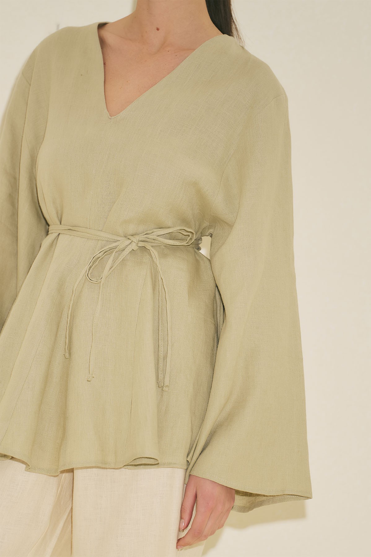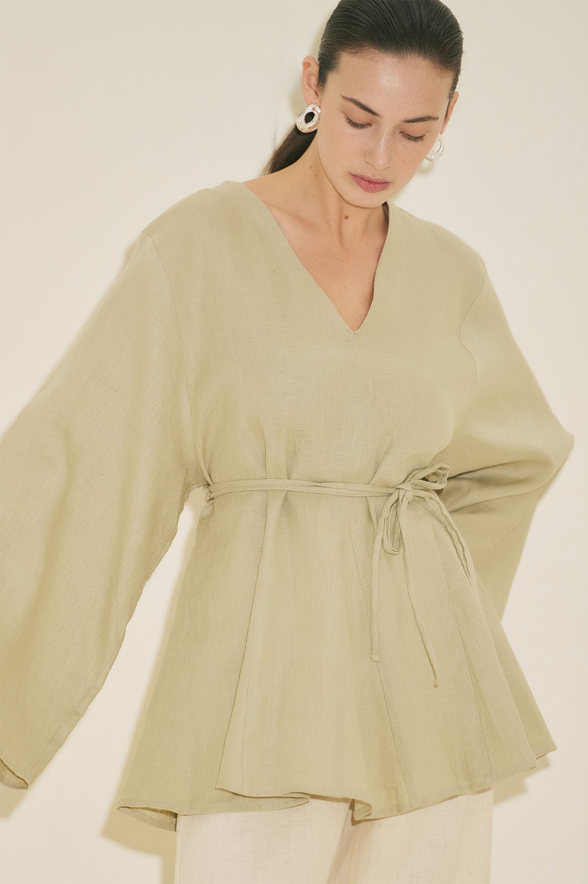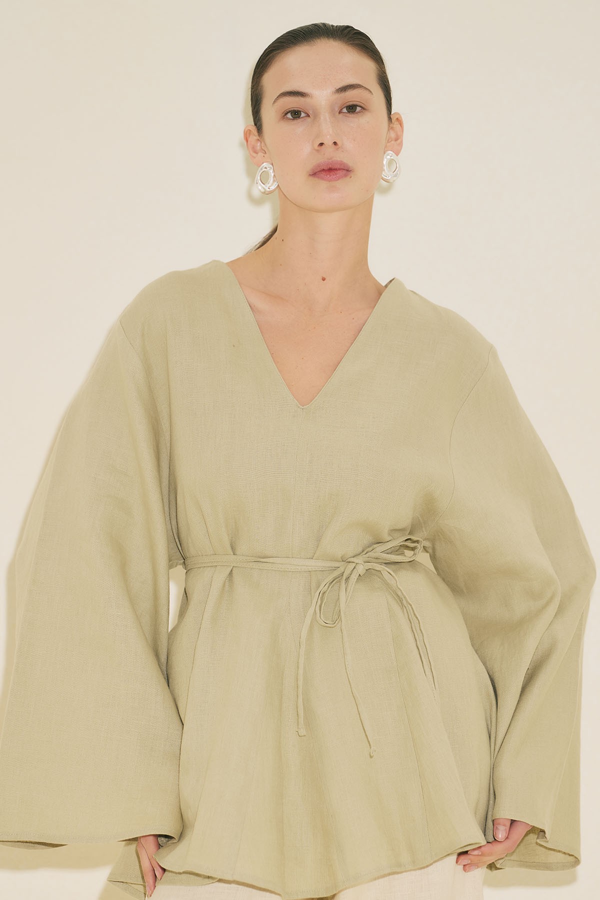 Fit form, V yaka, uzun geniş kol, tunik boy, volanlı, kuşaklı.