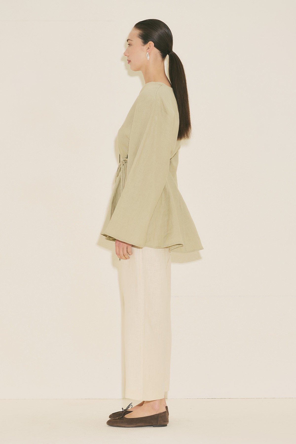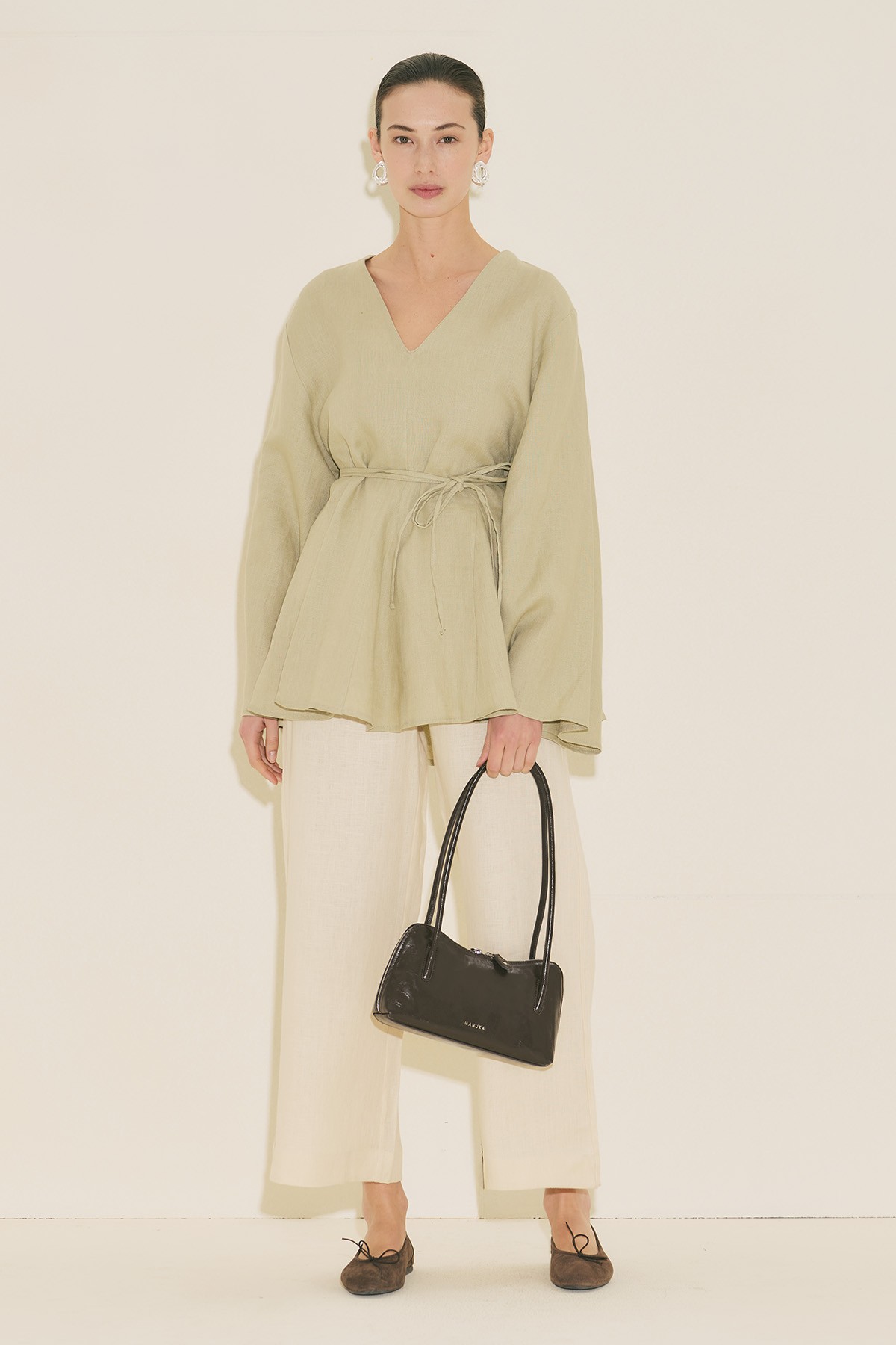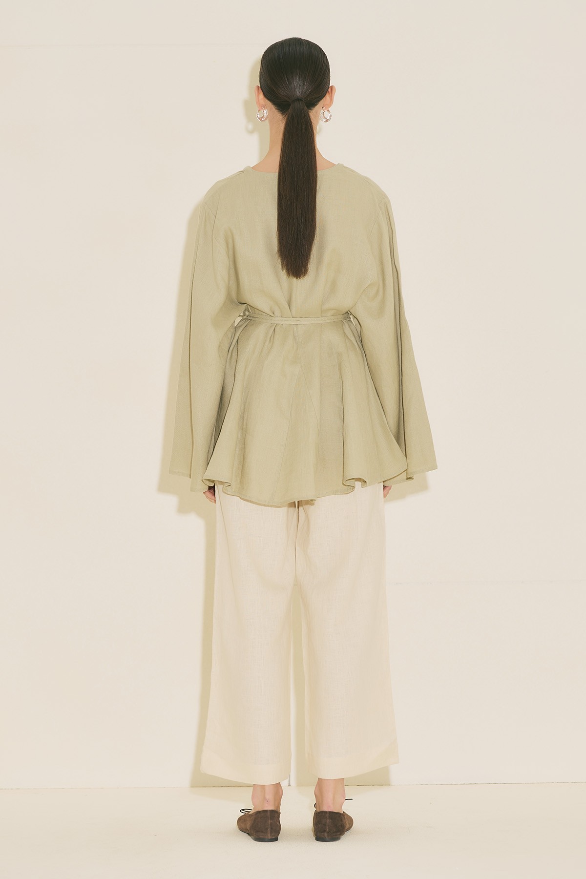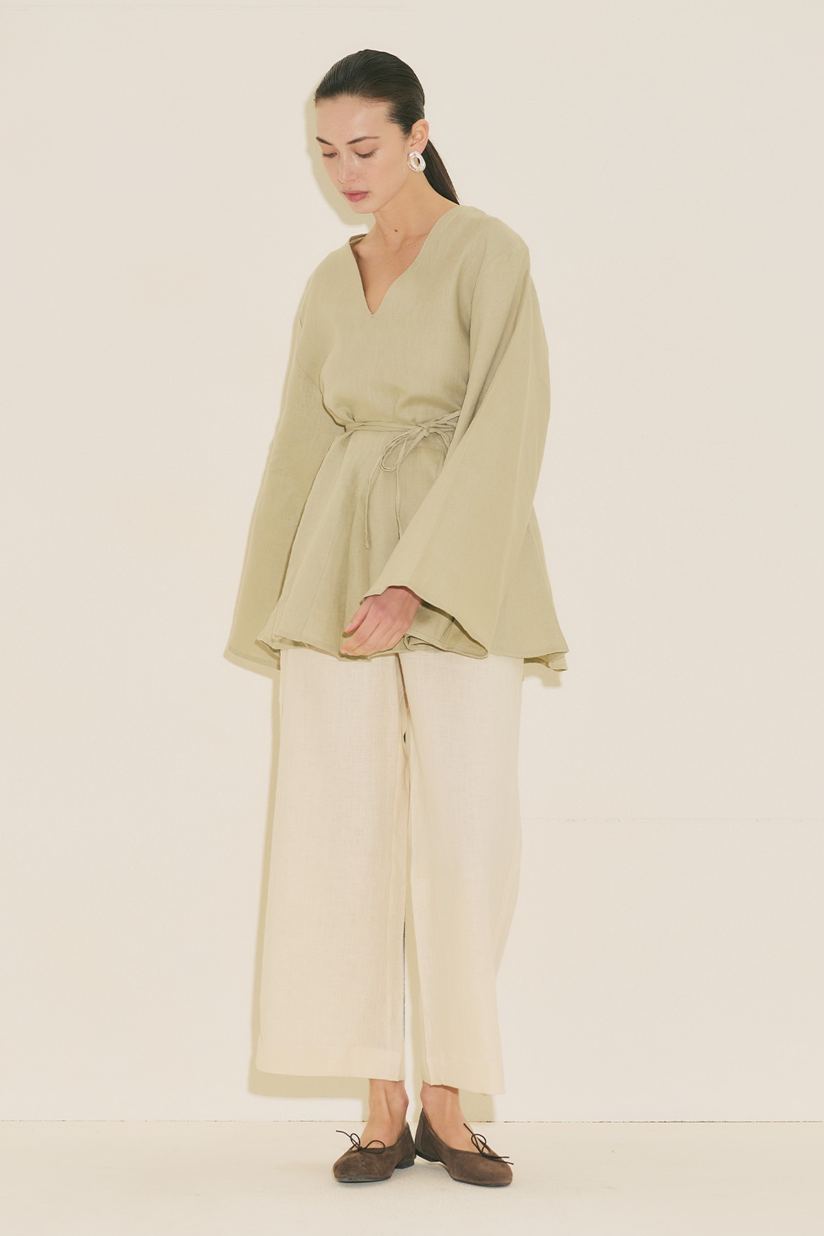 Fit form, V yaka, uzun geniş kol, tunik boy, volanlı, kuşaklı.