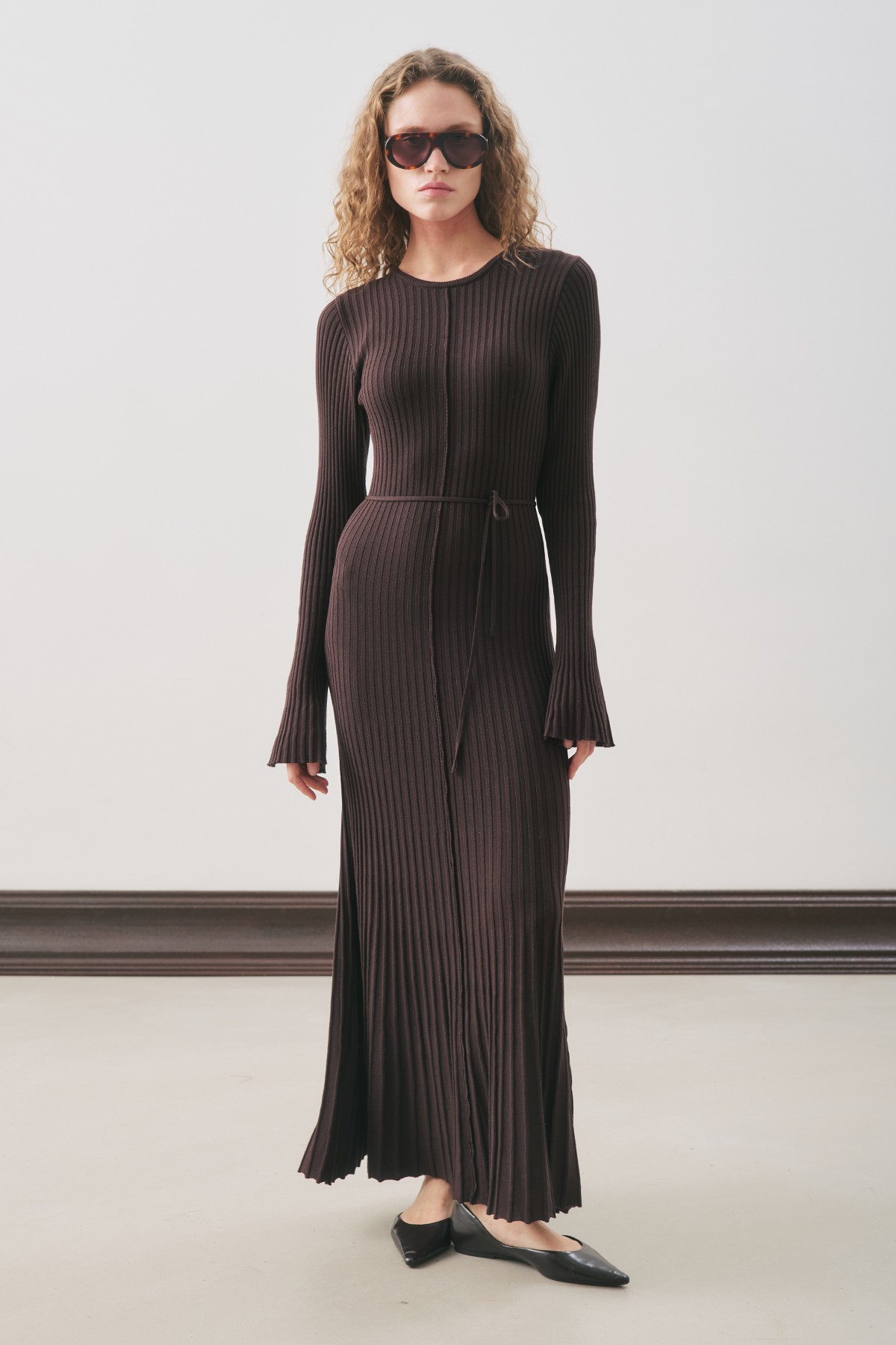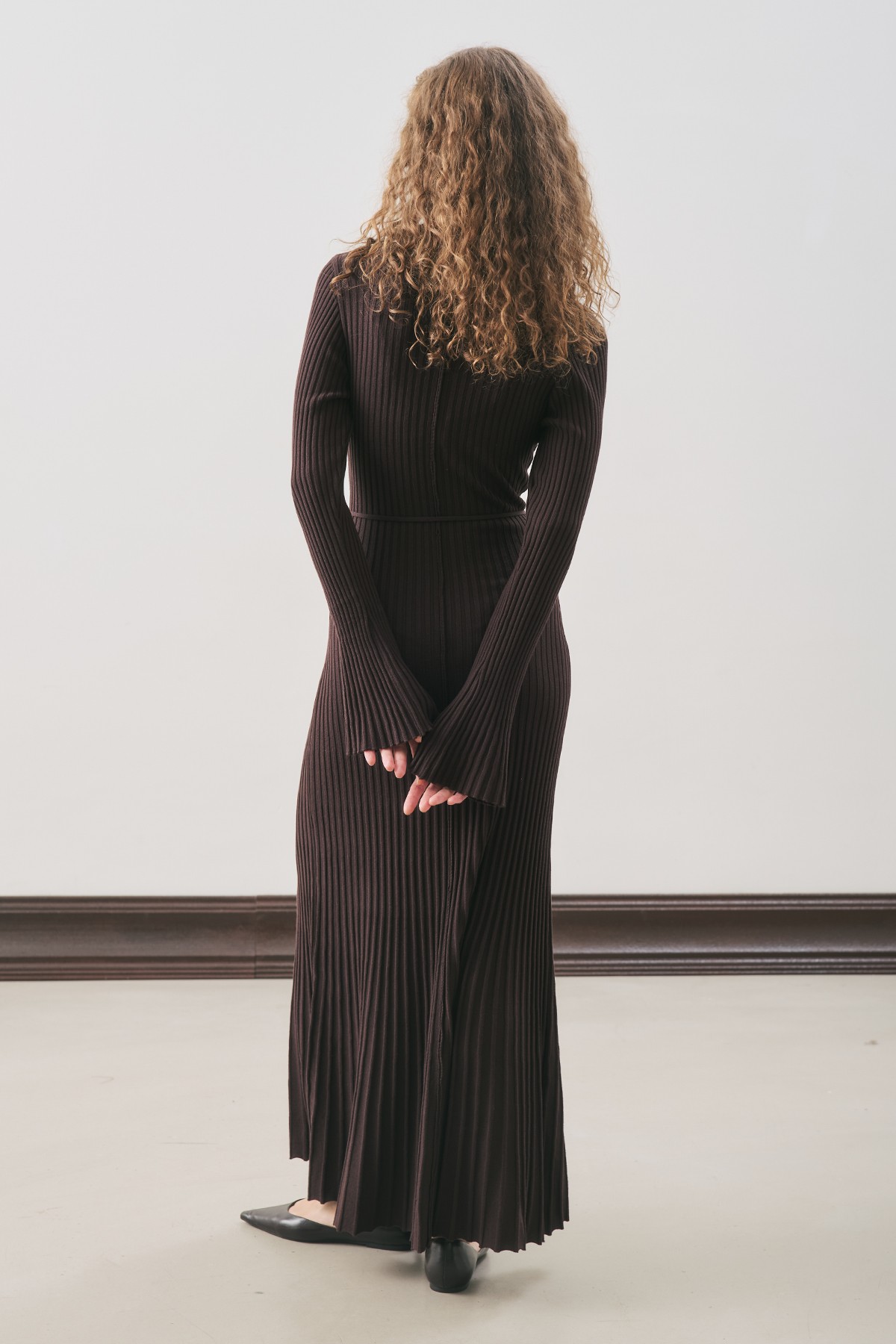 KLOŞ ETEKLİ LASTİK ÖRGÜ ELBİSE KAHVERENGİ