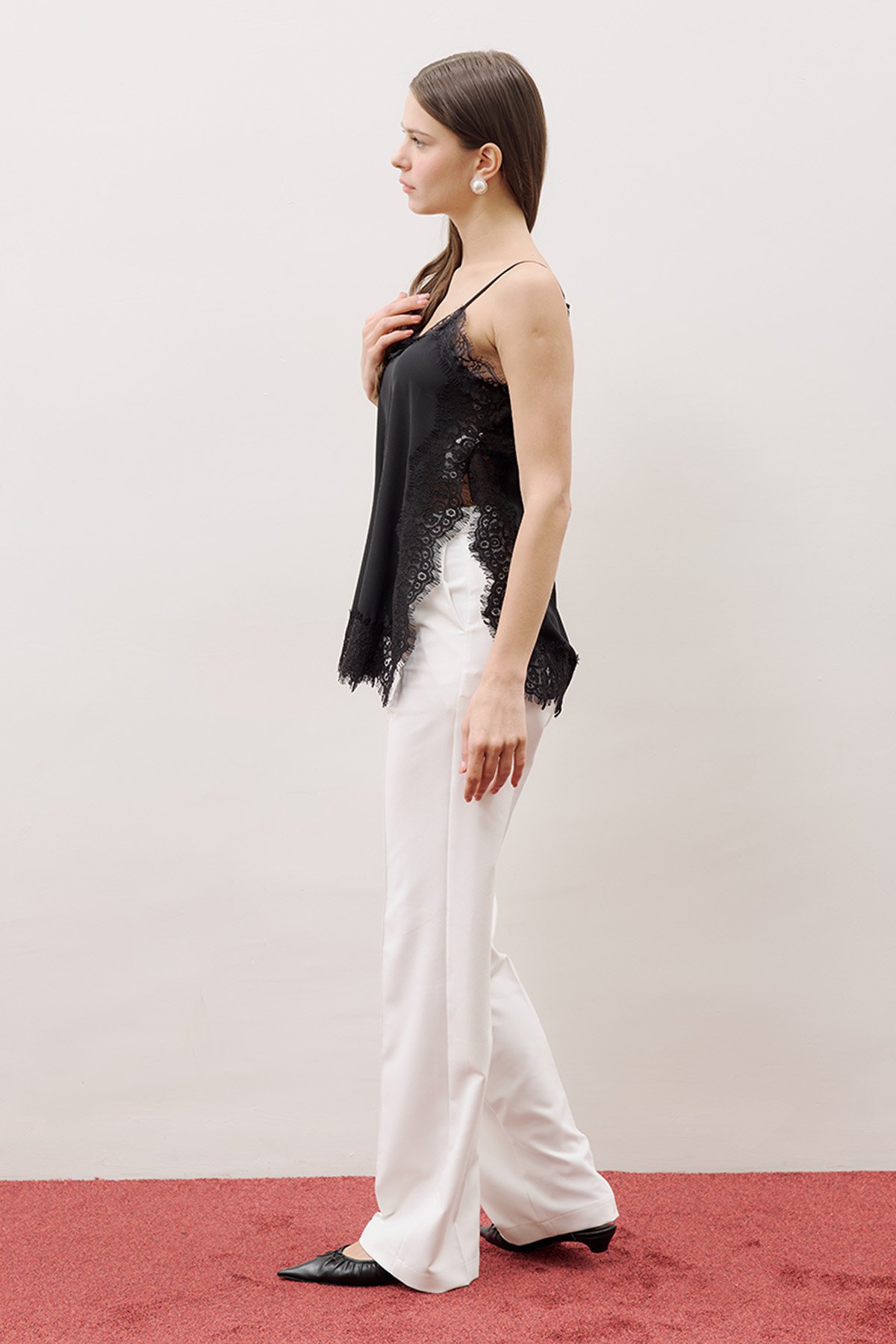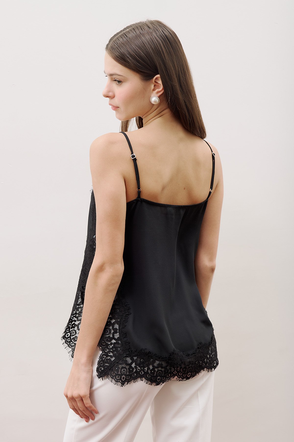 Regular fit, V-neck, sleeveless with straps, lace trim detail, midi length, woven fabric.