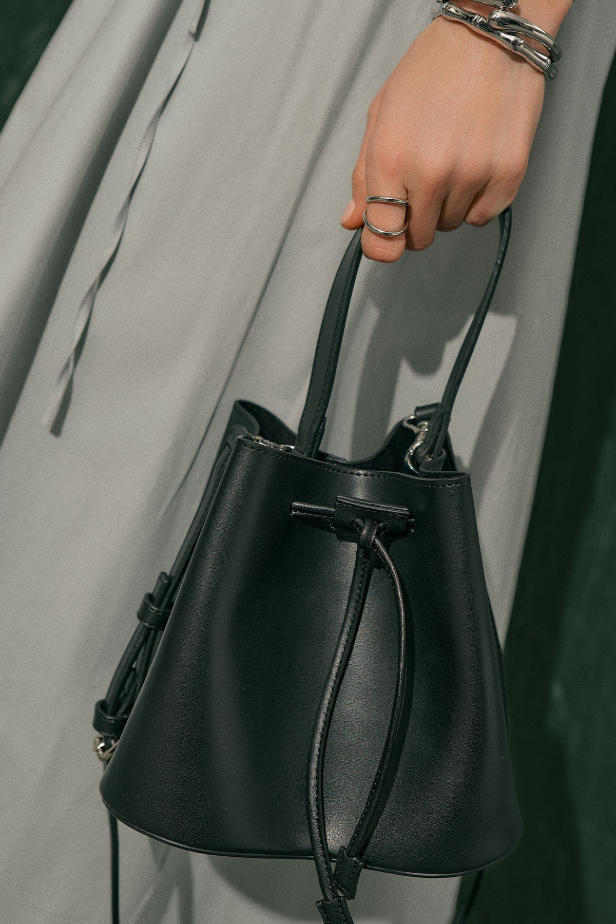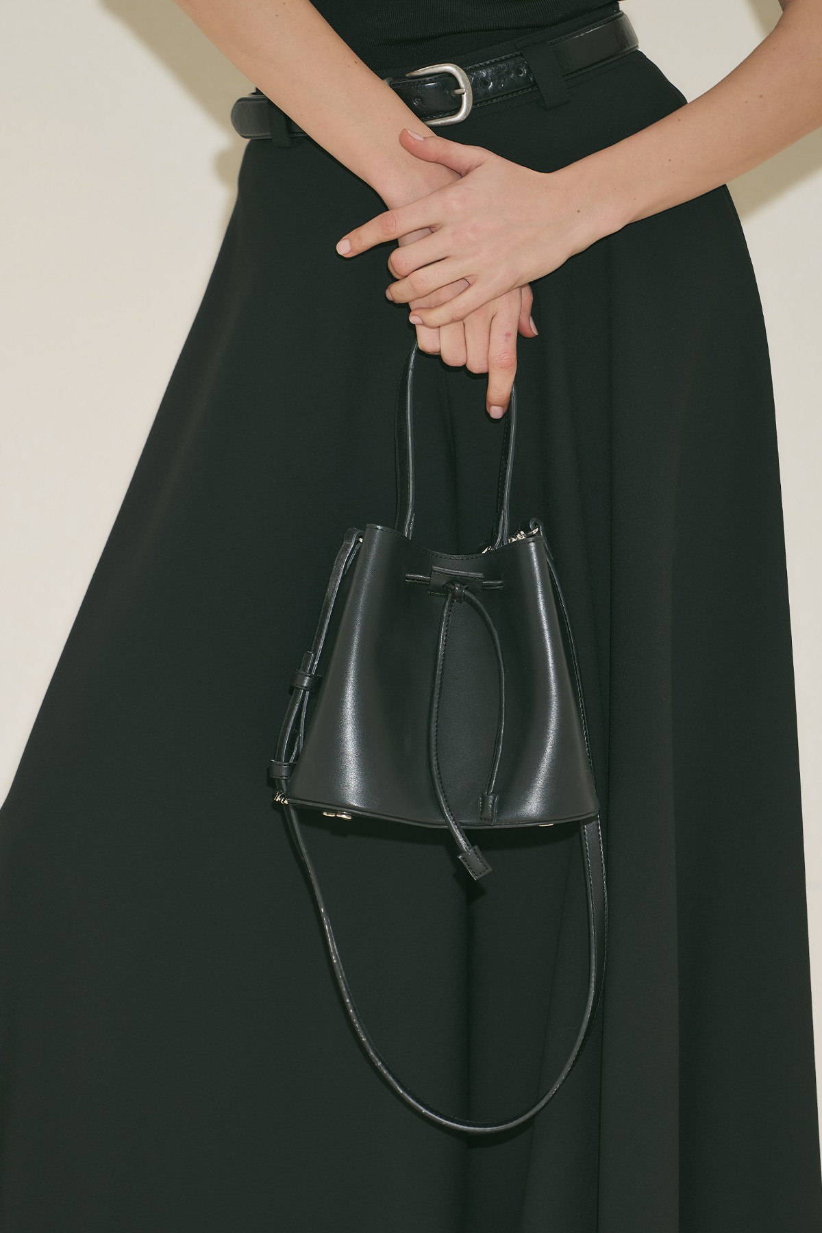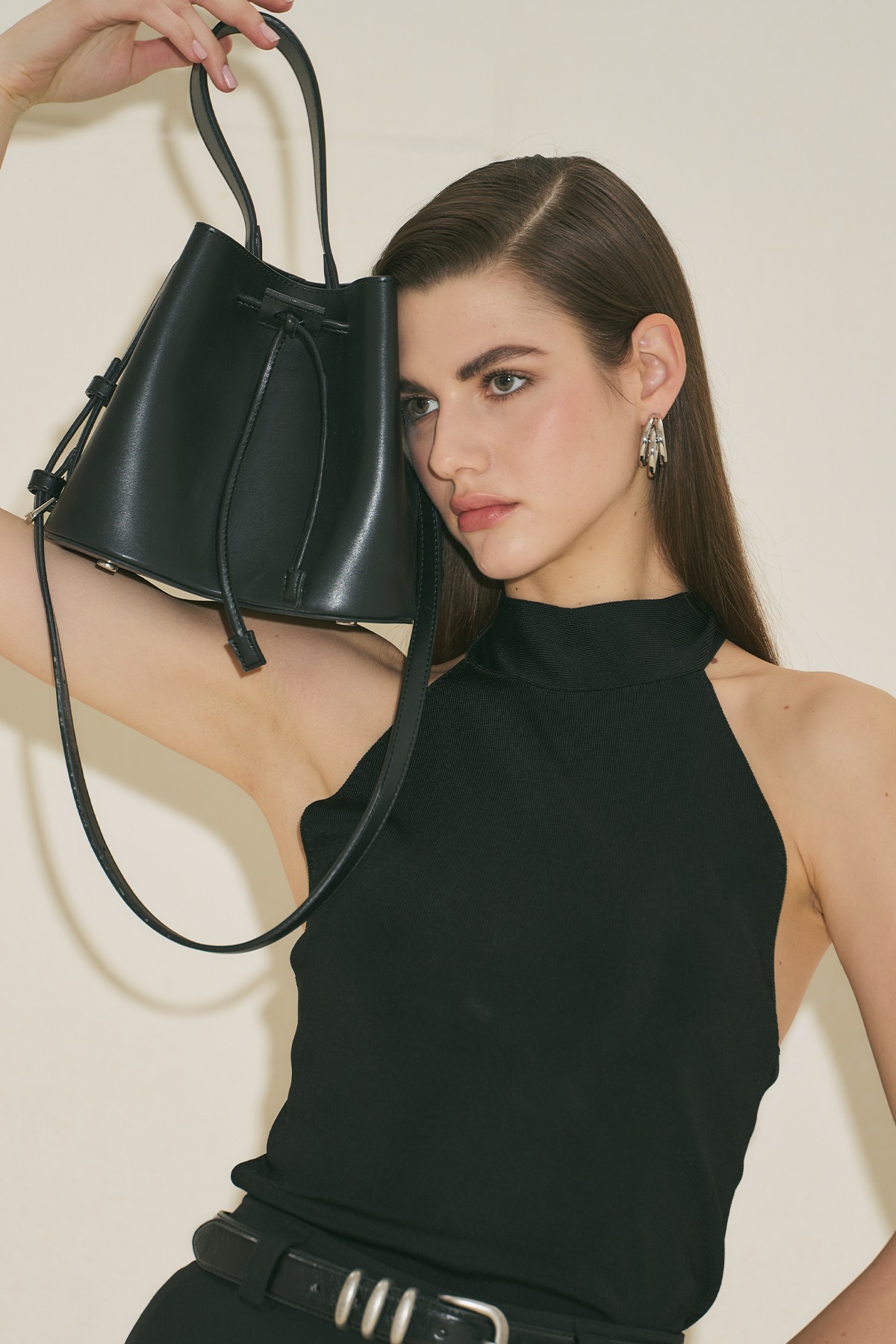 Orta boy, oval köşeli form, içte küçük çanta detaylı, manuka logolu, büzdürmeli kapama, suni deri, astarsız.