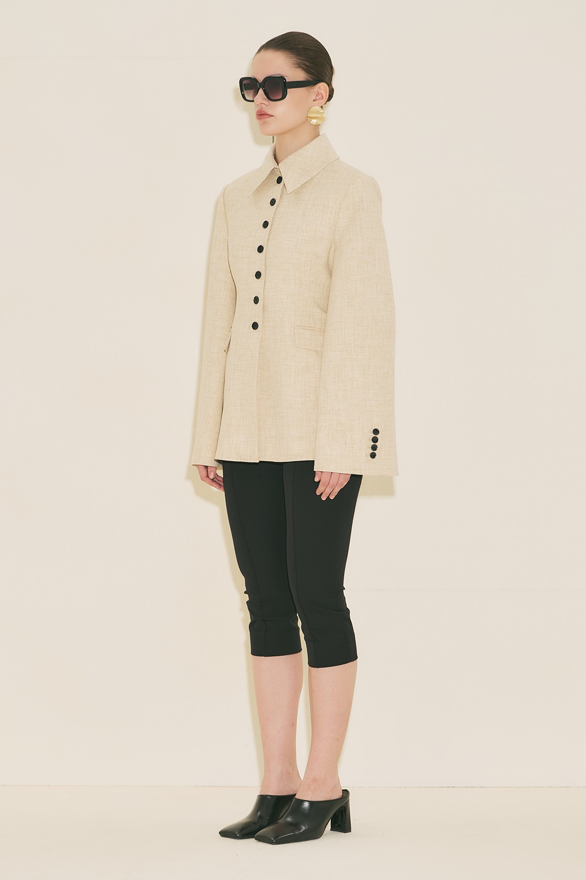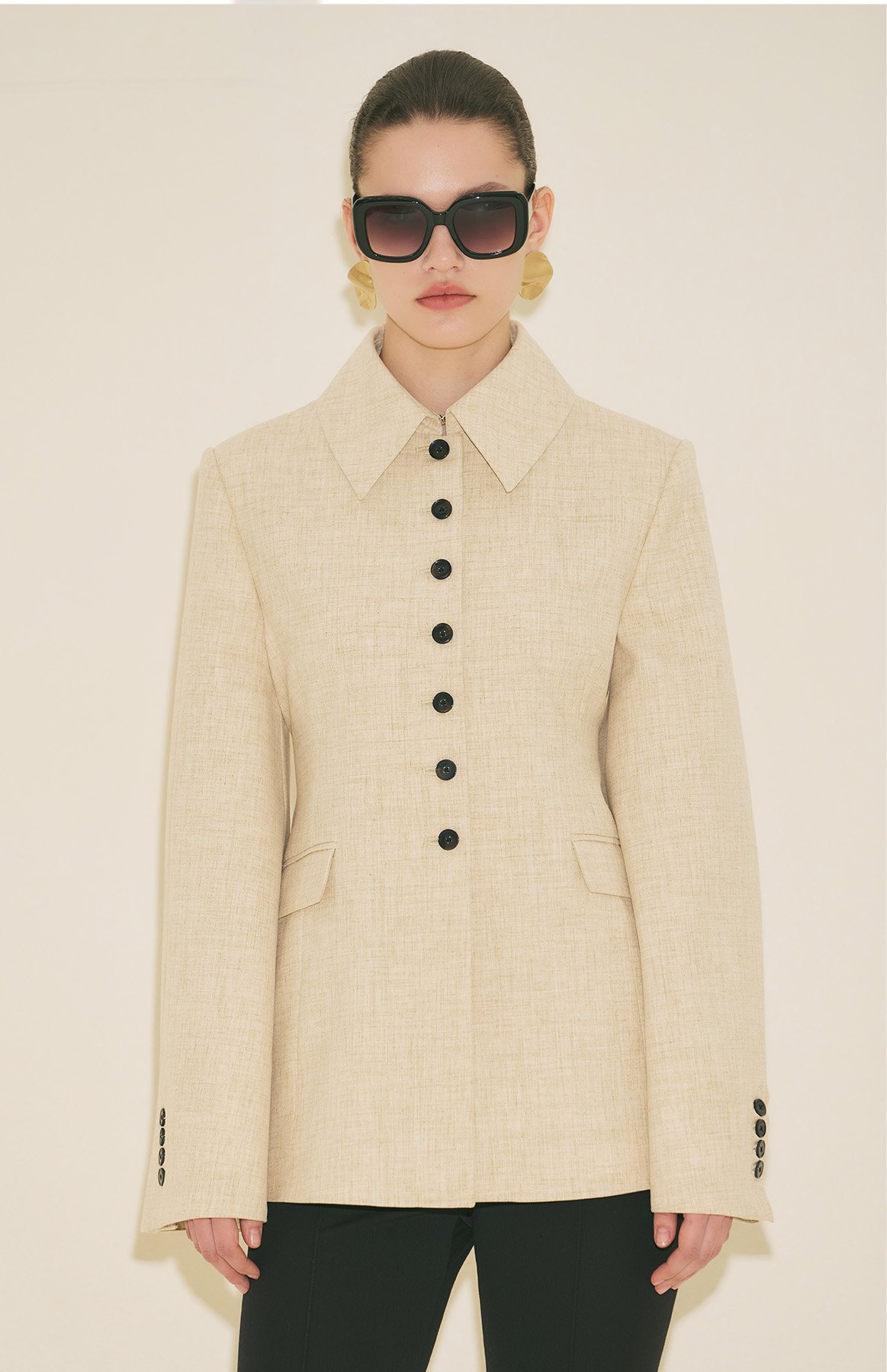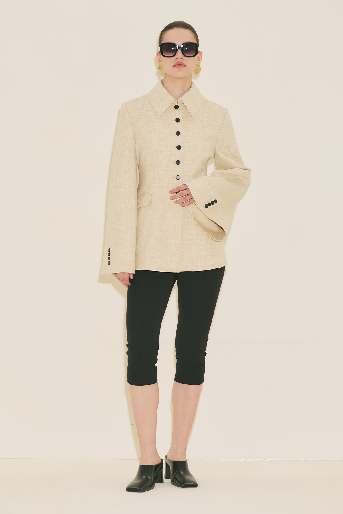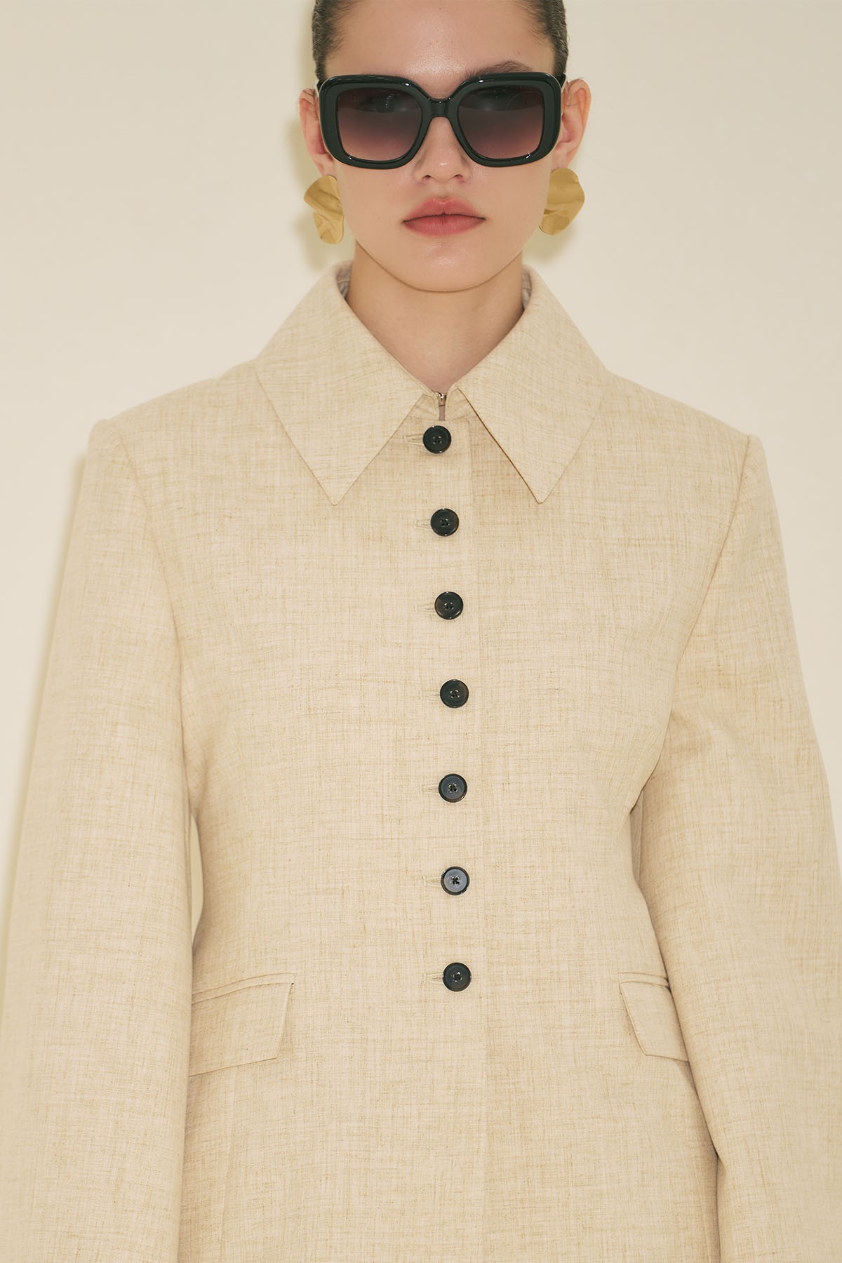 Fit kalıp, gömlek yaka, uzun çan form kol, ara boy, cepli, düğme detaylı oturan form, düğme kapamalı.