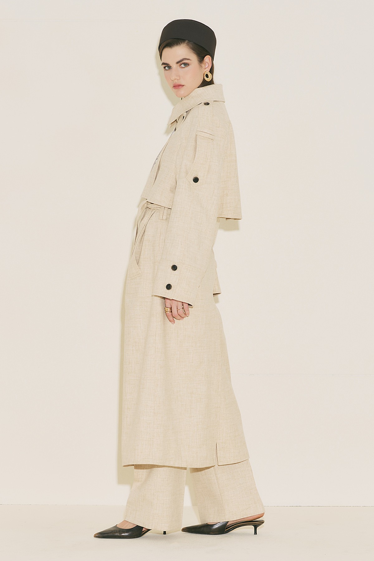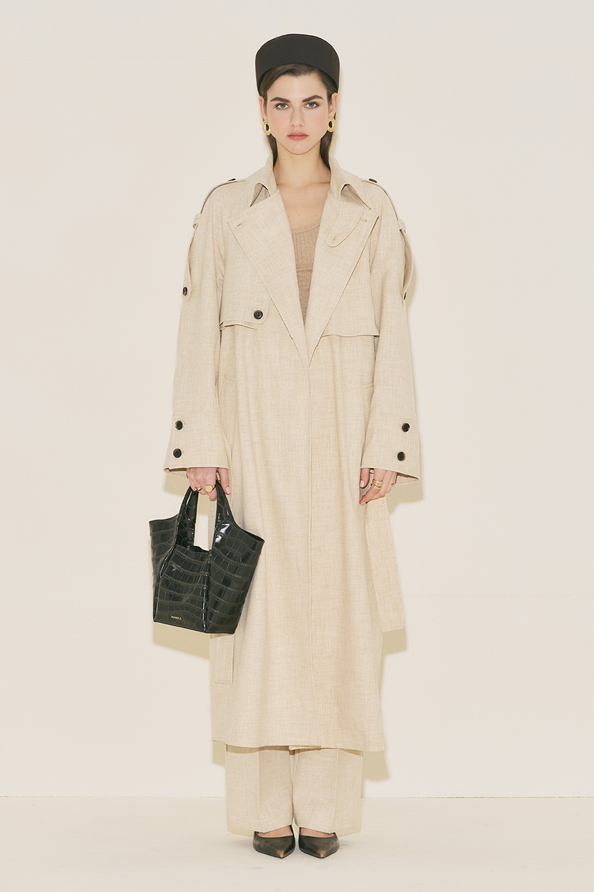 Oversize form, gömlek yaka, uzun geniş kol, midi boy, yaka ve omuzda apolet detaylı, rüzgarlıklı, belinde kendi kumaşından kuşak detaylı, düğme kapamalı.