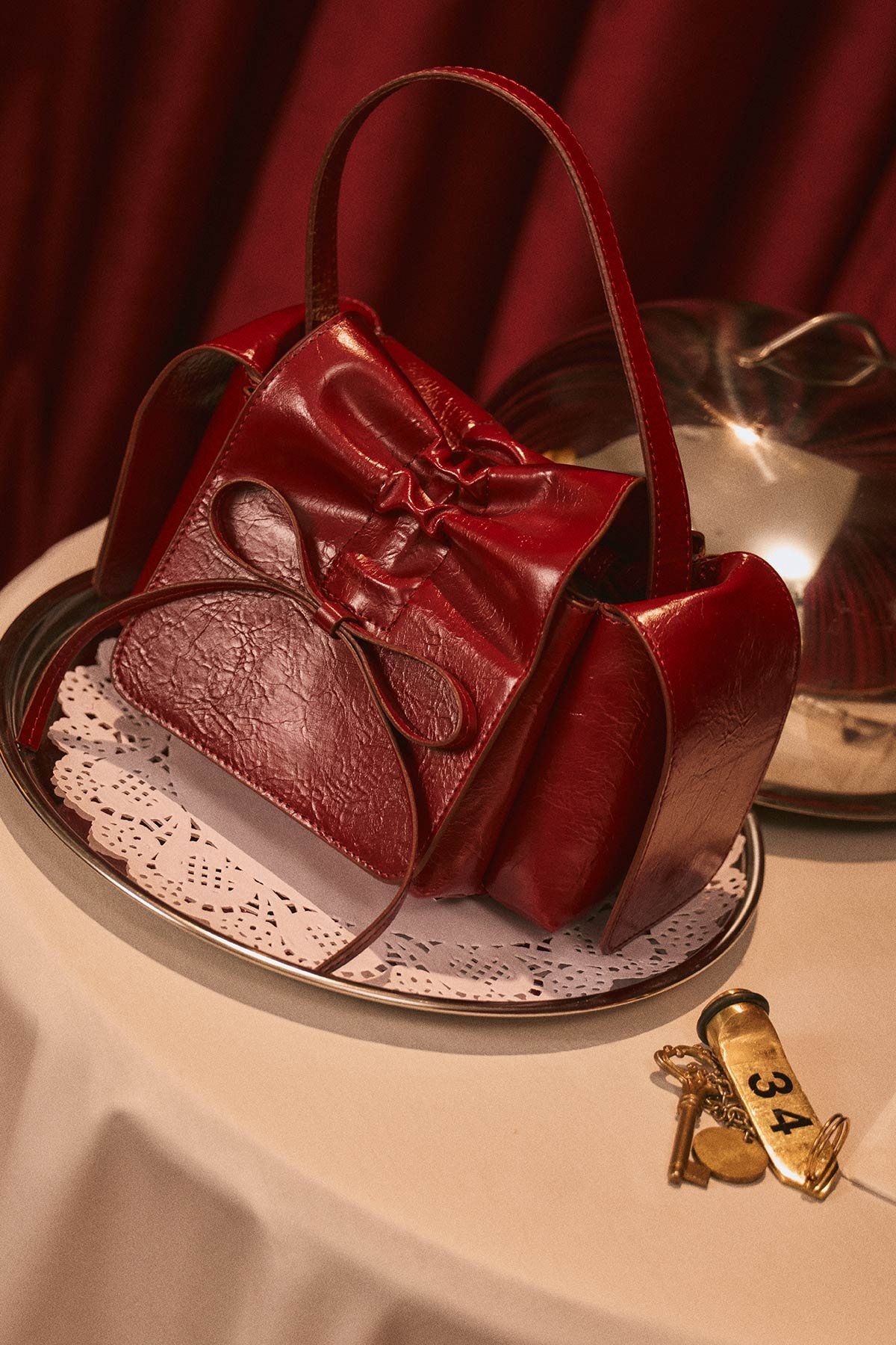 Orta boy, omuz çantası, fiyonk ve büzgü detaylı, içte ve yanlarda cep detaylı, kısa ve uzun askı detaylı, çıt çıt kapamalı, suni deri, astarlı.