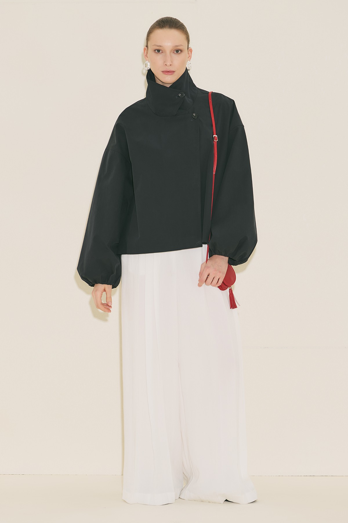 Fit kalıp, yüksek yaka, uzun balon kol, crop boy, düğme kapamalı.