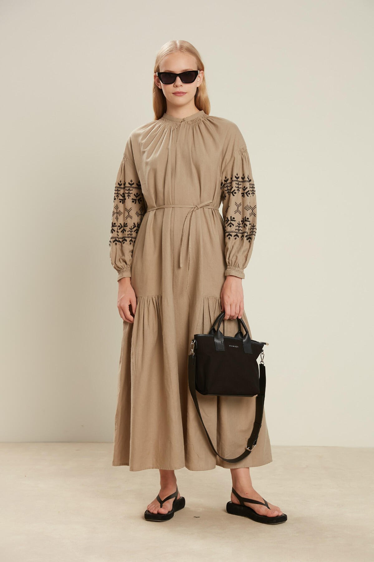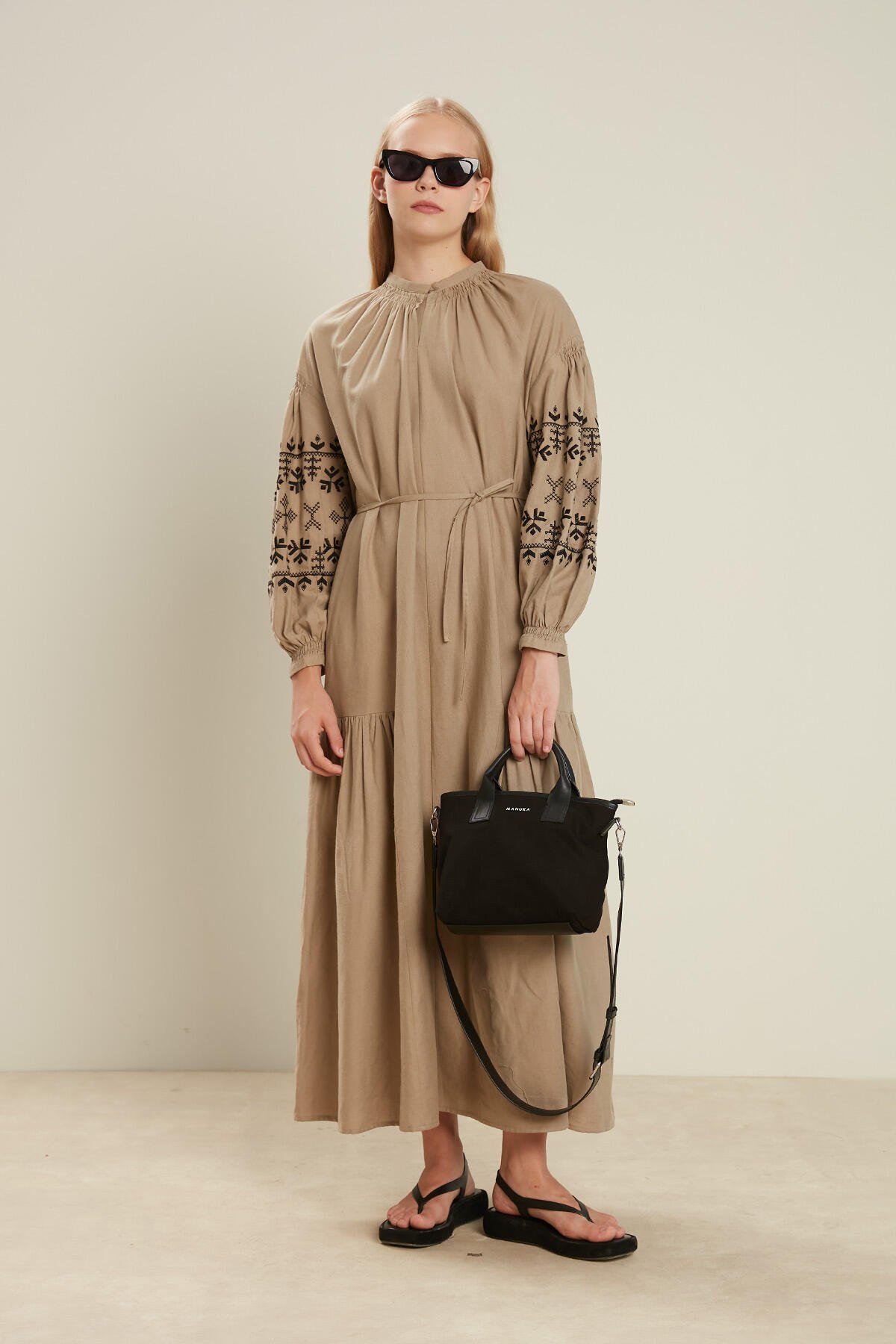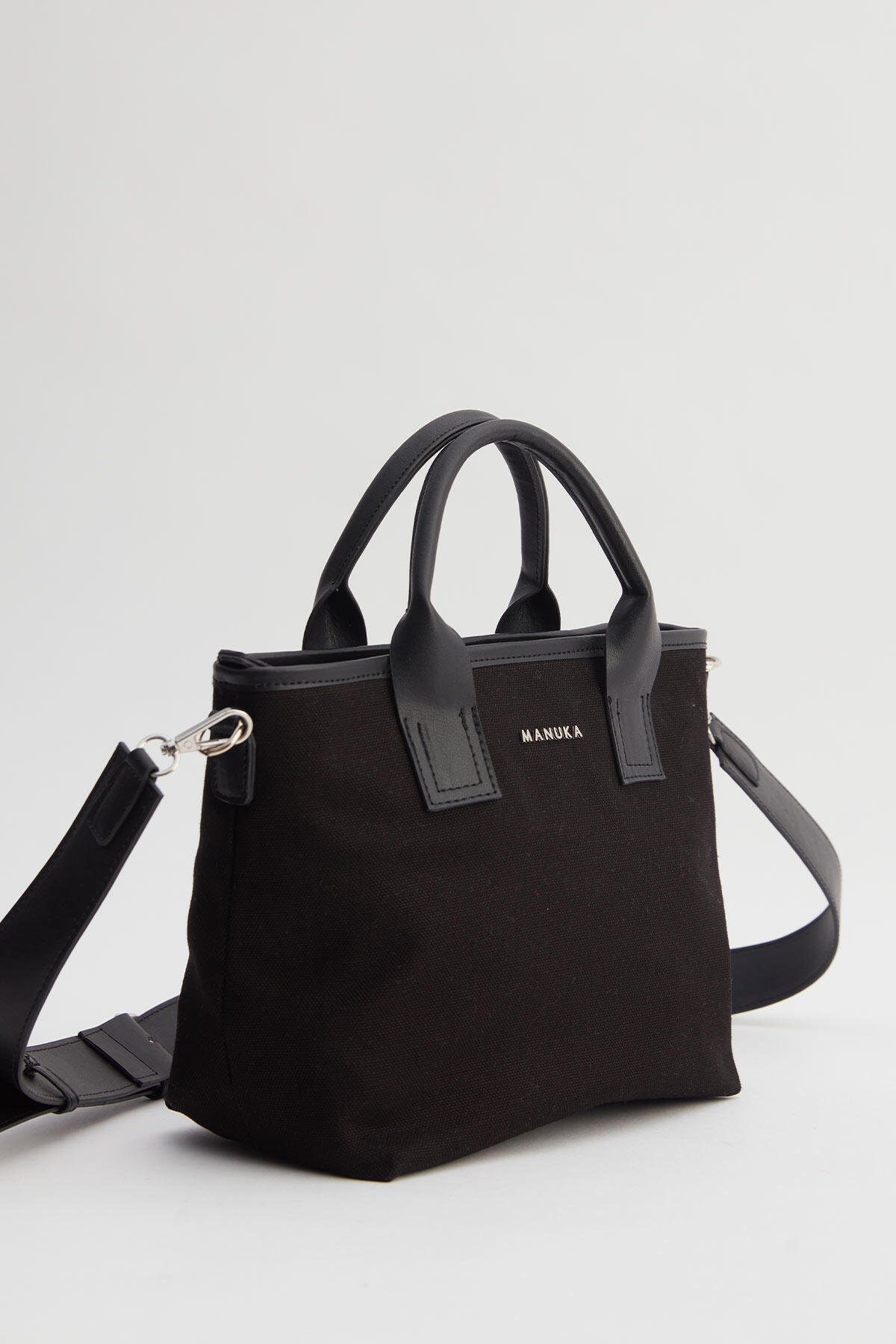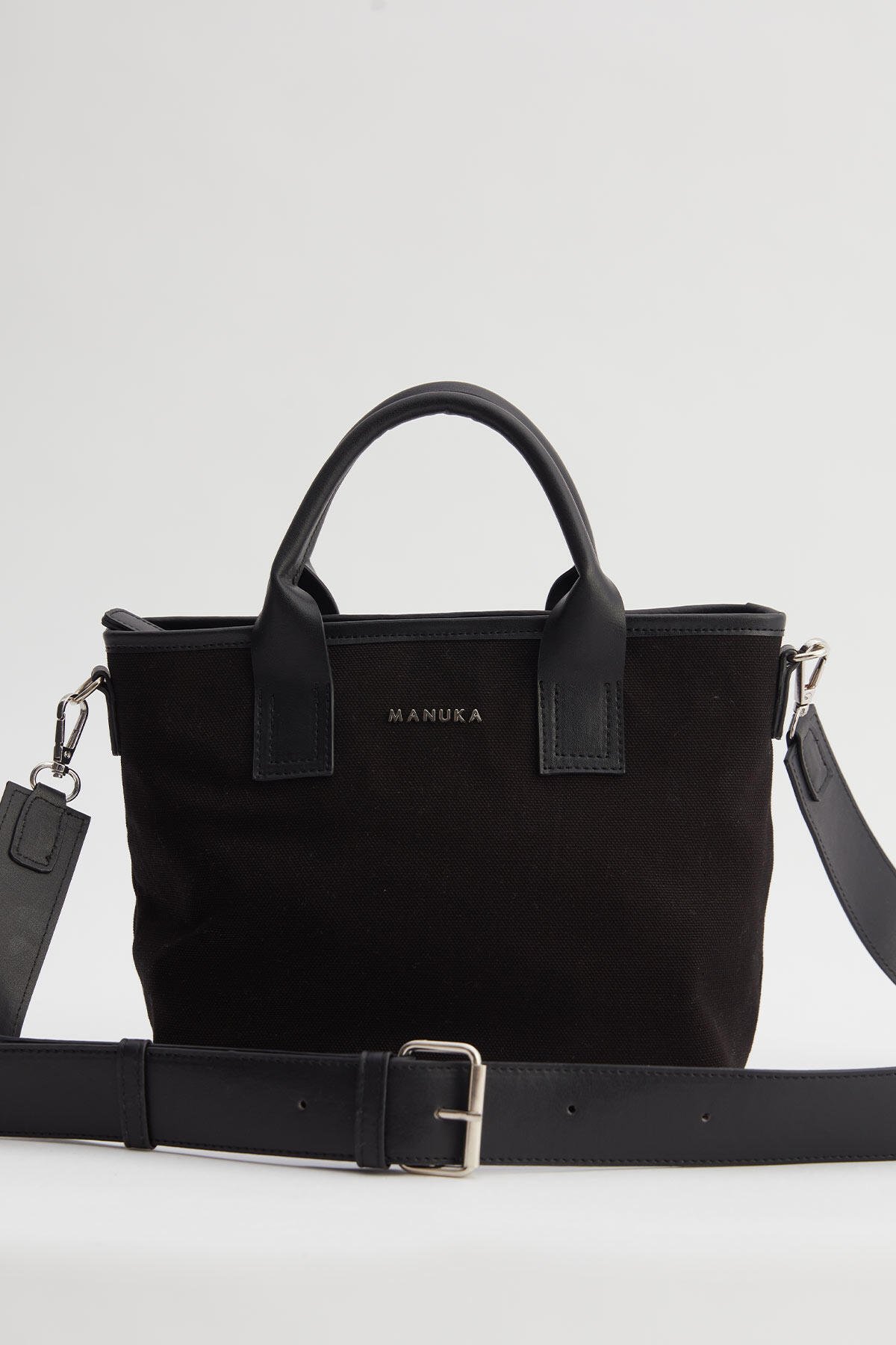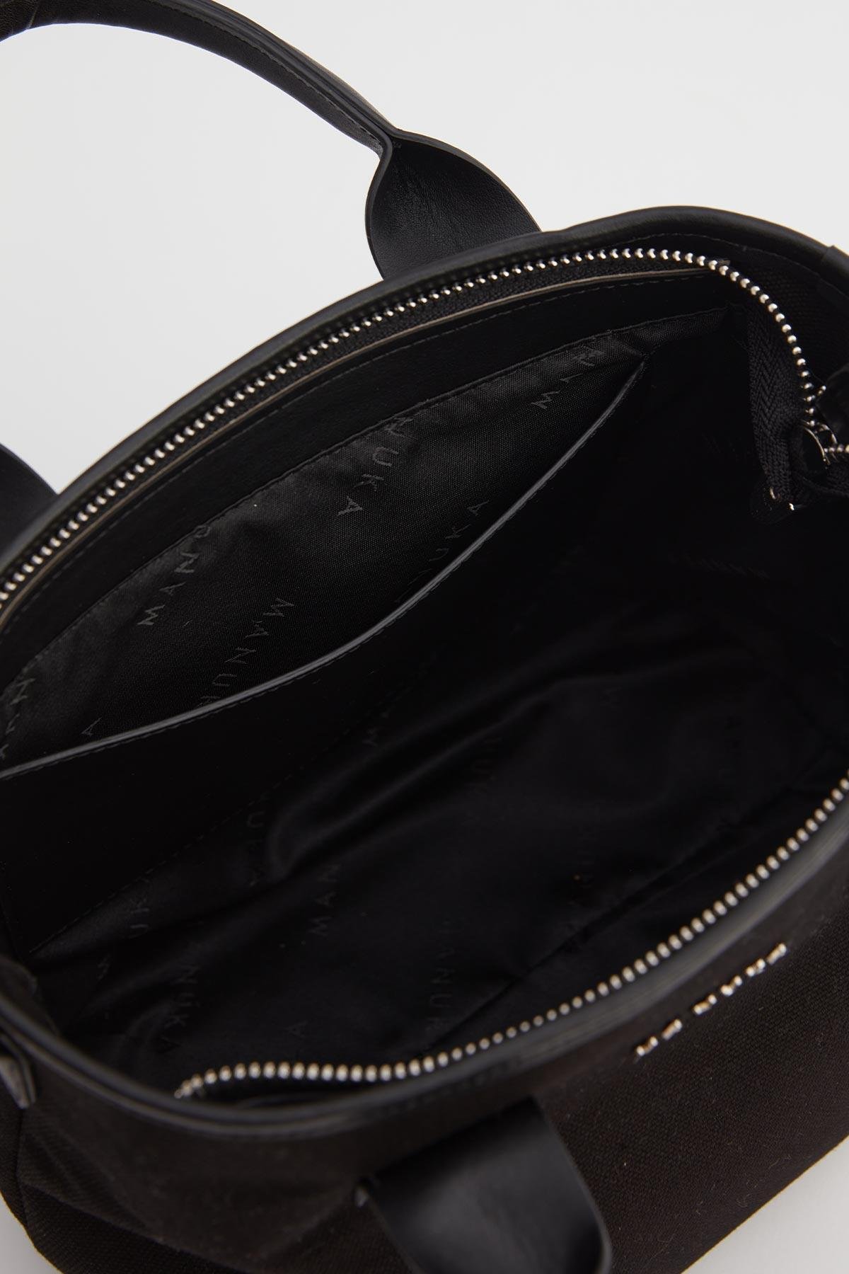 Suni deri garnili kanvas kumaş, el ve çapraz askı seçenekleri, fermuar kapamalı, Manuka logolu, Ayarlanabilir omuz askılı , İç astarlı ve küçük cep detaylı