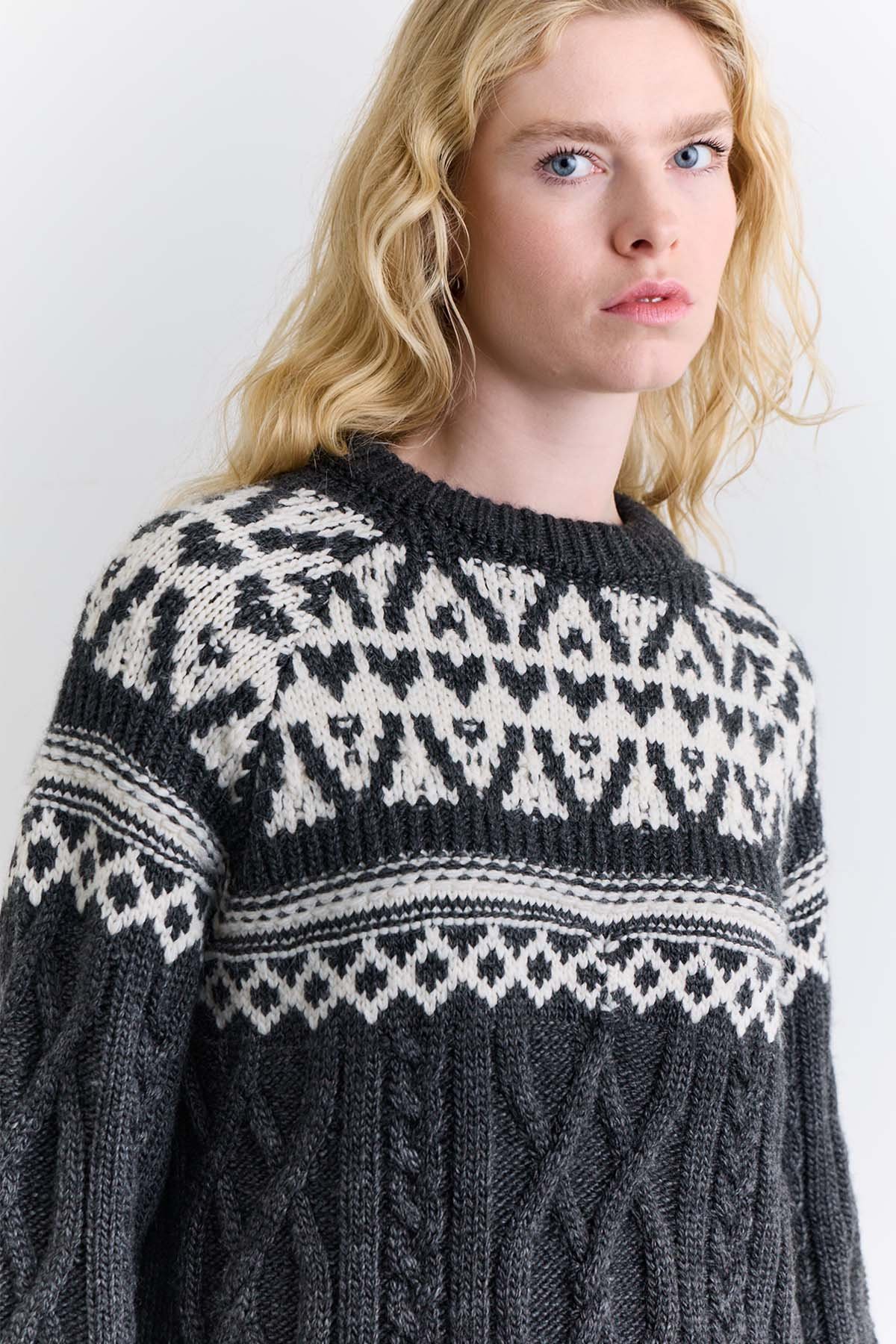 Regular kalıp, yuvarlak yaka, uzun kol, desenli örgü kazak, ara boy.