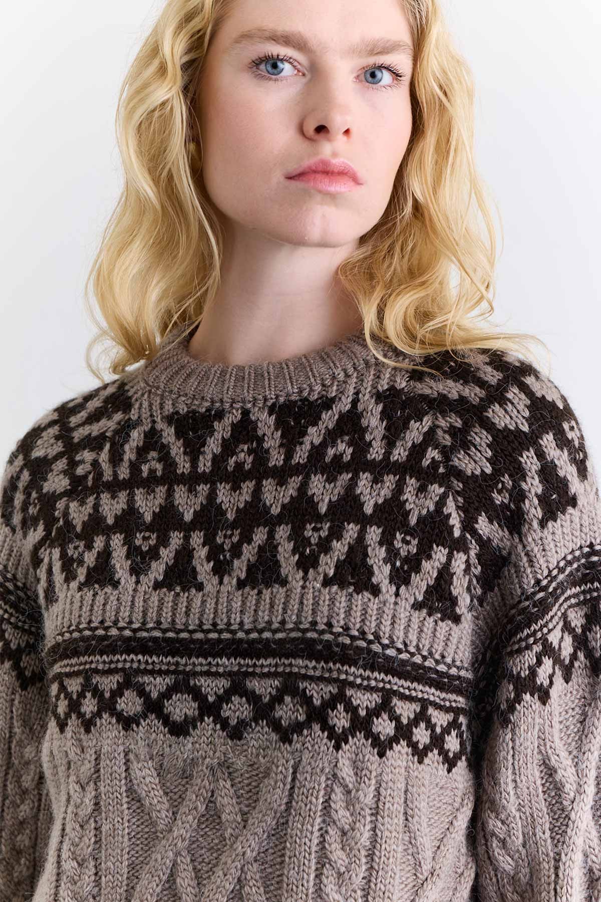 Regular fit, round neck, long sleeves, patterned knit sweater, mid-length.