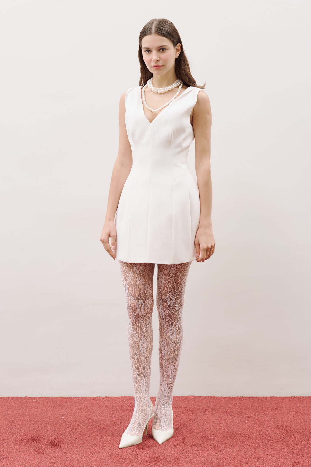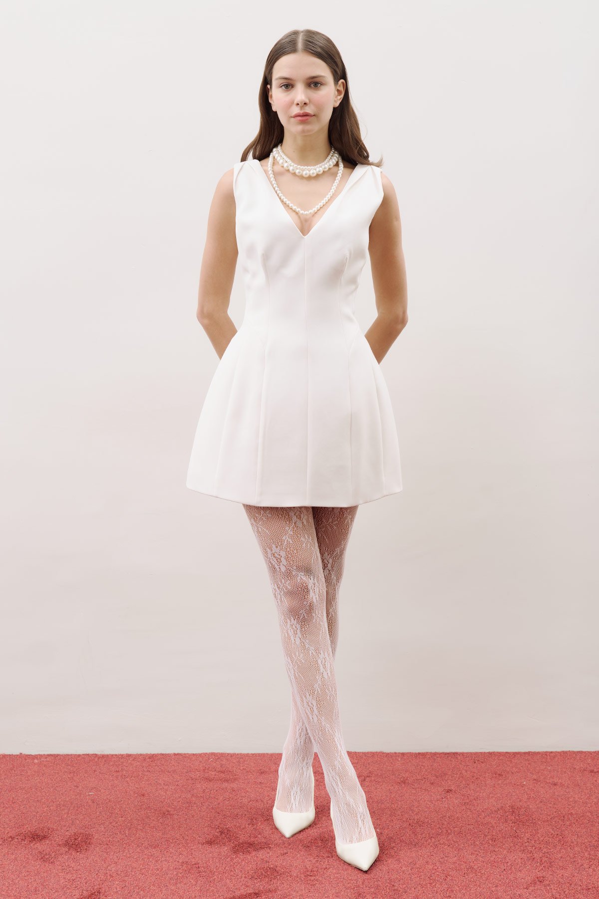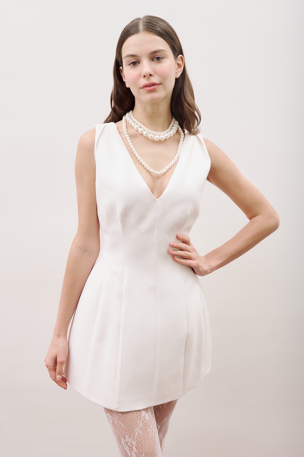 V yakalı, omuzlarda pile detay, bele oturan fit kalıp, mini boy, kup detaylı, astarlı, fermuar kapamalı.