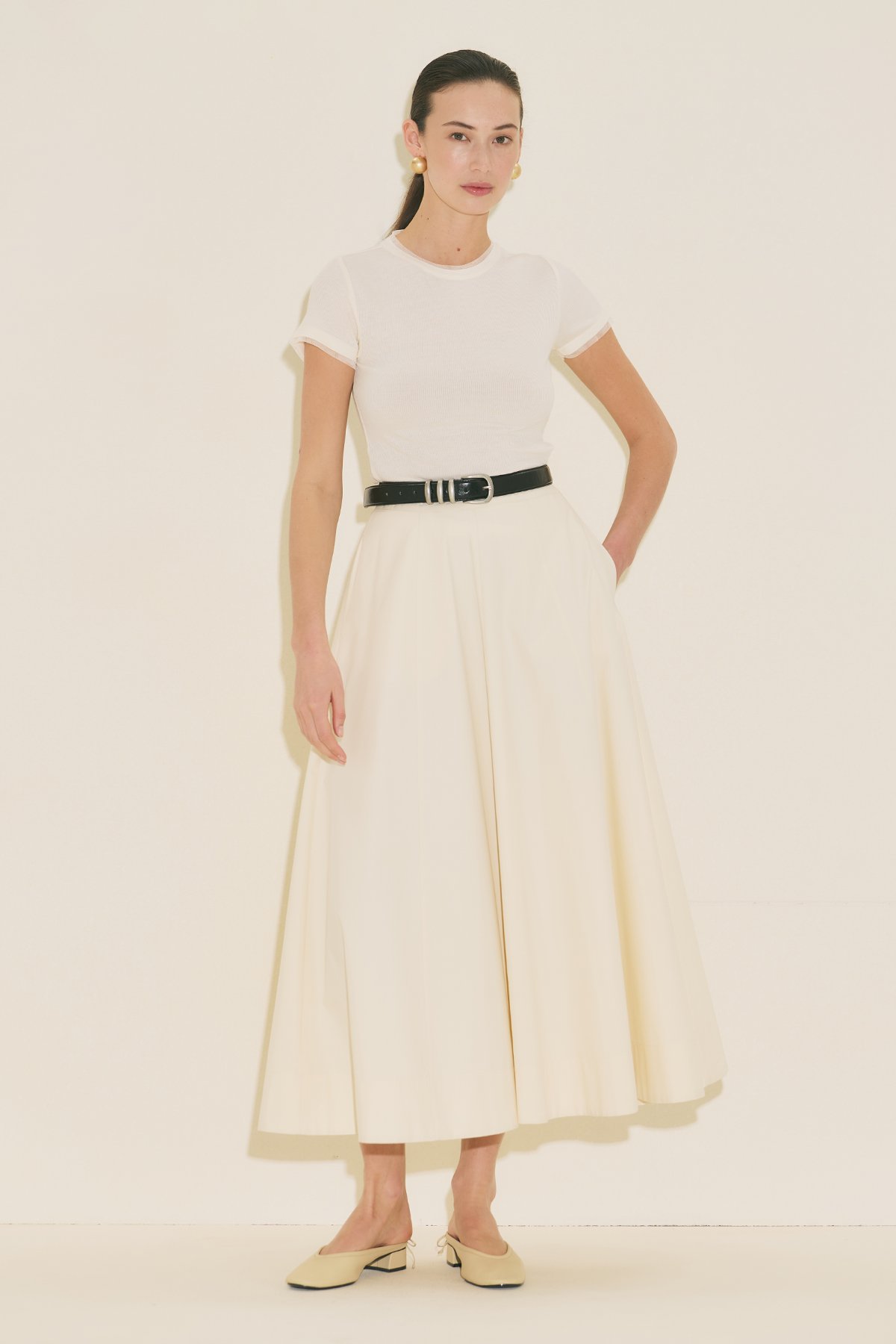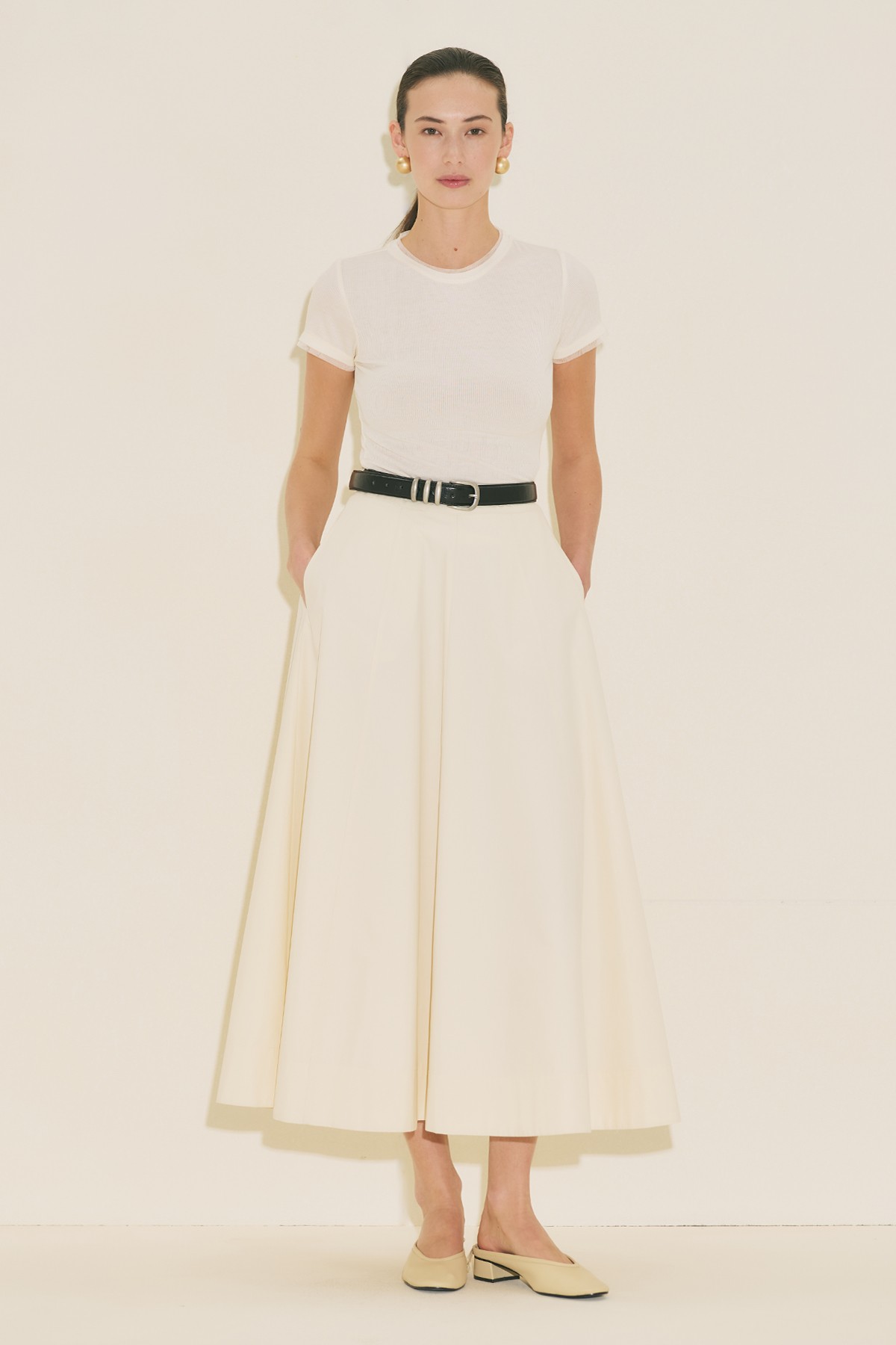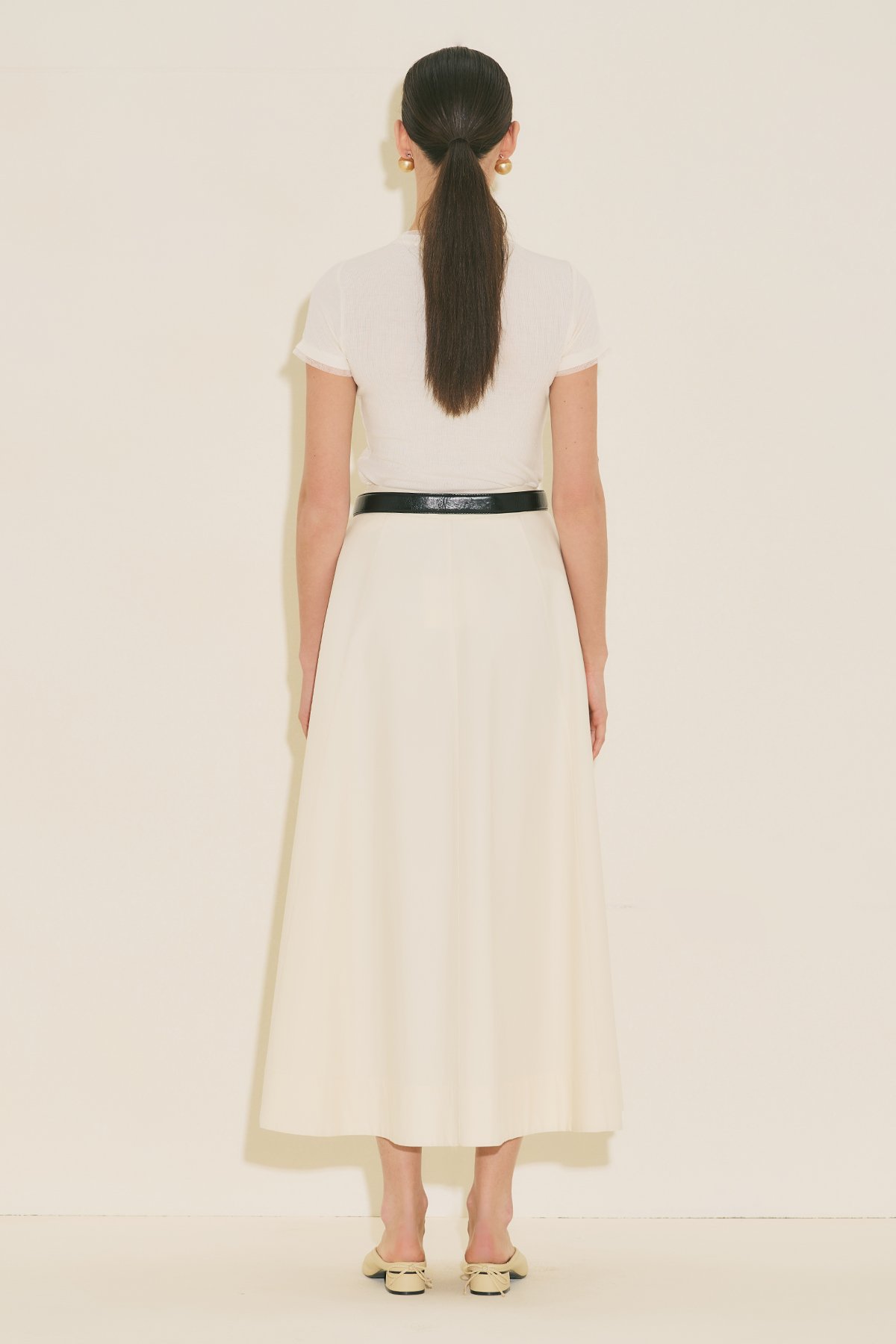 A-line form, bilek boy, yüksek bel, fermuar kapamalı, volan detaylı, cepli.