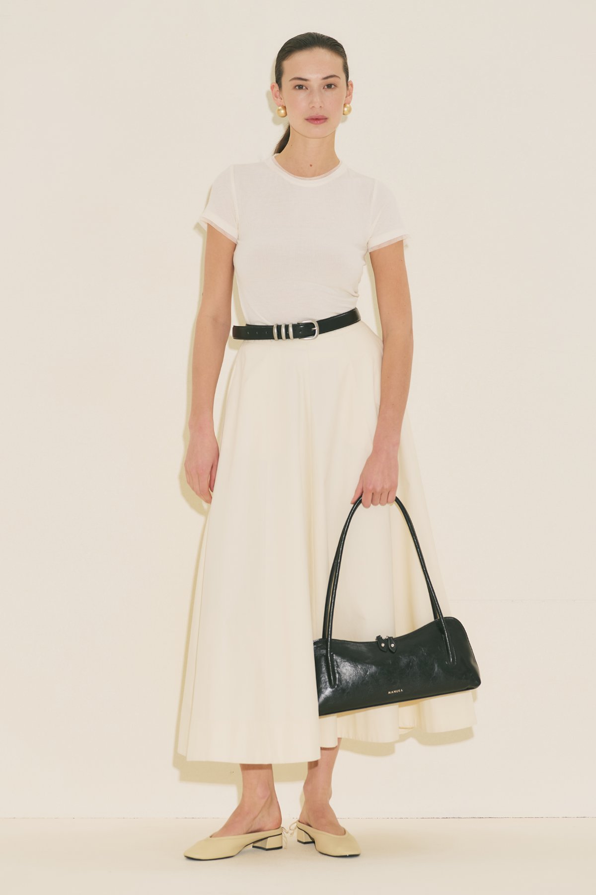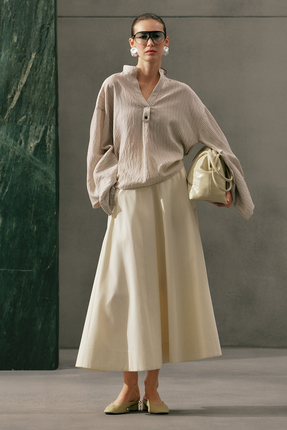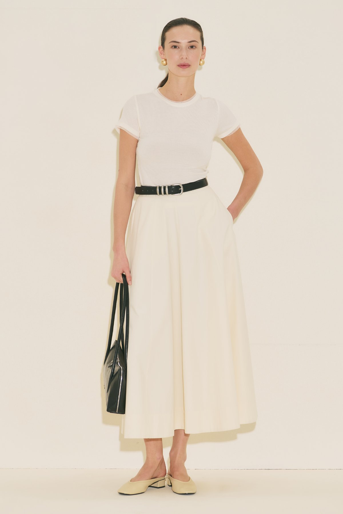 A-line form, bilek boy, yüksek bel, fermuar kapamalı, volan detaylı, cepli.