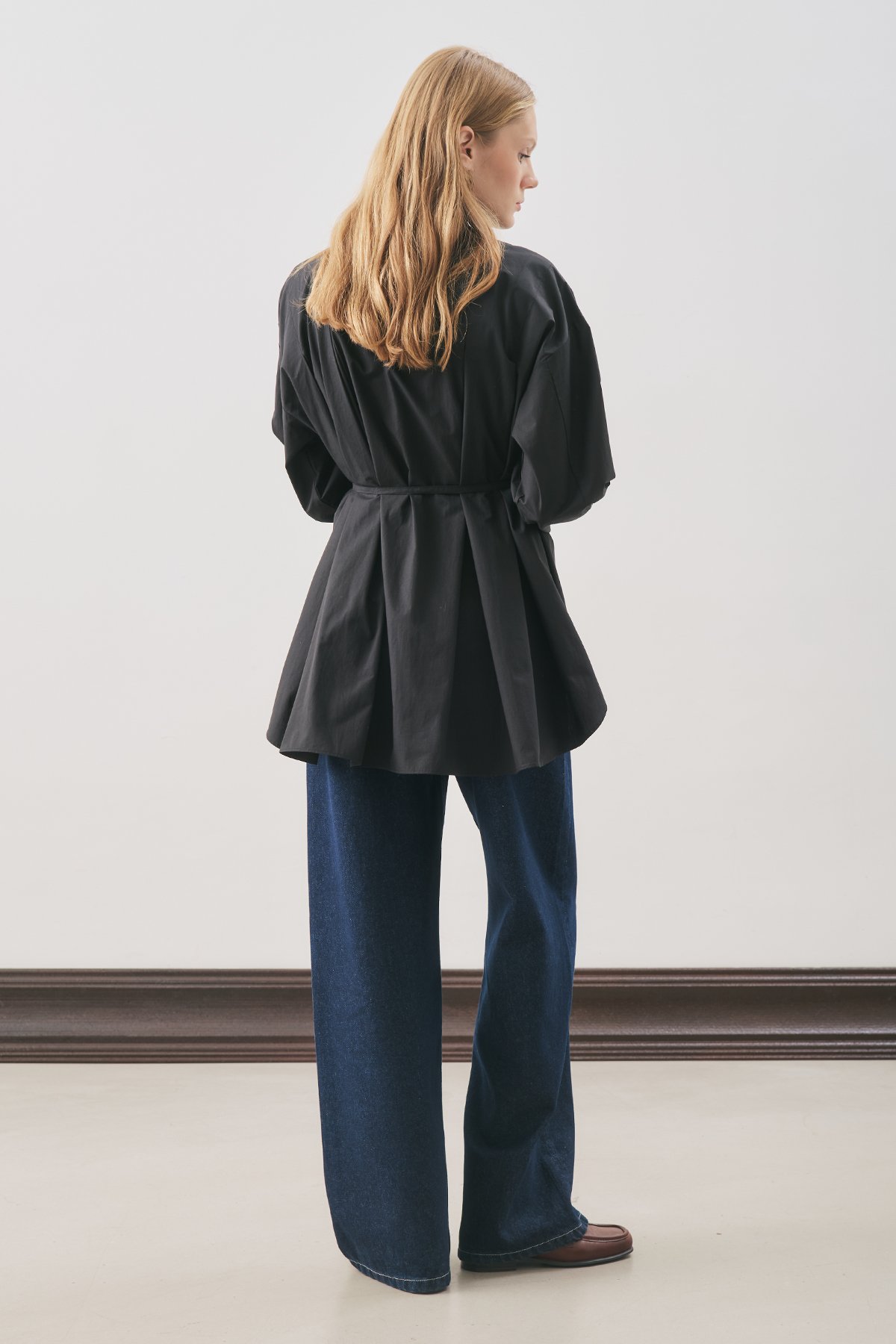 Normal kalıp,gömlek yaka,uzun kol,kuşaklı belde dikiş detaylı,ara boy,düğmeli kapama.Ana Kumaş %100 Pamuk