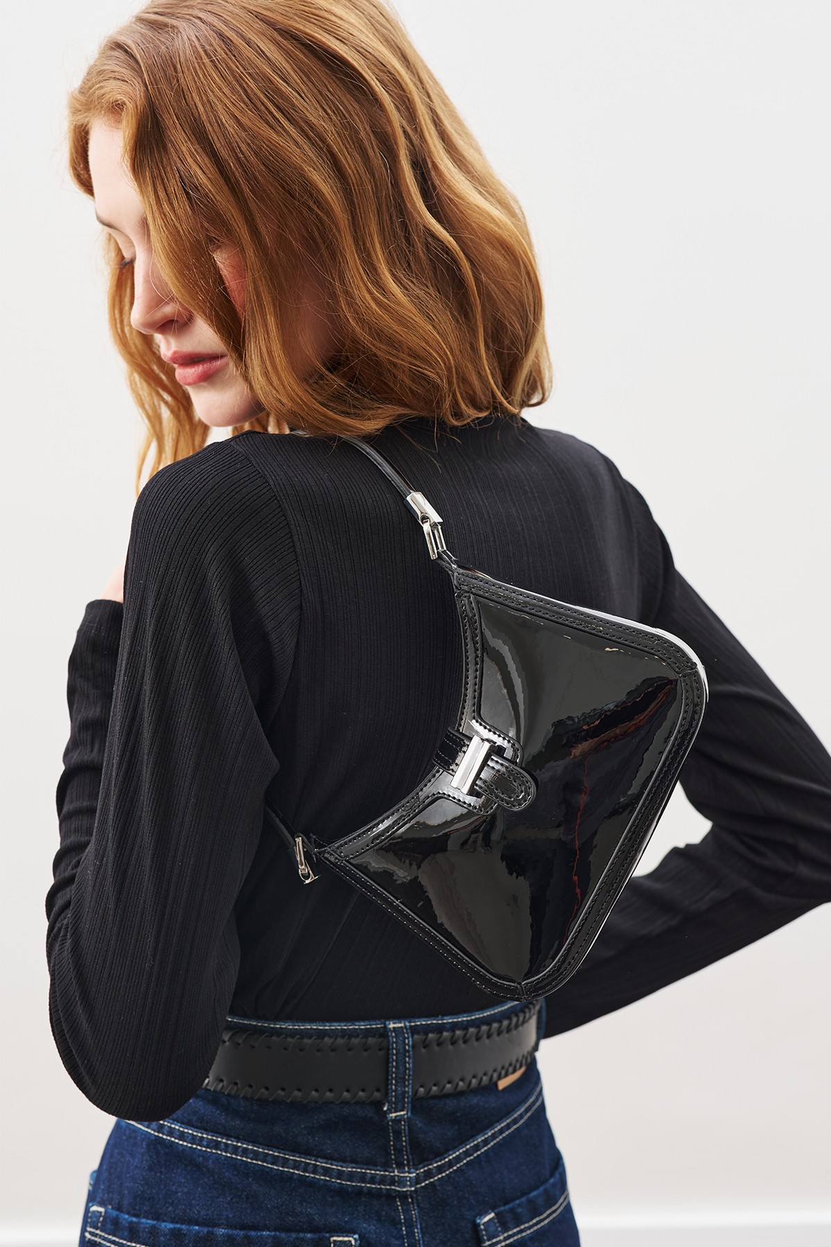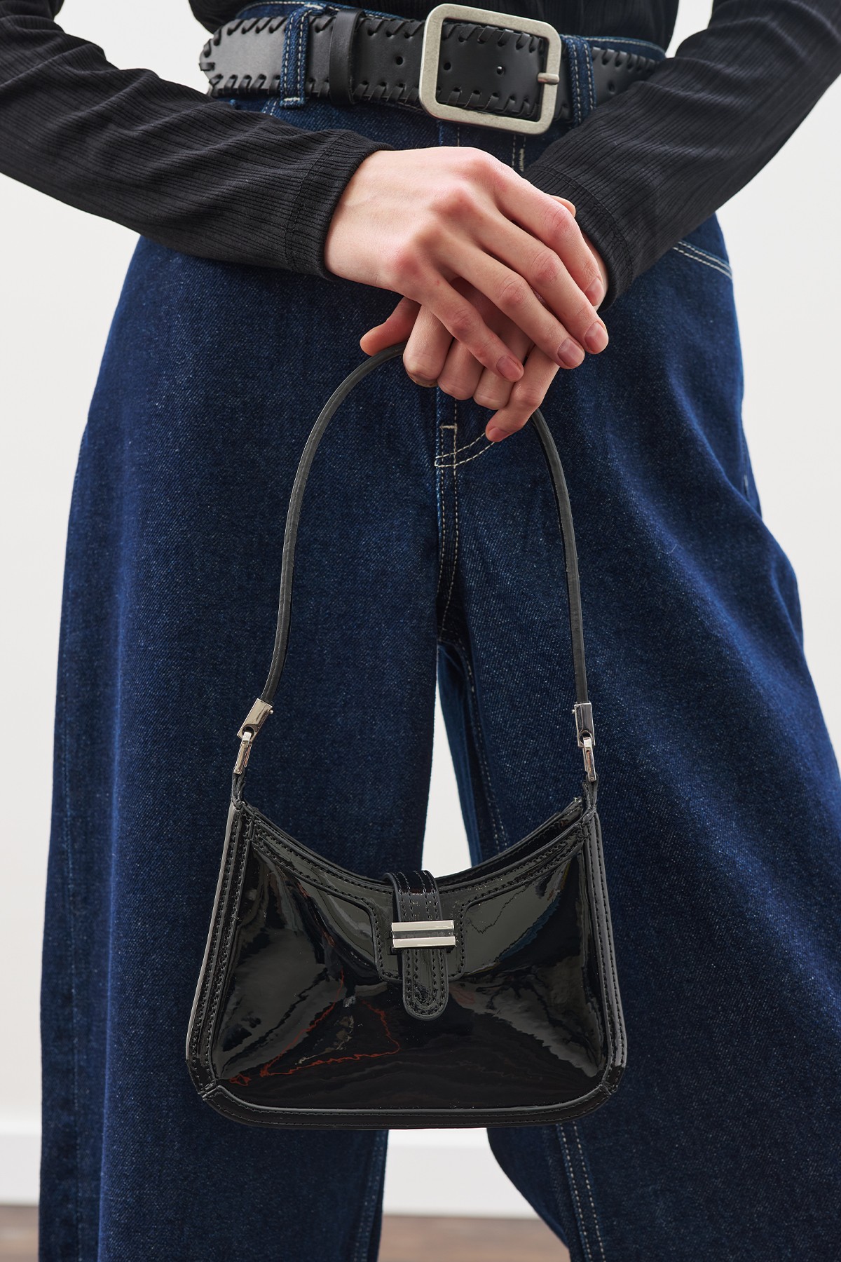 PATENT LEATHER BUCKLE SHOULDER BAG BLACK FEATURES