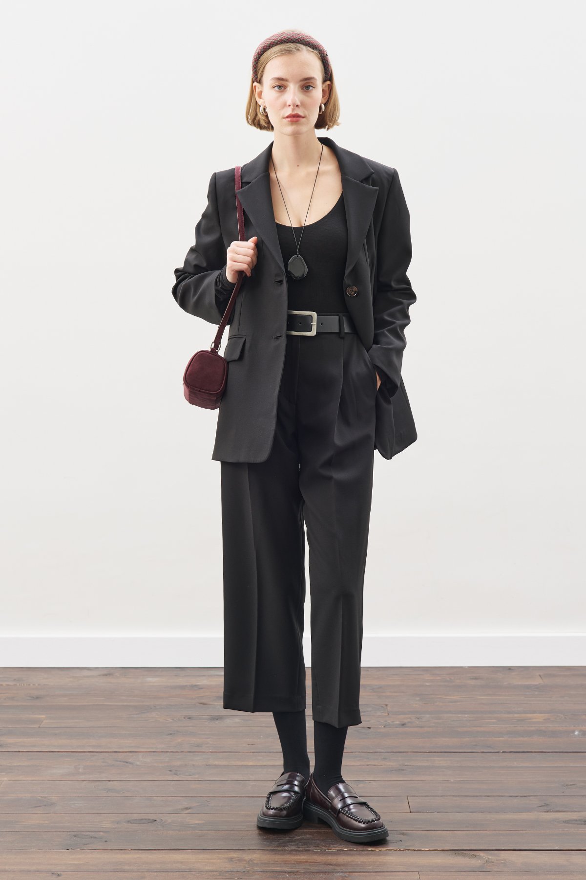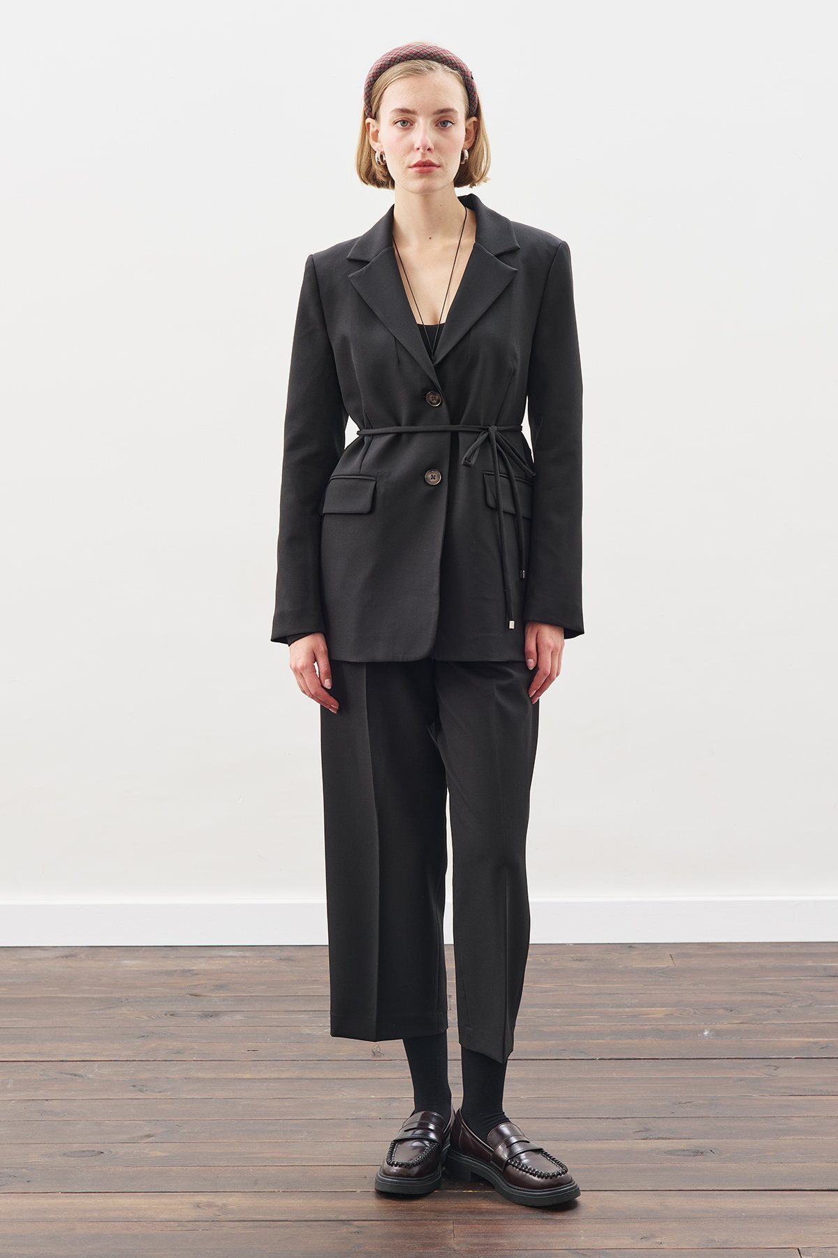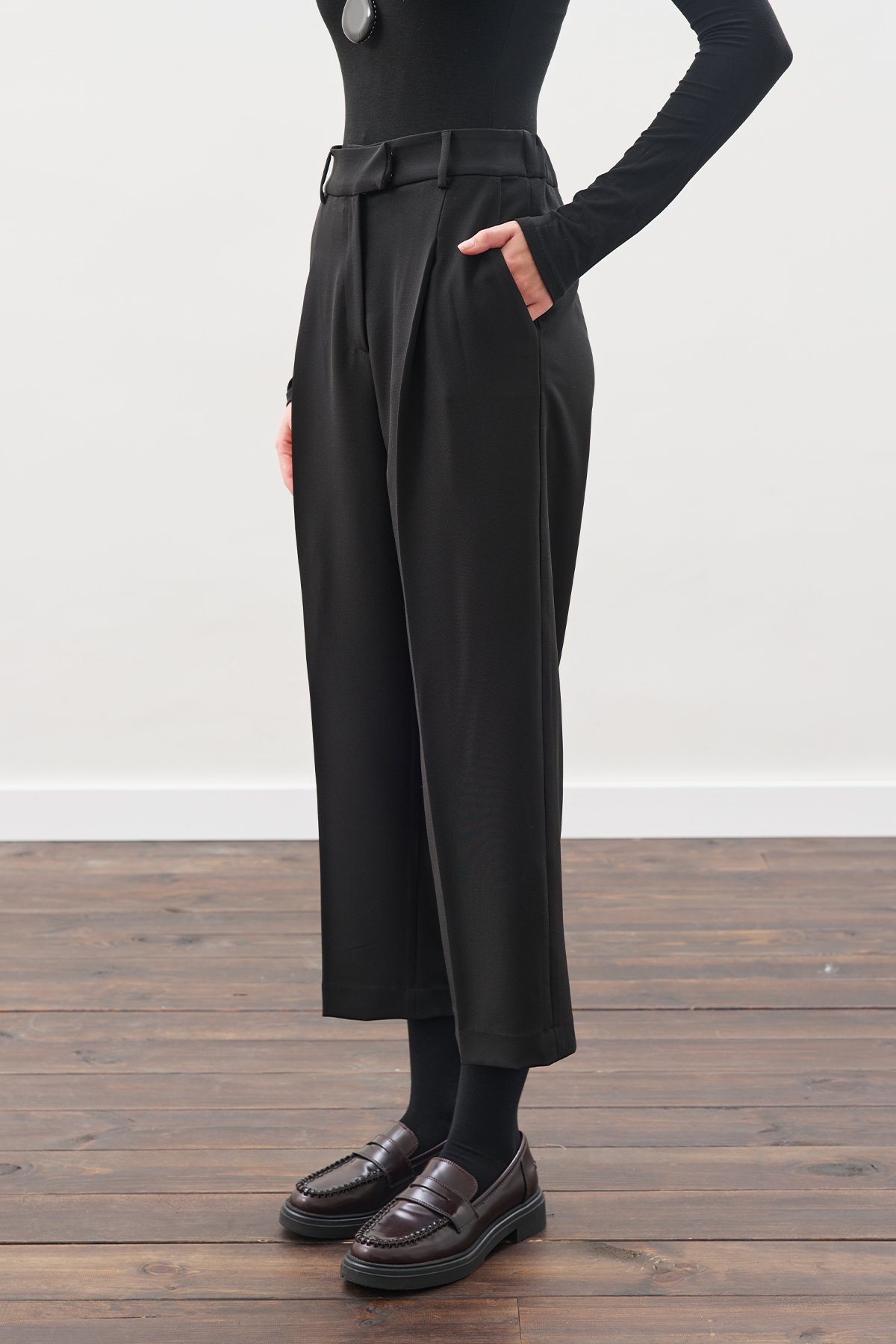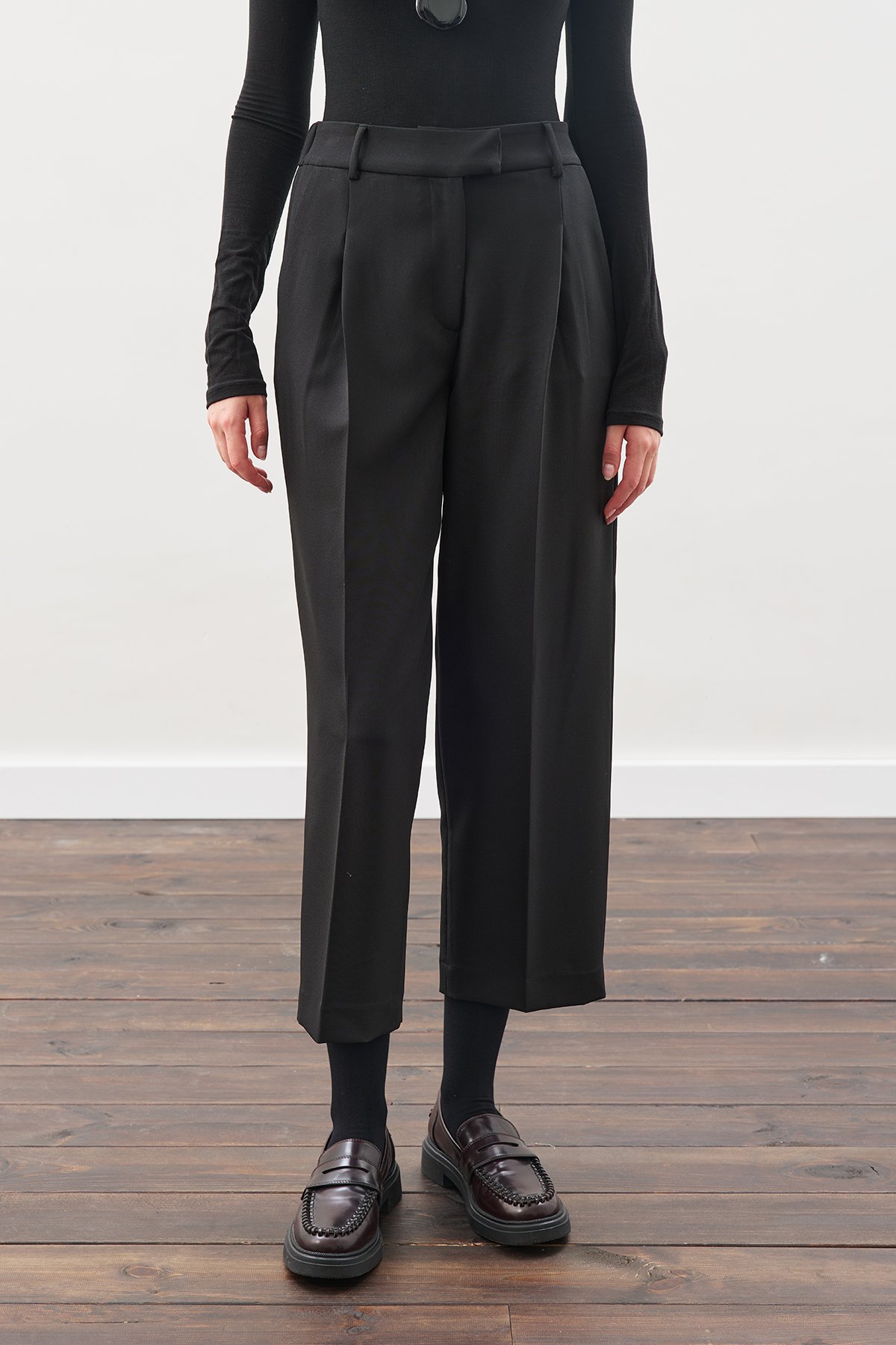 Straight fit, high waist, pleated, elastic back waistband. Main Fabric: 90% Polyester, 10% Elastane Wash inside out Iron inside out Maximum 30°C wash Do not bleach Low temperature ironing Do not dry clean Do not tumble dry.