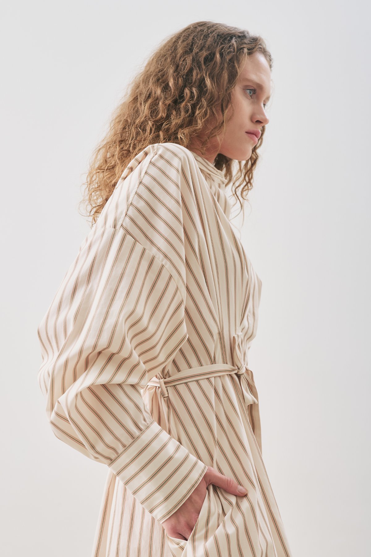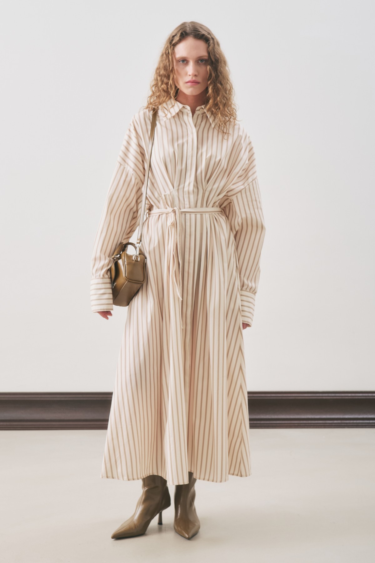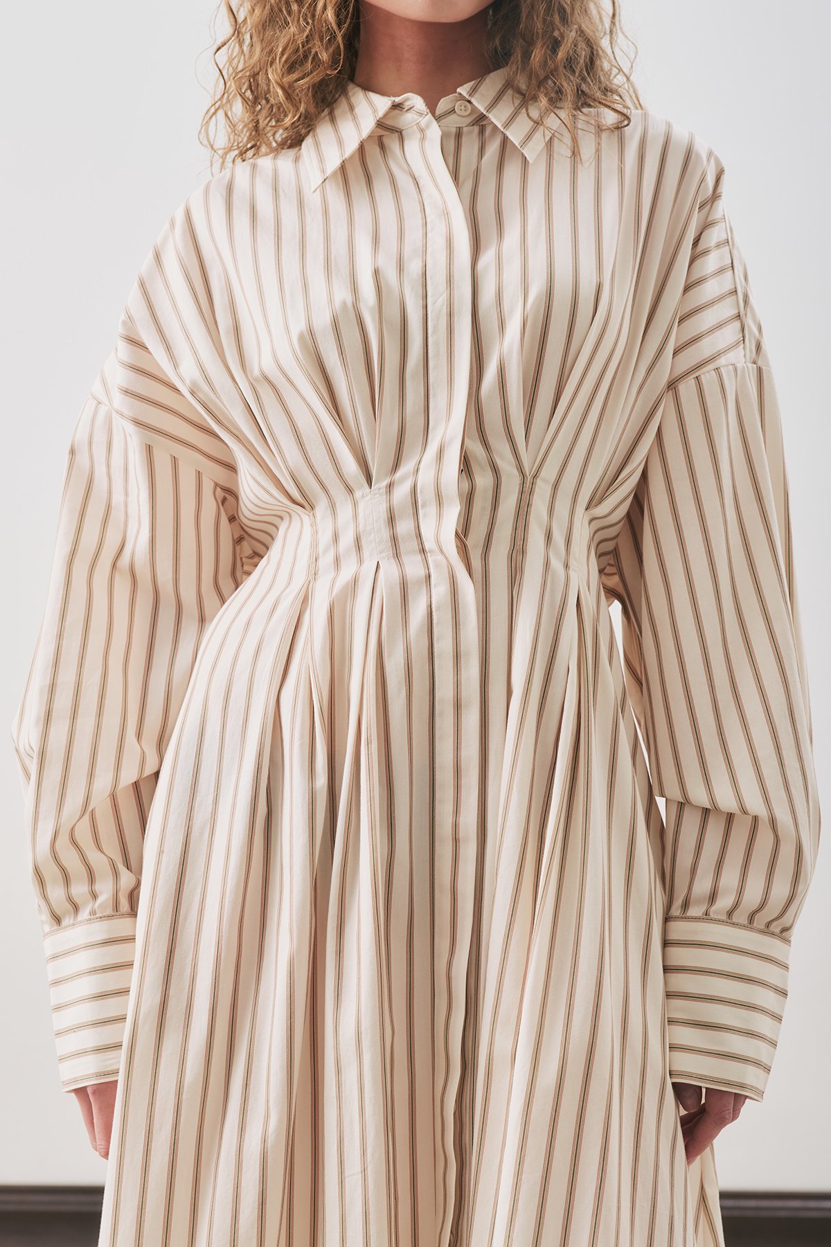 PİLE DETAYLI GÖMLEK ELBİSE BEJ ÇİZGİLİ