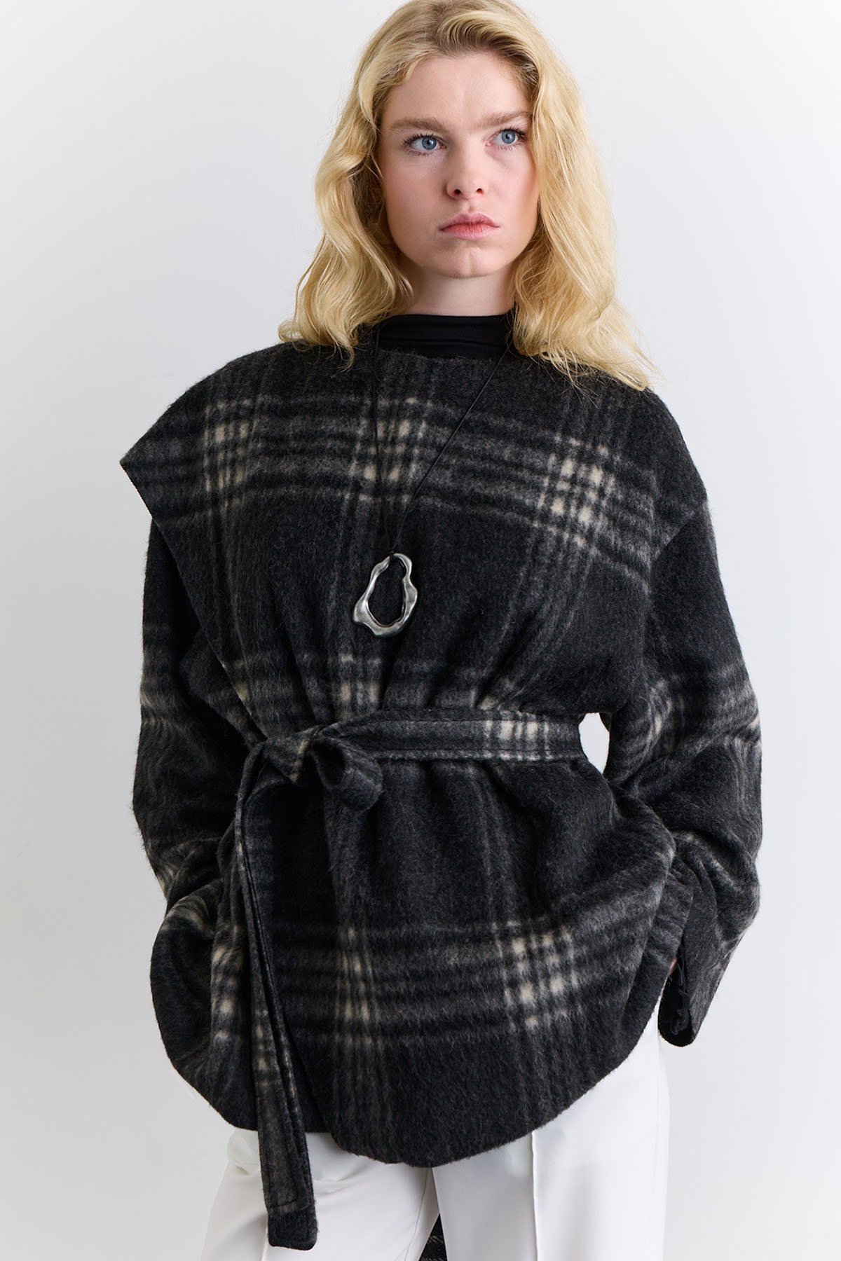 PLAID PONCHO WITH SHAWL DETAIL ANTHRACITE