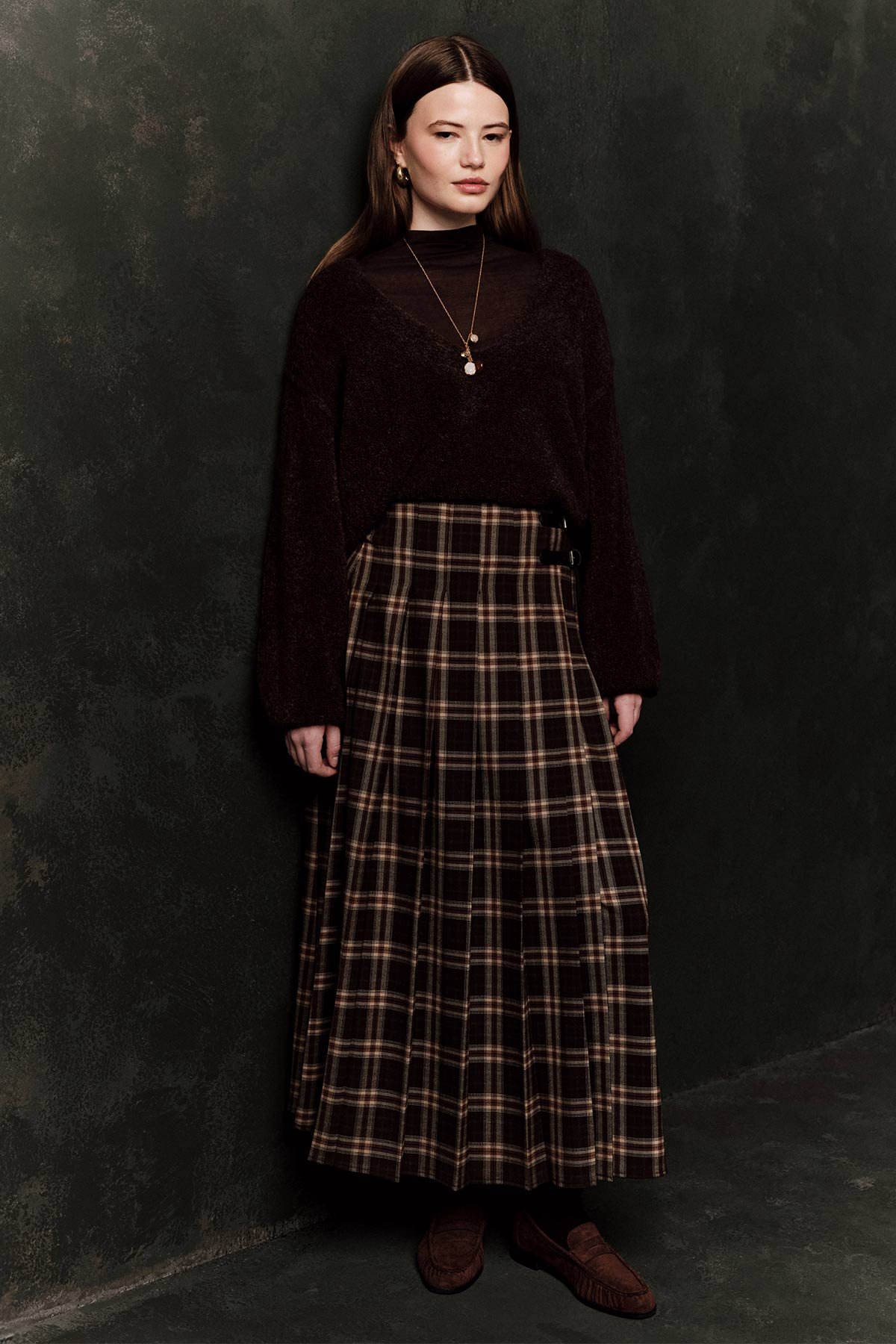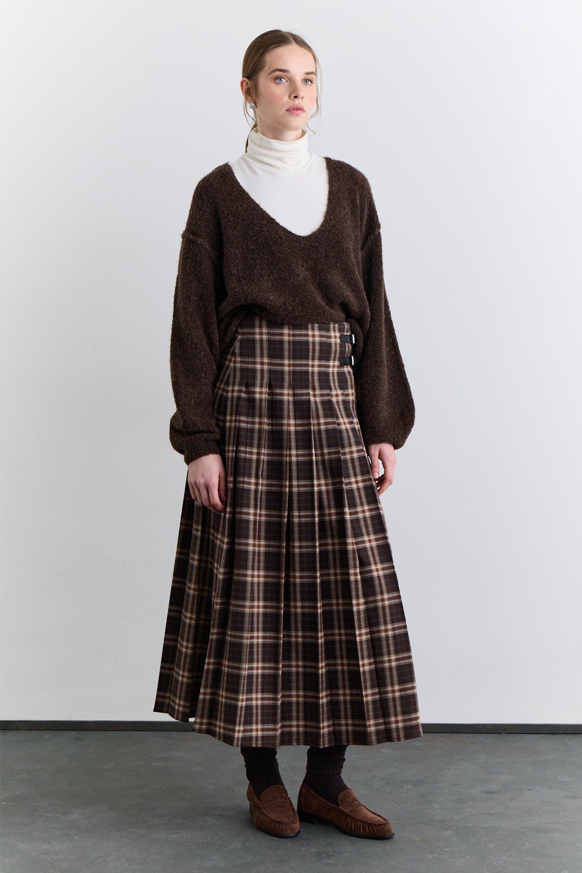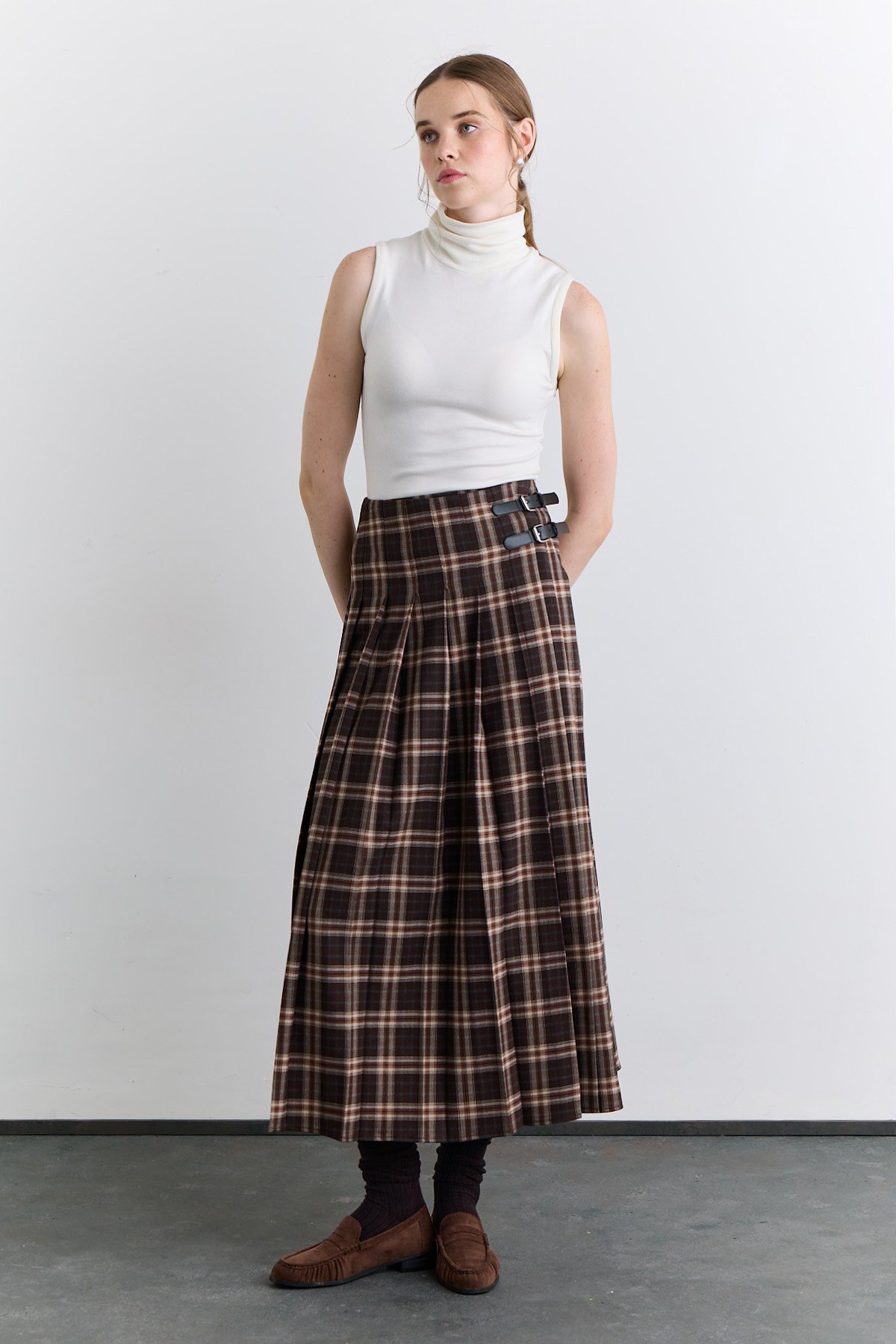 PLEATED BELTED PLAID SKIRT BROWN