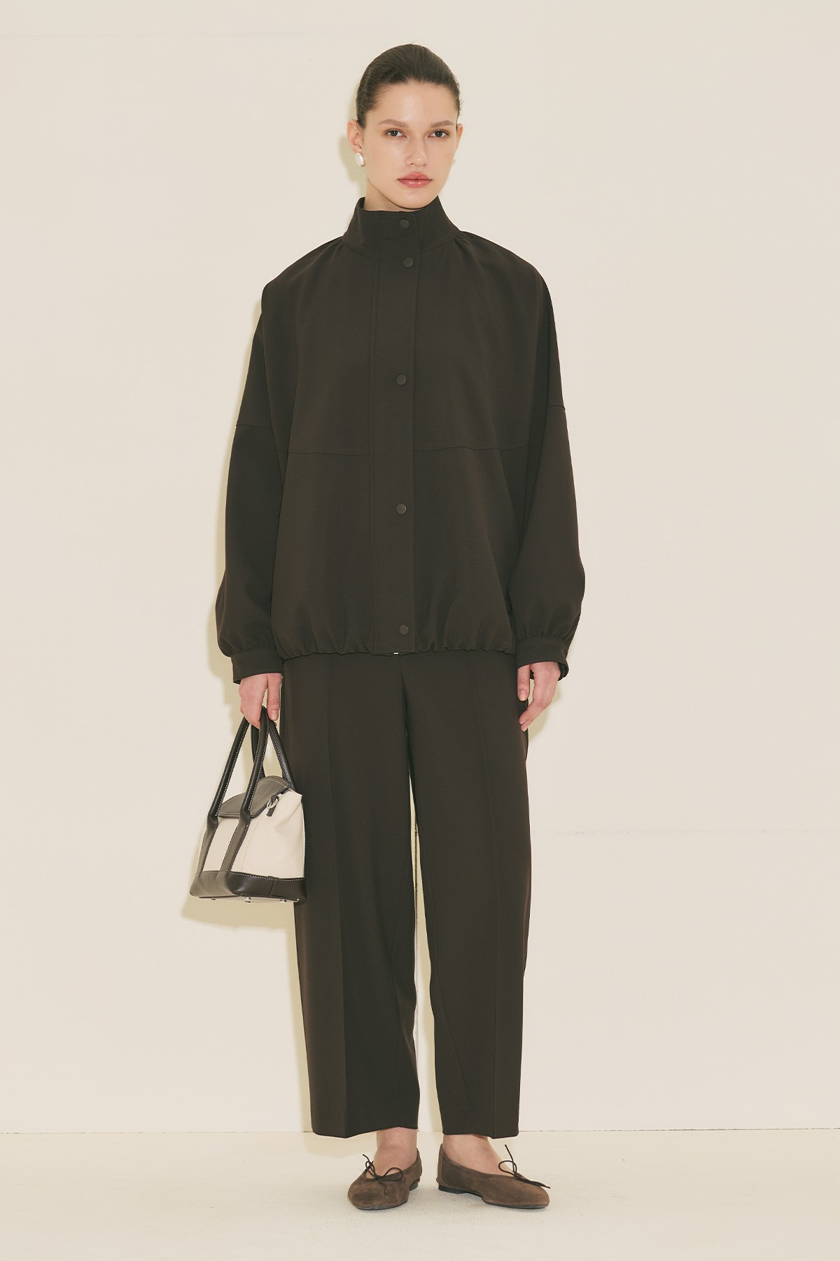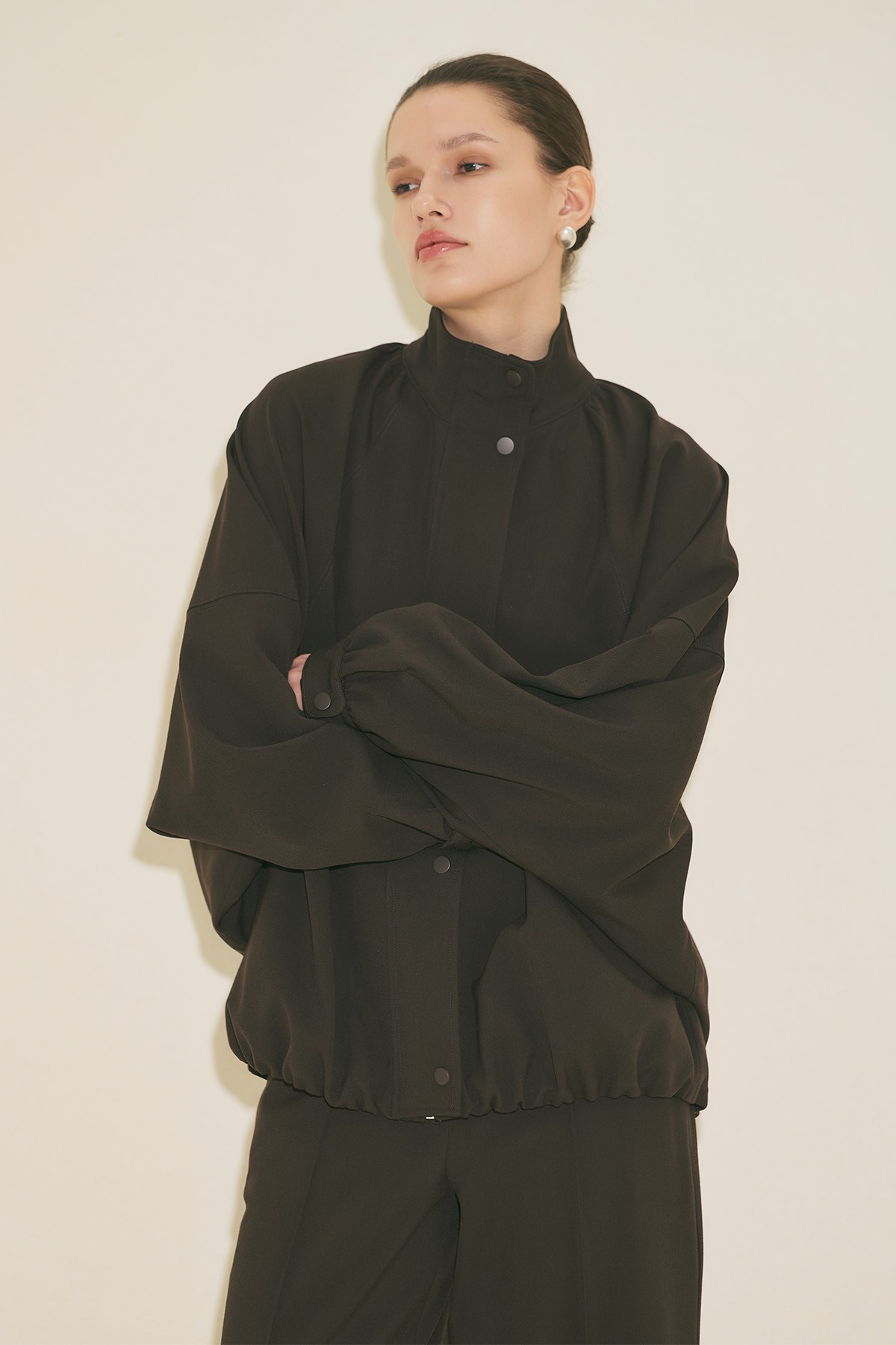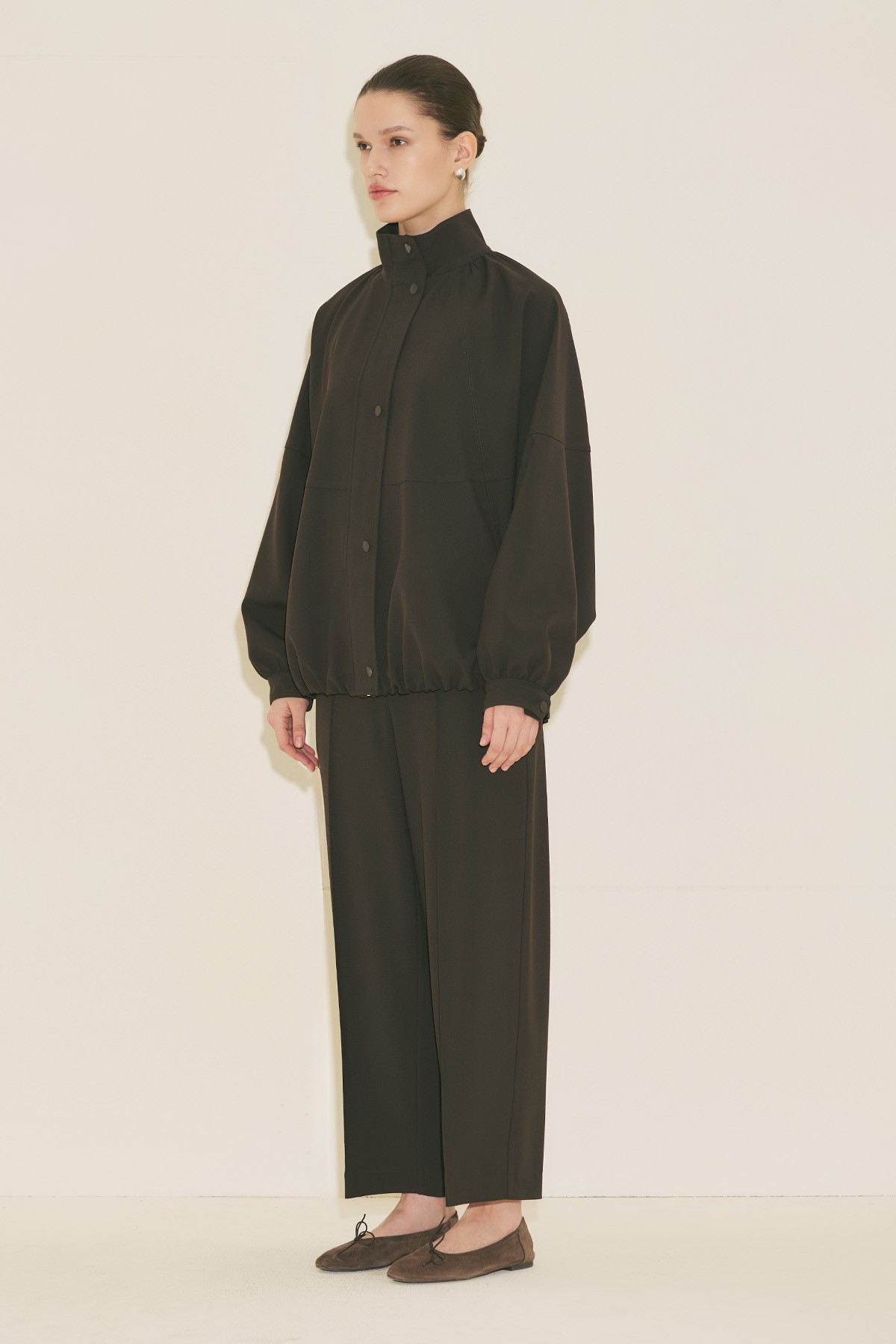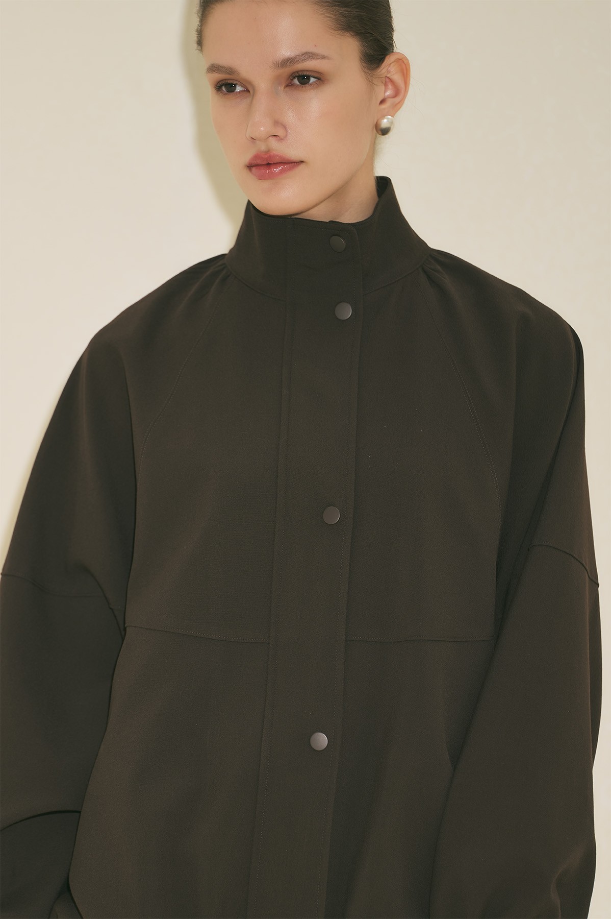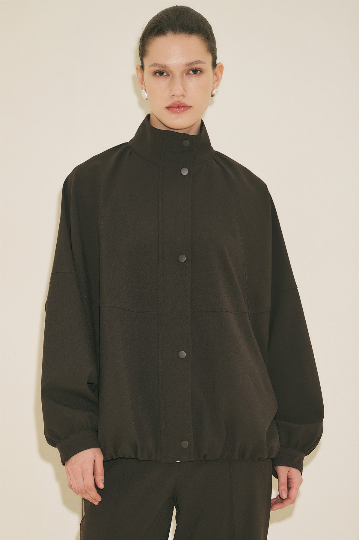 Regular kalıp, yüksek yaka, reglan uzun kol, ara boy, büzgü detaylı, cepli, etek ucu ayarlamalı, fermuar ve çıtçıt kapamalı.