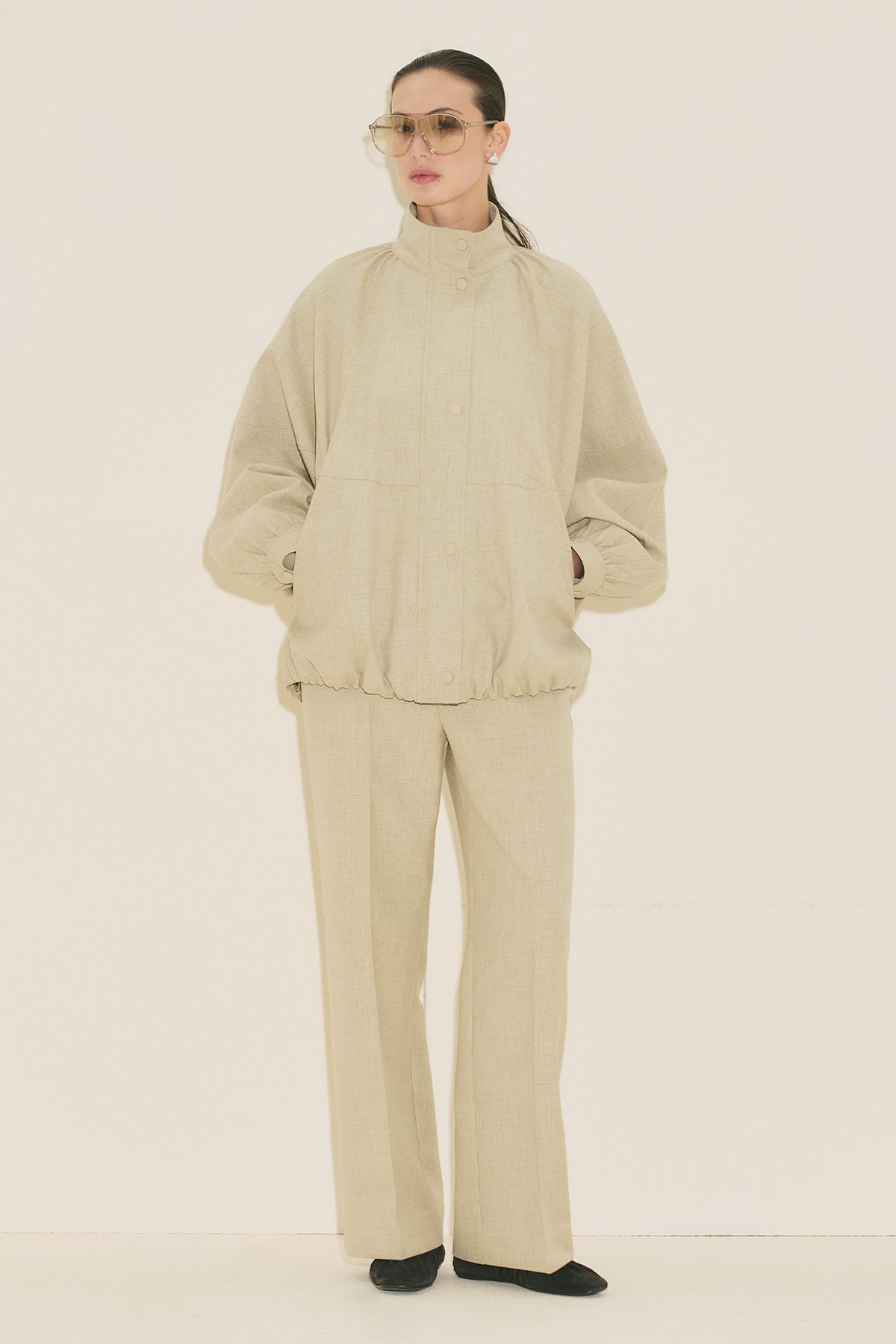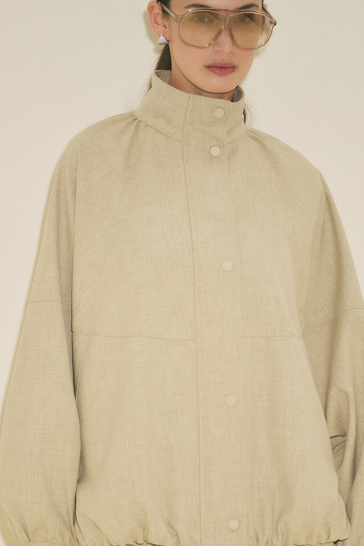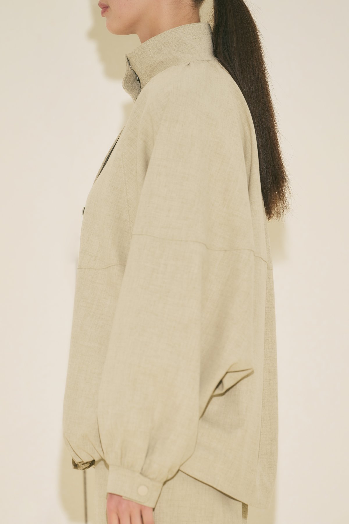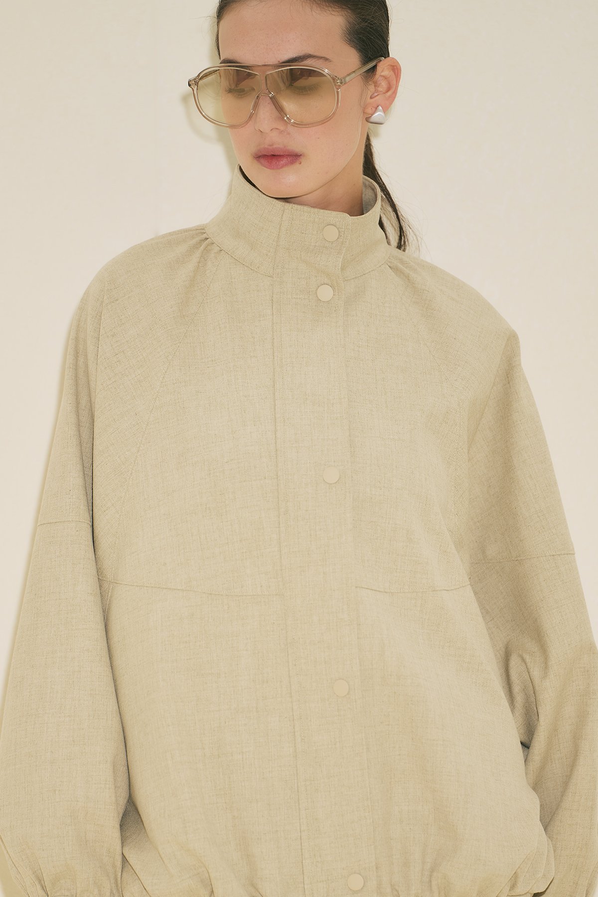 Regular kalıp, yüksek yaka, reglan uzun kol, ara boy, büzgü detaylı, cepli, etek ucu ayarlamalı, fermuar ve çıtçıt kapamalı.