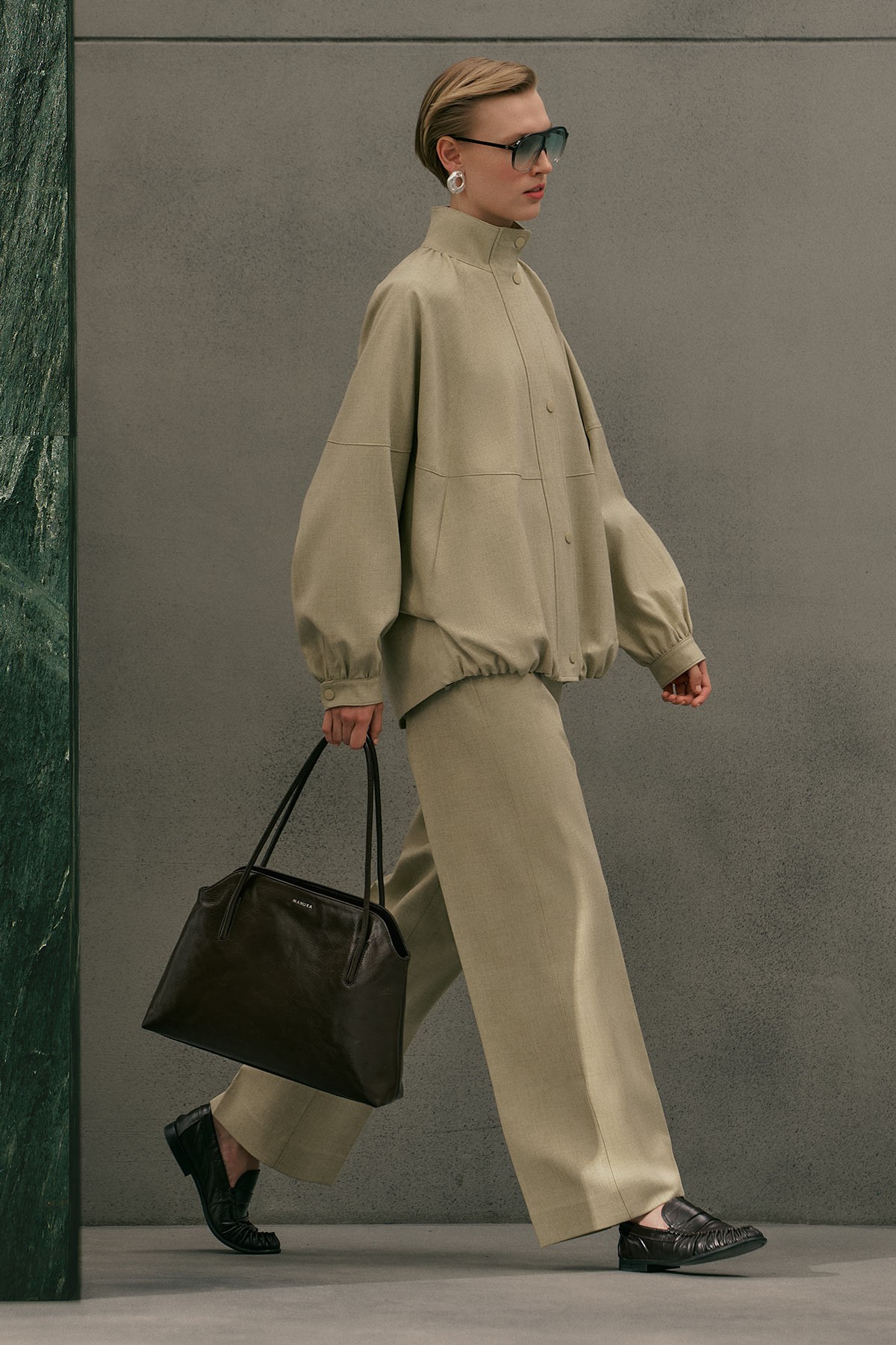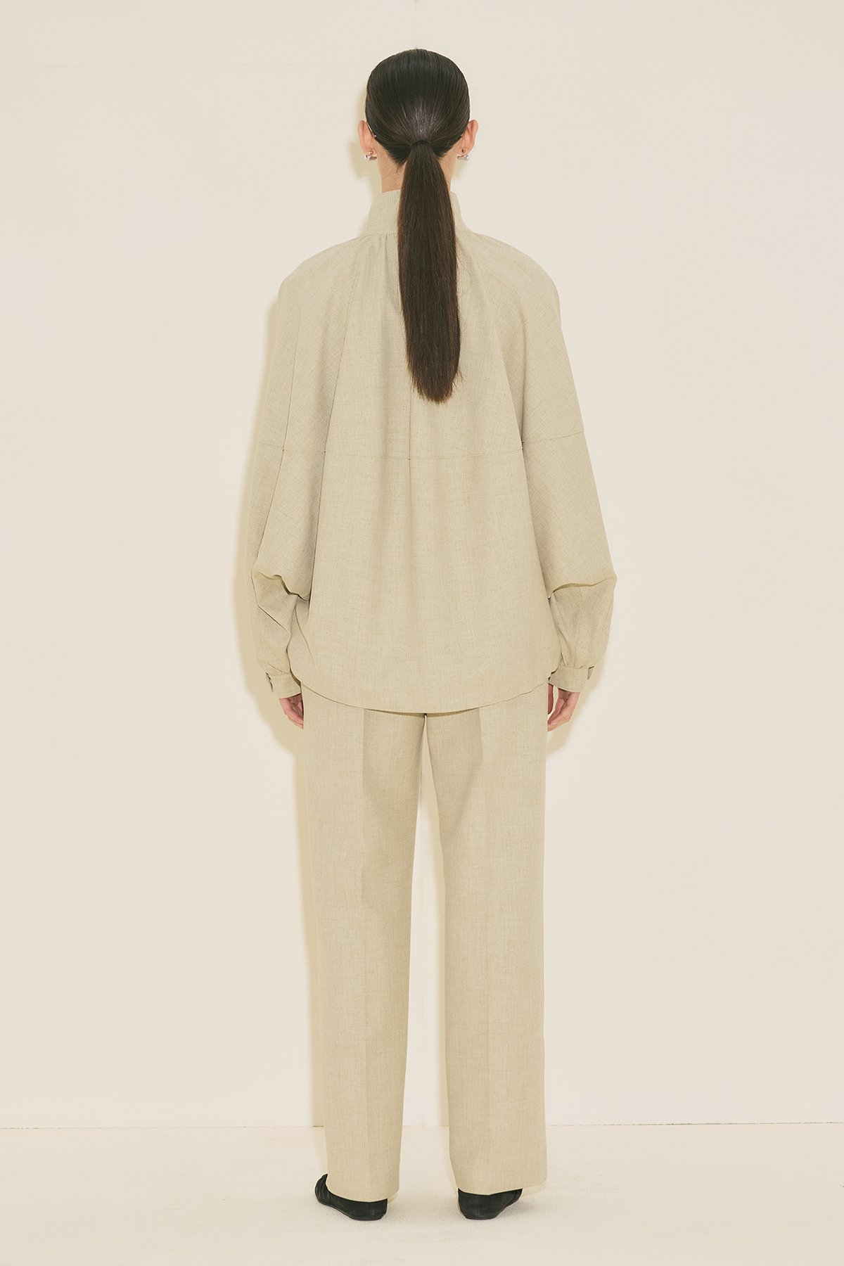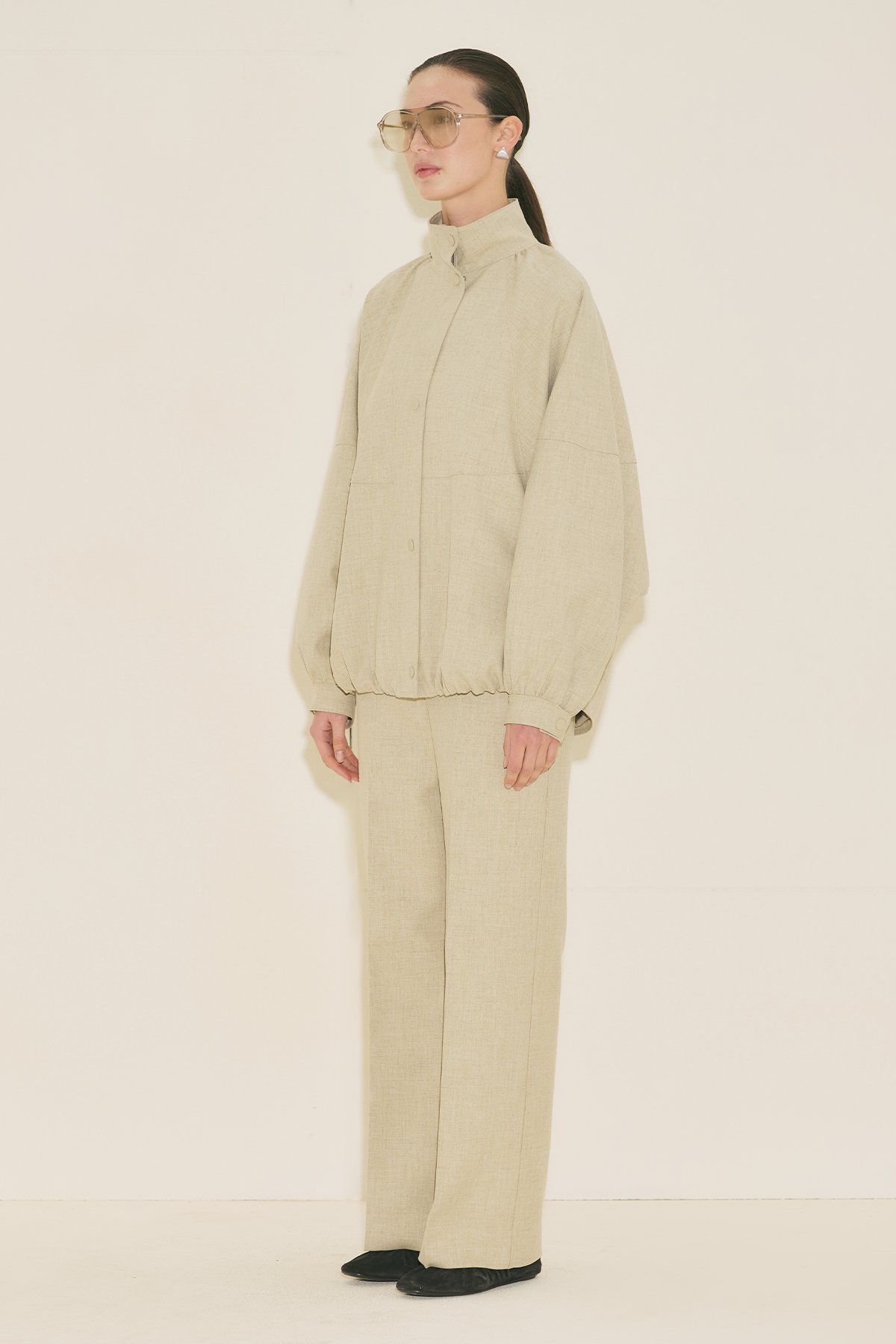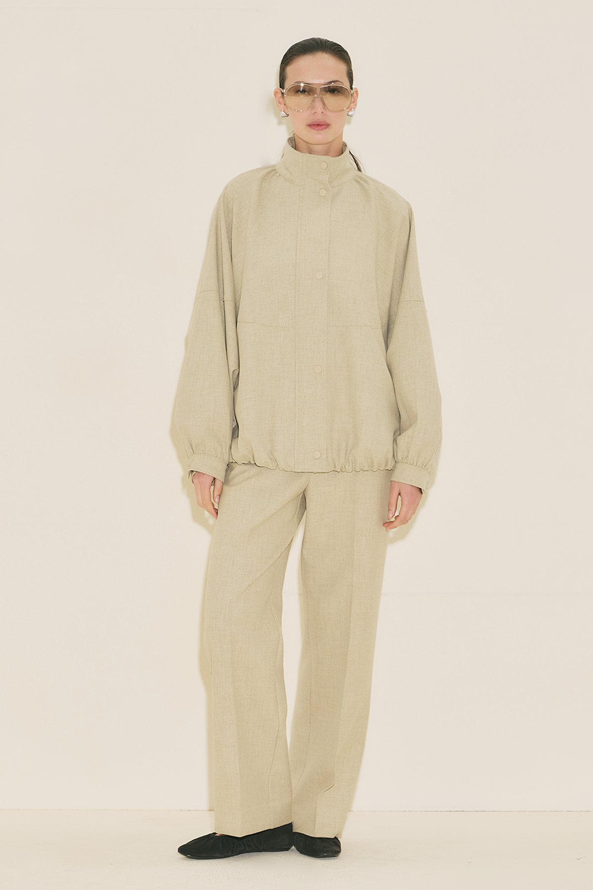 Regular kalıp, yüksek yaka, reglan uzun kol, ara boy, büzgü detaylı, cepli, etek ucu ayarlamalı, fermuar ve çıtçıt kapamalı.