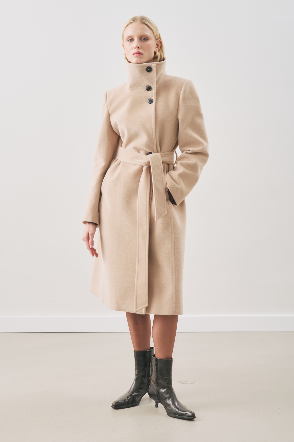 Normal kalıp,yüksek yakalı,beli bağlamalı,kuşak detaylı,uzun kol,diz alt boy,düğme kapamalı.Ana Kumaş: %50 Naylon,% 50 Polyester