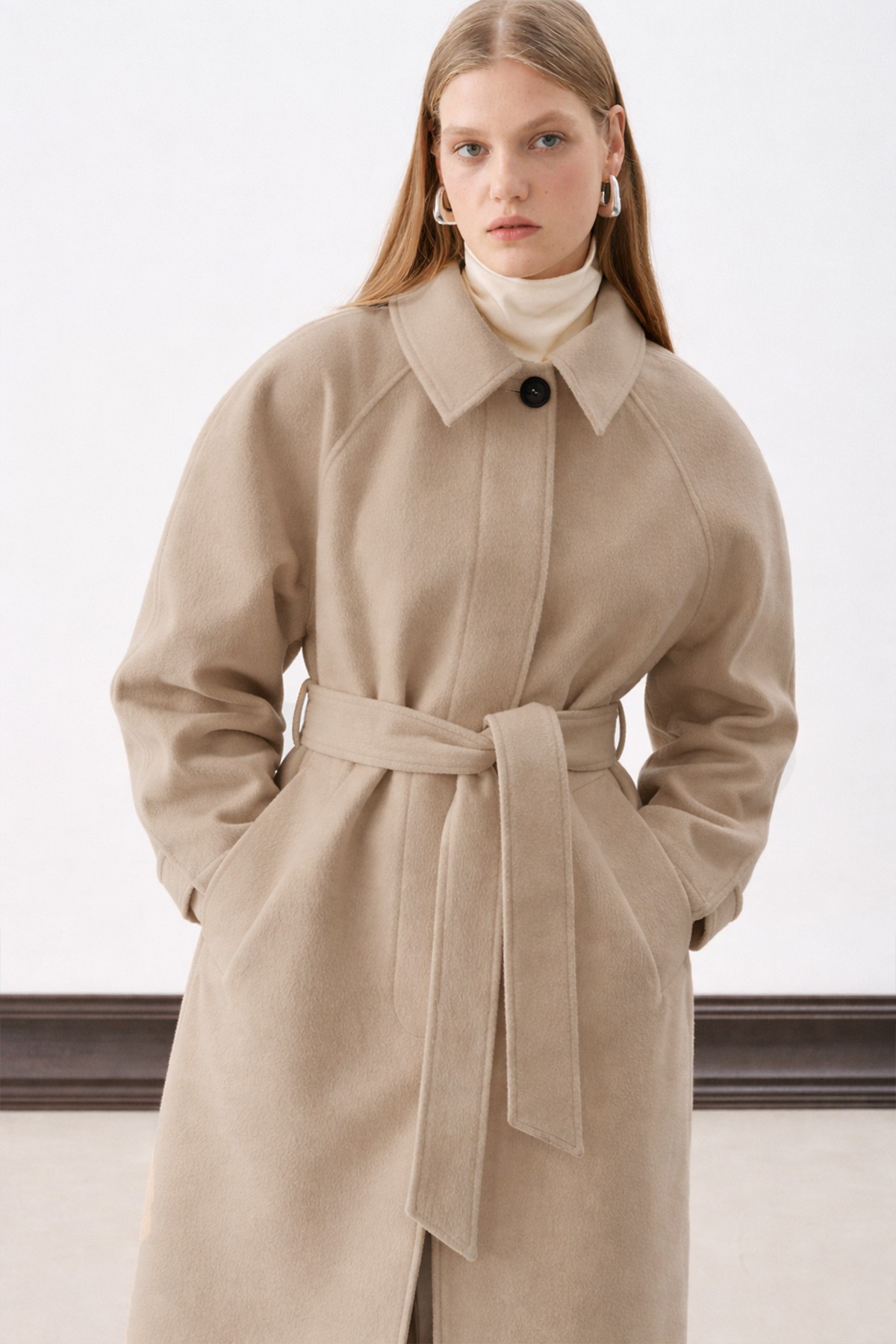 Fit kalıp, gömlek yakalı, uzun kollu, beli kuşaklı, tam boy, gizli düğme kapamalı.